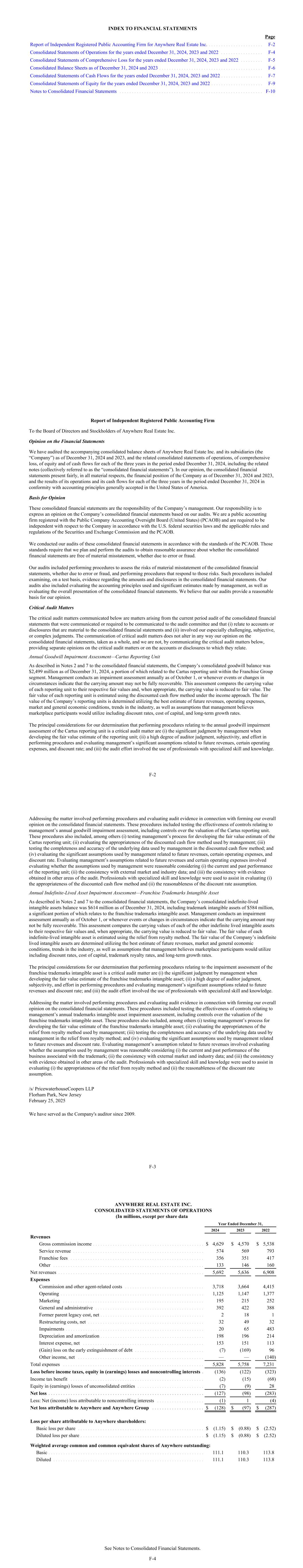 INDEX TO FINANCIAL STATEMENTS Page Report of Independent Registered Public Accounting Firm for Anywhere Real Estate Inc. . . . . . . . . . . . . . . . . . . . . . . F-2 Consolidated Statements of Operations for the years ended December 31, 2024, 2023 and 2022 . . . . . . . . . . . . . . . . . F-4 Consolidated Statements of Comprehensive Loss for the years ended December 31, 2024, 2023 and 2022 . . . . . . . . . F-5 Consolidated Balance Sheets as of December 31, 2024 and 2023 . . . . . . . . . . . . . . . . . . . . . . . . . . . . . . . . . . . . . . . . . . F-6 Consolidated Statements of Cash Flows for the years ended December 31, 2024, 2023 and 2022 . . . . . . . . . . . . . . . . . F-7 Consolidated Statements of Equity for the years ended December 31, 2024, 2023 and 2022 . . . . . . . . . . . . . . . . . . . . . F-9 Notes to Consolidated Financial Statements . . . . . . . . . . . . . . . . . . . . . . . . . . . . . . . . . . . . . . . . . . . . . . . . . . . . . . . . . . F-10 Report of Independent Registered Public Accounting Firm To the Board of Directors and Stockholders of Anywhere Real Estate Inc. Opinion on the Financial Statements We have audited the accompanying consolidated balance sheets of Anywhere Real Estate Inc. and its subsidiaries (the “Company”) as of December 31, 2024 and 2023, and the related consolidated statements of operations, of comprehensive loss, of equity and of cash flows for each of the three years in the period ended December 31, 2024, including the related notes (collectively referred to as the “consolidated financial statements”). In our opinion, the consolidated financial statements present fairly, in all material respects, the financial position of the Company as of December 31, 2024 and 2023, and the results of its operations and its cash flows for each of the three years in the period ended December 31, 2024 in conformity with accounting principles generally accepted in the United States of America. Basis for Opinion These consolidated financial statements are the responsibility of the Company’s management. Our responsibility is to express an opinion on the Company’s consolidated financial statements based on our audits. We are a public accounting firm registered with the Public Company Accounting Oversight Board (United States) (PCAOB) and are required to be independent with respect to the Company in accordance with the U.S. federal securities laws and the applicable rules and regulations of the Securities and Exchange Commission and the PCAOB. We conducted our audits of these consolidated financial statements in accordance with the standards of the PCAOB. Those standards require that we plan and perform the audits to obtain reasonable assurance about whether the consolidated financial statements are free of material misstatement, whether due to error or fraud. Our audits included performing procedures to assess the risks of material misstatement of the consolidated financial statements, whether due to error or fraud, and performing procedures that respond to those risks. Such procedures included examining, on a test basis, evidence regarding the amounts and disclosures in the consolidated financial statements. Our audits also included evaluating the accounting principles used and significant estimates made by management, as well as evaluating the overall presentation of the consolidated financial statements. We believe that our audits provide a reasonable basis for our opinion. Critical Audit Matters The critical audit matters communicated below are matters arising from the current period audit of the consolidated financial statements that were communicated or required to be communicated to the audit committee and that (i) relate to accounts or disclosures that are material to the consolidated financial statements and (ii) involved our especially challenging, subjective, or complex judgments. The communication of critical audit matters does not alter in any way our opinion on the consolidated financial statements, taken as a whole, and we are not, by communicating the critical audit matters below, providing separate opinions on the critical audit matters or on the accounts or disclosures to which they relate. Annual Goodwill Impairment Assessment—Cartus Reporting Unit As described in Notes 2 and 7 to the consolidated financial statements, the Company’s consolidated goodwill balance was $2,499 million as of December 31, 2024, a portion of which related to the Cartus reporting unit within the Franchise Group segment. Management conducts an impairment assessment annually as of October 1, or whenever events or changes in circumstances indicate that the carrying amount may not be fully recoverable. This assessment compares the carrying value of each reporting unit to their respective fair values and, when appropriate, the carrying value is reduced to fair value. The fair value of each reporting unit is estimated using the discounted cash flow method under the income approach. The fair value of the Company’s reporting units is determined utilizing the best estimate of future revenues, operating expenses, market and general economic conditions, trends in the industry, as well as assumptions that management believes marketplace participants would utilize including discount rates, cost of capital, and long-term growth rates. The principal considerations for our determination that performing procedures relating to the annual goodwill impairment assessment of the Cartus reporting unit is a critical audit matter are (i) the significant judgment by management when developing the fair value estimate of the reporting unit; (ii) a high degree of auditor judgment, subjectivity, and effort in performing procedures and evaluating management’s significant assumptions related to future revenues, certain operating expenses, and discount rate; and (iii) the audit effort involved the use of professionals with specialized skill and knowledge. F-2 Addres
