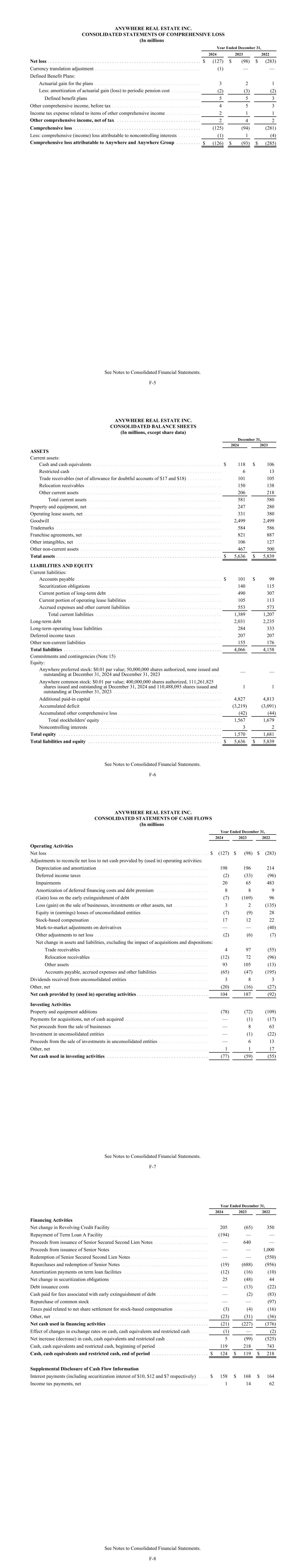 ANYWHERE REAL ESTATE INC. CONSOLIDATED STATEMENTS OF COMPREHENSIVE LOSS (In millions Year Ended December 31, 2024 2023 2022 Net loss . . . . . . . . . . . . . . . . . . . . . . . . . . . . . . . . . . . . . . . . . . . . . . . . . . . . . . . . . . . . . . $ (127) $ (98) $ (283) Currency translation adjustment . . . . . . . . . . . . . . . . . . . . . . . . . . . . . . . . . . . . . . . . . . . (1) — — Defined Benefit Plans: Actuarial gain for the plans . . . . . . . . . . . . . . . . . . . . . . . . . . . . . . . . . . . . . . . . . . . 3 2 1 Less: amortization of actuarial gain (loss) to periodic pension cost . . . . . . . . . . . . (2) (3) (2) Defined benefit plans . . . . . . . . . . . . . . . . . . . . . . . . . . . . . . . . . . . . . . . . . . . . . 5 5 3 Other comprehensive income, before tax . . . . . . . . . . . . . . . . . . . . . . . . . . . . . . . . . . . . 4 5 3 Income tax expense related to items of other comprehensive income . . . . . . . . . . . . . . 2 1 1 Other comprehensive income, net of tax . . . . . . . . . . . . . . . . . . . . . . . . . . . . . . . . . . 2 4 2 Comprehensive loss . . . . . . . . . . . . . . . . . . . . . . . . . . . . . . . . . . . . . . . . . . . . . . . . . . . (125) (94) (281) Less: comprehensive (income) loss attributable to noncontrolling interests . . . . . . . . . (1) 1 (4) Comprehensive loss attributable to Anywhere and Anywhere Group . . . . . . . . . . $ (126) $ (93) $ (285) See Notes to Consolidated Financial Statements. F-5 ANYWHERE REAL ESTATE INC. CONSOLIDATED BALANCE SHEETS (In millions, except share data) December 31, 2024 2023 ASSETS Current assets: Cash and cash equivalents . . . . . . . . . . . . . . . . . . . . . . . . . . . . . . . . . . . . . . . . . . . . . . . . . . . . $ 118 $ 106 Restricted cash . . . . . . . . . . . . . . . . . . . . . . . . . . . . . . . . . . . . . . . . . . . . . . . . . . . . . . . . . . . . . 6 13 Trade receivables (net of allowance for doubtful accounts of $17 and $18) . . . . . . . . . . . . . . 101 105 Relocation receivables . . . . . . . . . . . . . . . . . . . . . . . . . . . . . . . . . . . . . . . . . . . . . . . . . . . . . . . 150 138 Other current assets . . . . . . . . . . . . . . . . . . . . . . . . . . . . . . . . . . . . . . . . . . . . . . . . . . . . . . . . . 206 218 Total current assets . . . . . . . . . . . . . . . . . . . . . . . . . . . . . . . . . . . . . . . . . . . . . . . . . . . . . . 581 580 Property and equipment, net . . . . . . . . . . . . . . . . . . . . . . . . . . . . . . . . . . . . . . . . . . . . . . . . . . . . . . 247 280 Operating lease assets, net . . . . . . . . . . . . . . . . . . . . . . . . . . . . . . . . . . . . . . . . . . . . . . . . . . . . . . . . 331 380 Goodwill . . . . . . . . . . . . . . . . . . . . . . . . . . . . . . . . . . . . . . . . . . . . . . . . . . . . . . . . . . . . . . . . . . . . . 2,499 2,499 Trademarks . . . . . . . . . . . . . . . . . . . . . . . . . . . . . . . . . . . . . . . . . . . . . . . . . . . . . . . . . . . . . . . . . . . 584 586 Franchise agreements, net . . . . . . . . . . . . . . . . . . . . . . . . . . . . . . . . . . . . . . . . . . . . . . . . . . . . . . . . 821 887 Other intangibles, net . . . . . . . . . . . . . . . . . . . . . . . . . . . . . . . . . . . . . . . . . . . . . . . . . . . . . . . . . . . 106 127 Other non-current assets . . . . . . . . . . . . . . . . . . . . . . . . . . . . . . . . . . . . . . . . . . . . . . . . . . . . . . . . . 467 500 Total assets . . . . . . . . . . . . . . . . . . . . . . . . . . . . . . . . . . . . . . . . . . . . . . . . . . . . . . . . . . . . . . . . . . . $ 5,636 $ 5,839 LIABILITIES AND EQUITY Current liabilities: Accounts payable . . . . . . . . . . . . . . . . . . . . . . . . . . . . . . . . . . . . . . . . . . . . . . . . . . . . . . . . . . . $ 101 $ 99 Securitization obligations . . . . . . . . . . . . . . . . . . . . . . . . . . . . . . . . . . . . . . . . . . . . . . . . . . . . . 140 115 Current portion of long-term debt . . . . . . . . . . . . . . . . . . . . . . . . . . . . . . . . . . . . . . . . . . . . . . 490 307 Current portion of operating lease liabilities . . . . . . . . . . . . . . . . . . . . . . . . . . . . . . . . . . . . . . 105 113 Accrued expenses and other current liabilities . . . . . . . . . . . . . . . . . . . . . . . . . . . . . . . . . . . . 553 573 Total current liabilities . . . . . . . . . . . . . . . . . . . . . . . . . . . . . . . . . . . . . . . . . . . . . . . . . . . 1,389 1,207 Long-term debt . . . . . . . . . . . . . . . . . . . . . . . . . . . . . . . . . . . . . . . . . . . . . . . . . . . . . . . . . . . . . . . . 2,031 2,235 Long-term operating lease liabilities . . . . . . . . . . . . . . . . . . . . . . . . . . . . . . . . . . . . . . . . . . . . . . . . 284 333 Deferred income taxes . . . . . . . . . . . . . . . . . . . . . . . . . . . . . . . . . . . . . . . . . . . . . . . . . . . . . . . . . . . 207 207 Other non-current liabilities . . . . . . . . . . . . . . . . . . . . . . . . . . . . . . . . . . . . . . . . . . . . . . . . . . . . . . 155 176 Total liabilities . . . . . . . . . . . . . . . . . . . . . . . . . . . . . . . . . . . . . . . . . . . . . . . . . . . . . . . . . . . . . . . . 4,066 4,158 Commitments and contingencies (Note 15) Equity: Anywhere preferred stock: $0.01 par value; 50,000,000 shares authorized, none issued and outstanding at December 31, 2024 and December 31, 2023 . . . . . . . . . . . . . . . . . . . . . . . . — — Anywhere common stock: $0.01 par value; 400,000,000 shares authorized, 111,261,825 shares issued and outstanding at December 31, 2024 and 110,488,093 shares issued and outstanding at December 31, 2023 . . . . . . . . . . . . . . . . . . . . . . . . . . . . . . . . . . . . . . . . . . . . 1 1 Additional paid-in capital . . . . . . . . . . . . . . . . . . . . . . . . . . . . . . . . . . . . . . . . . . . . . . . . . . . . 4,827 4,813 Accumulated deficit . . . . . . . . . . 