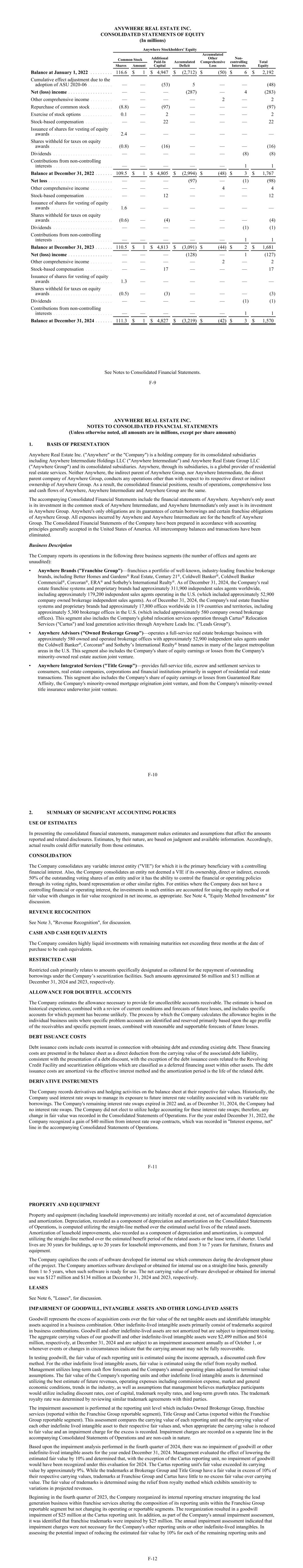 ANYWHERE REAL ESTATE INC. CONSOLIDATED STATEMENTS OF EQUITY (In millions) Anywhere Stockholders' Equity Common Stock Additional Paid-In Capital Accumulated Deficit Accumulated Other Comprehensive Loss Non- controlling Interests Total EquityShares Amount Balance at January 1, 2022 . . . . . . . . . 116.6 $ 1 $ 4,947 $ (2,712) $ (50) $ 6 $ 2,192 Cumulative effect adjustment due to the adoption of ASU 2020-06 . . . . . . . . . . — — (53) 5 — — (48) Net (loss) income . . . . . . . . . . . . . . . . . . — — — (287) — 4 (283) Other comprehensive income . . . . . . . . . — — — — 2 — 2 Repurchase of common stock . . . . . . . . . (8.8) — (97) — — — (97) Exercise of stock options . . . . . . . . . . . . 0.1 — 2 — — — 2 Stock-based compensation . . . . . . . . . . . — — 22 — — — 22 Issuance of shares for vesting of equity awards . . . . . . . . . . . . . . . . . . . . . . . . . 2.4 — — — — — — Shares withheld for taxes on equity awards . . . . . . . . . . . . . . . . . . . . . . . . . (0.8) — (16) — — — (16) Dividends . . . . . . . . . . . . . . . . . . . . . . . . — — — — — (8) (8) Contributions from non-controlling interests . . . . . . . . . . . . . . . . . . . . . . . . — — — — — 1 1 Balance at December 31, 2022 . . . . . . . 109.5 $ 1 $ 4,805 $ (2,994) $ (48) $ 3 $ 1,767 Net loss . . . . . . . . . . . . . . . . . . . . . . . . . . — — — (97) — (1) (98) Other comprehensive income . . . . . . . . . — — — — 4 — 4 Stock-based compensation . . . . . . . . . . . — — 12 — — — 12 Issuance of shares for vesting of equity awards . . . . . . . . . . . . . . . . . . . . . . . . . 1.6 — — — — — — Shares withheld for taxes on equity awards . . . . . . . . . . . . . . . . . . . . . . . . . (0.6) — (4) — — — (4) Dividends . . . . . . . . . . . . . . . . . . . . . . . . — — — — — (1) (1) Contributions from non-controlling interests . . . . . . . . . . . . . . . . . . . . . . . . — — — — — 1 1 Balance at December 31, 2023 . . . . . . . 110.5 $ 1 $ 4,813 $ (3,091) $ (44) $ 2 $ 1,681 Net (loss) income . . . . . . . . . . . . . . . . . . — — — (128) — 1 (127) Other comprehensive income . . . . . . . . . — — — — 2 — 2 Stock-based compensation . . . . . . . . . . . — — 17 — — — 17 Issuance of shares for vesting of equity awards . . . . . . . . . . . . . . . . . . . . . . . . . 1.3 — — — — — — Shares withheld for taxes on equity awards . . . . . . . . . . . . . . . . . . . . . . . . . (0.5) — (3) — — — (3) Dividends . . . . . . . . . . . . . . . . . . . . . . . . — — — — — (1) (1) Contributions from non-controlling interests . . . . . . . . . . . . . . . . . . . . . . . . — — — — — 1 1 Balance at December 31, 2024 . . . . . . . 111.3 $ 1 $ 4,827 $ (3,219) $ (42) $ 3 $ 1,570 See Notes to Consolidated Financial Statements. F-9 ANYWHERE REAL ESTATE INC. NOTES TO CONSOLIDATED FINANCIAL STATEMENTS (Unless otherwise noted, all amounts are in millions, except per share amounts) 1. BASIS OF PRESENTATION Anywhere Real Estate Inc. ("Anywhere" or the "Company") is a holding company for its consolidated subsidiaries including Anywhere Intermediate Holdings LLC ("Anywhere Intermediate") and Anywhere Real Estate Group LLC ("Anywhere Group") and its consolidated subsidiaries. Anywhere, through its subsidiaries, is a global provider of residential real estate services. Neither Anywhere, the indirect parent of Anywhere Group, nor Anywhere Intermediate, the direct parent company of Anywhere Group, conducts any operations other than with respect to its respective direct or indirect ownership of Anywhere Group. As a result, the consolidated financial positions, results of operations, comprehensive loss and cash flows of Anywhere, Anywhere Intermediate and Anywhere Group are the same. The accompanying Consolidated Financial Statements include the financial statements of Anywhere. Anywhere's only asset is its investment in the common stock of Anywhere Intermediate, and Anywhere Intermediate's only asset is its investment in Anywhere Group. Anywhere's only obligations are its guarantees of certain borrowings and certain franchise obligations of Anywhere Group. All expenses incurred by Anywhere and Anywhere Intermediate are for the benefit of Anywhere Group. The Consolidated Financial Statements of the Company have been prepared in accordance with accounting principles generally accepted in the United States of America. All intercompany balances and transactions have been eliminated. Business Description The Company reports its operations in the following three business segments (the number of offices and agents are unaudited): • Anywhere Brands ("Franchise Group")—franchises a portfolio of well-known, industry-leading franchise brokerage brands, including Better Homes and Gardens® Real Estate, Century 21®, Coldwell Banker®, Coldwell Banker Commercial®, Corcoran®, ERA® and Sotheby's International Realty®. As of December 31, 2024, the Company's real estate franchise systems and proprietary brands had approximately 311,900 independent sales agents worldwide, including approximately 179,200 independent sales agents operating in the U.S. (which included approximately 52,900 company owned brokerage independent sales agents). As of December 31, 2024, the Company's real estate franchise systems and proprietary brands had approximately 17,800 offices worldwide in 119 countries and territories, including approximately 5,300 brokerage offices in the U.S. (which included approximately 580 company owned brokerage offices). This segment also includes the Company's global relocation services operation through Cartus® Relocation Services ("Cartus") and lead generation activities through Anywhere Leads Inc. ("Leads Group"). • Anywhere Advisors ("Owned Brokerage Group")—operates a full-service real estate brokerage b