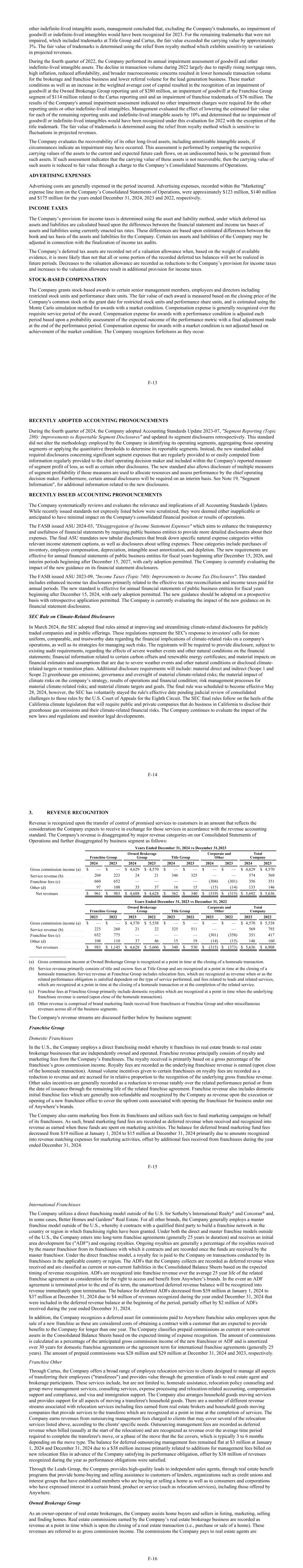 other indefinite-lived intangible assets, management concluded that, excluding the Company's trademarks, no impairment of goodwill or indefinite-lived intangibles would have been recognized for 2023. For the remaining trademarks that were not impaired, which included trademarks at Title Group and Cartus, the fair value exceeded the carrying value by approximately 3%. The fair value of trademarks is determined using the relief from royalty method which exhibits sensitivity to variations in projected revenues. During the fourth quarter of 2022, the Company performed its annual impairment assessment of goodwill and other indefinite-lived intangible assets. The decline in transaction volume during 2022 largely due to rapidly rising mortgage rates, high inflation, reduced affordability, and broader macroeconomic concerns resulted in lower homesale transaction volume for the brokerage and franchise business and lower referral volume for the lead generation business. These market conditions as well as an increase in the weighted average cost of capital resulted in the recognition of an impairment of goodwill at the Owned Brokerage Group reporting unit of $280 million, an impairment of goodwill at the Franchise Group segment of $114 million related to the Cartus reporting unit and an impairment of franchise trademarks of $76 million. The results of the Company's annual impairment assessment indicated no other impairment charges were required for the other reporting units or other indefinite-lived intangibles. Management evaluated the effect of lowering the estimated fair value for each of the remaining reporting units and indefinite-lived intangible assets by 10% and determined that no impairment of goodwill or indefinite-lived intangibles would have been recognized under this evaluation for 2022 with the exception of the title trademark. The fair value of trademarks is determined using the relief from royalty method which is sensitive to fluctuations in projected revenues. The Company evaluates the recoverability of its other long-lived assets, including amortizable intangible assets, if circumstances indicate an impairment may have occurred. This assessment is performed by comparing the respective carrying values of the assets to the current and expected future cash flows, on an undiscounted basis, to be generated from such assets. If such assessment indicates that the carrying value of these assets is not recoverable, then the carrying value of such assets is reduced to fair value through a charge to the Company’s Consolidated Statements of Operations. ADVERTISING EXPENSES Advertising costs are generally expensed in the period incurred. Advertising expenses, recorded within the "Marketing" expense line item on the Company’s Consolidated Statements of Operations, were approximately $123 million, $140 million and $175 million for the years ended December 31, 2024, 2023 and 2022, respectively. INCOME TAXES The Company’s provision for income taxes is determined using the asset and liability method, under which deferred tax assets and liabilities are calculated based upon the differences between the financial statement and income tax bases of assets and liabilities using currently enacted tax rates. These differences are based upon estimated differences between the book and tax basis of the assets and liabilities for the Company. Certain tax assets and liabilities of the Company may be adjusted in connection with the finalization of income tax audits. The Company’s deferred tax assets are recorded net of a valuation allowance when, based on the weight of available evidence, it is more likely than not that all or some portion of the recorded deferred tax balances will not be realized in future periods. Decreases to the valuation allowance are recorded as reductions to the Company’s provision for income taxes and increases to the valuation allowance result in additional provision for income taxes. STOCK-BASED COMPENSATION The Company grants stock-based awards to certain senior management members, employees and directors including restricted stock units and performance share units. The fair value of each award is measured based on the closing price of the Company's common stock on the grant date for restricted stock units and performance share units, and is estimated using the Monte Carlo simulation method for awards with a market condition. Compensation expense is generally recognized over the requisite service period of the award. Compensation expense for awards with a performance condition is adjusted each period based upon a probability assessment of the expected outcome of the performance metric with a final adjustment made at the end of the performance period. Compensation expense for awards with a market condition is not adjusted based on achievement of the market condition. The Company recognizes forfeitures as they occur. F-13 RECENTLY ADOPTED ACCOUNTING PRONOUNCEMENTS During the fourth quarter of 2024, the Company adopted Accounting Standards Update 2023-07, "Segment Reporting (Topic 280): Improvements to Reportable Segment Disclosures" and updated its segment disclosures retrospectively. This standard did not alter the methodology employed by the Company in identifying its operating segments, aggregating those operating segments or applying the quantitative thresholds to determine its reportable segments. Instead, the new standard added required disclosures concerning significant segment expenses that are regularly provided to or easily computed from information regularly provided to the chief operating decision maker and included within the Company's reported measure of segment profit of loss, as well as certain other disclosures. The new standard also allows disclosure of multiple measures of segment profitability if those measures are used to allocate resources and assess performance by the chief operating decision maker. Furthermore, certain annual disclosures will be require