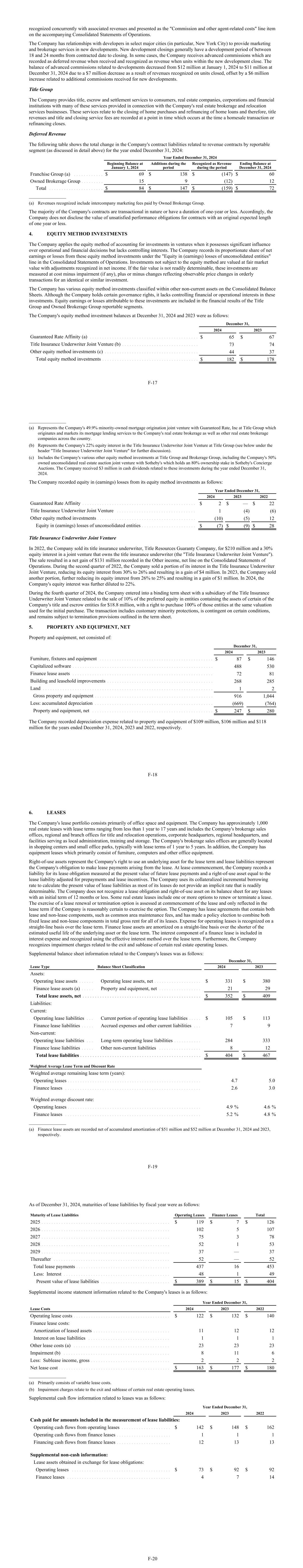 recognized concurrently with associated revenues and presented as the "Commission and other agent-related costs" line item on the accompanying Consolidated Statements of Operations. The Company has relationships with developers in select major cities (in particular, New York City) to provide marketing and brokerage services in new developments. New development closings generally have a development period of between 18 and 24 months from contracted date to closing. In some cases, the Company receives advanced commissions which are recorded as deferred revenue when received and recognized as revenue when units within the new development close. The balance of advanced commissions related to developments decreased from $12 million at January 1, 2024 to $11 million at December 31, 2024 due to a $7 million decrease as a result of revenues recognized on units closed, offset by a $6 million increase related to additional commissions received for new developments. Title Group The Company provides title, escrow and settlement services to consumers, real estate companies, corporations and financial institutions with many of these services provided in connection with the Company's real estate brokerage and relocation services businesses. These services relate to the closing of home purchases and refinancing of home loans and therefore, title revenues and title and closing service fees are recorded at a point in time which occurs at the time a homesale transaction or refinancing closes. Deferred Revenue The following table shows the total change in the Company's contract liabilities related to revenue contracts by reportable segment (as discussed in detail above) for the year ended December 31, 2024: Year Ended December 31, 2024 Beginning Balance at January 1, 2024 Additions during the period Recognized as Revenue during the period Ending Balance at December 31, 2024 Franchise Group (a) . . . . . . . . . . . . $ 69 $ 138 $ (147) $ 60 Owned Brokerage Group . . . . . . . . . 15 9 (12) 12 Total . . . . . . . . . . . . . . . . . . . . . . $ 84 $ 147 $ (159) $ 72 _______________ (a) Revenues recognized include intercompany marketing fees paid by Owned Brokerage Group. The majority of the Company's contracts are transactional in nature or have a duration of one-year or less. Accordingly, the Company does not disclose the value of unsatisfied performance obligations for contracts with an original expected length of one year or less. 4. EQUITY METHOD INVESTMENTS The Company applies the equity method of accounting for investments in ventures when it possesses significant influence over operational and financial decisions but lacks controlling interests. The Company records its proportionate share of net earnings or losses from these equity method investments under the "Equity in (earnings) losses of unconsolidated entities" line in the Consolidated Statements of Operations. Investments not subject to the equity method are valued at fair market value with adjustments recognized in net income. If the fair value is not readily determinable, these investments are measured at cost minus impairment (if any), plus or minus changes reflecting observable price changes in orderly transactions for an identical or similar investment. The Company has various equity method investments classified within other non-current assets on the Consolidated Balance Sheets. Although the Company holds certain governance rights, it lacks controlling financial or operational interests in these investments. Equity earnings or losses attributable to these investments are included in the financial results of the Title Group and Owned Brokerage Group reportable segments. The Company's equity method investment balances at December 31, 2024 and 2023 were as follows: December 31, 2024 2023 Guaranteed Rate Affinity (a) . . . . . . . . . . . . . . . . . . . . . . . . . . . . . . . . . . . . . . . . . . . . $ 65 $ 67 Title Insurance Underwriter Joint Venture (b) . . . . . . . . . . . . . . . . . . . . . . . . . . . . . . . 73 74 Other equity method investments (c) . . . . . . . . . . . . . . . . . . . . . . . . . . . . . . . . . . . . . . 44 37 Total equity method investments . . . . . . . . . . . . . . . . . . . . . . . . . . . . . . . . . . . . . . . $ 182 $ 178 F-17 _______________ (a) Represents the Company's 49.9% minority-owned mortgage origination joint venture with Guaranteed Rate, Inc at Title Group which originates and markets its mortgage lending services to the Company's real estate brokerage as well as other real estate brokerage companies across the country. (b) Represents the Company's 22% equity interest in the Title Insurance Underwriter Joint Venture at Title Group (see below under the header "Title Insurance Underwriter Joint Venture" for further discussion). (c) Includes the Company's various other equity method investments at Title Group and Brokerage Group, including the Company's 50% owned unconsolidated real estate auction joint venture with Sotheby's which holds an 80% ownership stake in Sotheby's Concierge Auctions. The Company received $3 million in cash dividends related to these investments during the year ended December 31, 2024. The Company recorded equity in (earnings) losses from its equity method investments as follows: Year Ended December 31, 2024 2023 2022 Guaranteed Rate Affinity . . . . . . . . . . . . . . . . . . . . . . . . . . . . . . . . . . . . . . . . . . . . . . $ 2 $ — $ 22 Title Insurance Underwriter Joint Venture . . . . . . . . . . . . . . . . . . . . . . . . . . . . . . . . 1 (4) (6) Other equity method investments . . . . . . . . . . . . . . . . . . . . . . . . . . . . . . . . . . . . . . . . (10) (5) 12 Equity in (earnings) losses of unconsolidated entities . . . . . . . . . . . . . . . . . . . . . . $ (7) $ (9) $ 28 Title Insurance Underwriter Joint Venture In 2022, the Company sold its title insurance underwriter, Title Resources Guaranty Company, for $210 million and a 30% equity interest in