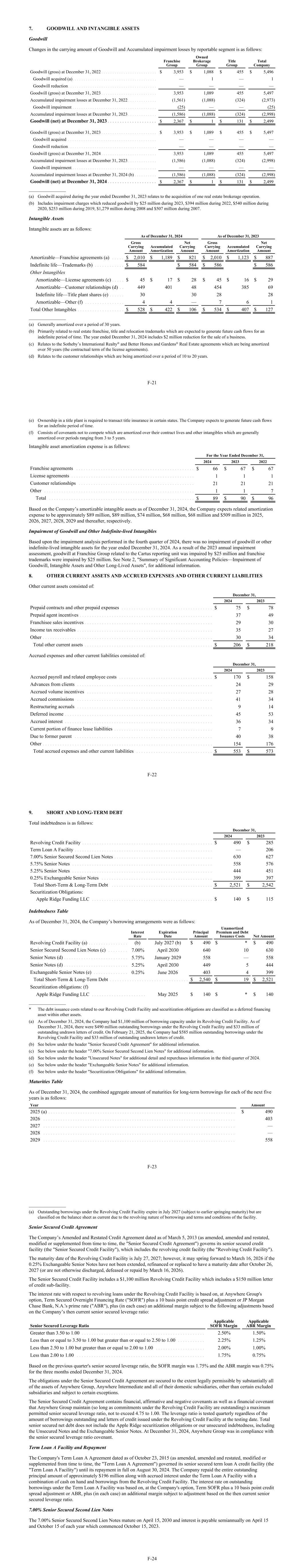7. GOODWILL AND INTANGIBLE ASSETS Goodwill Changes in the carrying amount of Goodwill and Accumulated impairment losses by reportable segment is as follows: Franchise Group Owned Brokerage Group Title Group Total Company Goodwill (gross) at December 31, 2022 . . . . . . . . . . . . . . . . . . . . . . . . . $ 3,953 $ 1,088 $ 455 $ 5,496 Goodwill acquired (a) . . . . . . . . . . . . . . . . . . . . . . . . . . . . . . . . . . . . . . — 1 — 1 Goodwill reduction . . . . . . . . . . . . . . . . . . . . . . . . . . . . . . . . . . . . . . . . — — — — Goodwill (gross) at December 31, 2023 . . . . . . . . . . . . . . . . . . . . . . . . . 3,953 1,089 455 5,497 Accumulated impairment losses at December 31, 2022 . . . . . . . . . . . . . (1,561) (1,088) (324) (2,973) Goodwill impairment . . . . . . . . . . . . . . . . . . . . . . . . . . . . . . . . . . . . . . (25) — — (25) Accumulated impairment losses at December 31, 2023 . . . . . . . . . . . . . (1,586) (1,088) (324) (2,998) Goodwill (net) at December 31, 2023 . . . . . . . . . . . . . . . . . . . . $ 2,367 $ 1 $ 131 $ 2,499 Goodwill (gross) at December 31, 2023 . . . . . . . . . . . . . . . . . . . . . . . . . $ 3,953 $ 1,089 $ 455 $ 5,497 Goodwill acquired . . . . . . . . . . . . . . . . . . . . . . . . . . . . . . . . . . . . . . . . — — — — Goodwill reduction . . . . . . . . . . . . . . . . . . . . . . . . . . . . . . . . . . . . . . . . — — — — Goodwill (gross) at December 31, 2024 . . . . . . . . . . . . . . . . . . . . . . . . . 3,953 1,089 455 5,497 Accumulated impairment losses at December 31, 2023 . . . . . . . . . . . . . (1,586) (1,088) (324) (2,998) Goodwill impairment . . . . . . . . . . . . . . . . . . . . . . . . . . . . . . . . . . . . . . — — — — Accumulated impairment losses at December 31, 2024 (b) . . . . . . . . . . (1,586) (1,088) (324) (2,998) Goodwill (net) at December 31, 2024 . . . . . . . . . . . . . . . . . . . . $ 2,367 $ 1 $ 131 $ 2,499 _______________ (a) Goodwill acquired during the year ended December 31, 2023 relates to the acquisition of one real estate brokerage operation. (b) Includes impairment charges which reduced goodwill by $25 million during 2023, $394 million during 2022, $540 million during 2020, $253 million during 2019, $1,279 million during 2008 and $507 million during 2007. Intangible Assets Intangible assets are as follows: As of December 31, 2024 As of December 31, 2023 Gross Carrying Amount Accumulated Amortization Net Carrying Amount Gross Carrying Amount Accumulated Amortization Net Carrying Amount Amortizable—Franchise agreements (a) . . . . . $ 2,010 $ 1,189 $ 821 $ 2,010 $ 1,123 $ 887 Indefinite life—Trademarks (b) . . . . . . . . . . . . $ 584 $ 584 $ 586 $ 586 Other Intangibles Amortizable—License agreements (c) . . . . . $ 45 $ 17 $ 28 $ 45 $ 16 $ 29 Amortizable—Customer relationships (d) . . 449 401 48 454 385 69 Indefinite life—Title plant shares (e) . . . . . . 30 30 28 28 Amortizable—Other (f) . . . . . . . . . . . . . . . . 4 4 — 7 6 1 Total Other Intangibles . . . . . . . . . . . . . . . . . . . $ 528 $ 422 $ 106 $ 534 $ 407 $ 127 _______________ (a) Generally amortized over a period of 30 years. (b) Primarily related to real estate franchise, title and relocation trademarks which are expected to generate future cash flows for an indefinite period of time. The year ended December 31, 2024 includes $2 million reduction for the sale of a business. (c) Relates to the Sotheby’s International Realty® and Better Homes and Gardens® Real Estate agreements which are being amortized over 50 years (the contractual term of the license agreements). (d) Relates to the customer relationships which are being amortized over a period of 10 to 20 years. F-21 (e) Ownership in a title plant is required to transact title insurance in certain states. The Company expects to generate future cash flows for an indefinite period of time. (f) Consists of covenants not to compete which are amortized over their contract lives and other intangibles which are generally amortized over periods ranging from 3 to 5 years. Intangible asset amortization expense is as follows: For the Year Ended December 31, 2024 2023 2022 Franchise agreements . . . . . . . . . . . . . . . . . . . . . . . . . . . . . . . . . . . . . . . . . . . . . . . . $ 66 $ 67 $ 67 License agreements . . . . . . . . . . . . . . . . . . . . . . . . . . . . . . . . . . . . . . . . . . . . . . . . . . 1 1 1 Customer relationships . . . . . . . . . . . . . . . . . . . . . . . . . . . . . . . . . . . . . . . . . . . . . . . 21 21 21 Other . . . . . . . . . . . . . . . . . . . . . . . . . . . . . . . . . . . . . . . . . . . . . . . . . . . . . . . . . . . . . 1 1 7 Total . . . . . . . . . . . . . . . . . . . . . . . . . . . . . . . . . . . . . . . . . . . . . . . . . . . . . . . . . . . $ 89 $ 90 $ 96 Based on the Company’s amortizable intangible assets as of December 31, 2024, the Company expects related amortization expense to be approximately $89 million, $89 million, $74 million, $68 million, $68 million and $509 million in 2025, 2026, 2027, 2028, 2029 and thereafter, respectively. Impairment of Goodwill and Other Indefinite-lived Intangibles Based upon the impairment analysis performed in the fourth quarter of 2024, there was no impairment of goodwill or other indefinite-lived intangible assets for the year ended December 31, 2024. As a result of the 2023 annual impairment assessment, goodwill at Franchise Group related to the Cartus reporting unit was impaired by $25 million and franchise trademarks were impaired by $25 million. See Note 2, "Summary of Significant Accounting Policies—Impairment of Goodwill, Intangible Assets and Other Long-Lived Assets", for additional information. 8. OTHER CURRENT ASSETS AND ACCRUED EXPENSES AND OTHER CURRENT LIABILITIES Other current assets consisted of: December 31, 2024 2023 Prepaid contracts and other prepaid expenses . . . . . . . . . . . . . .