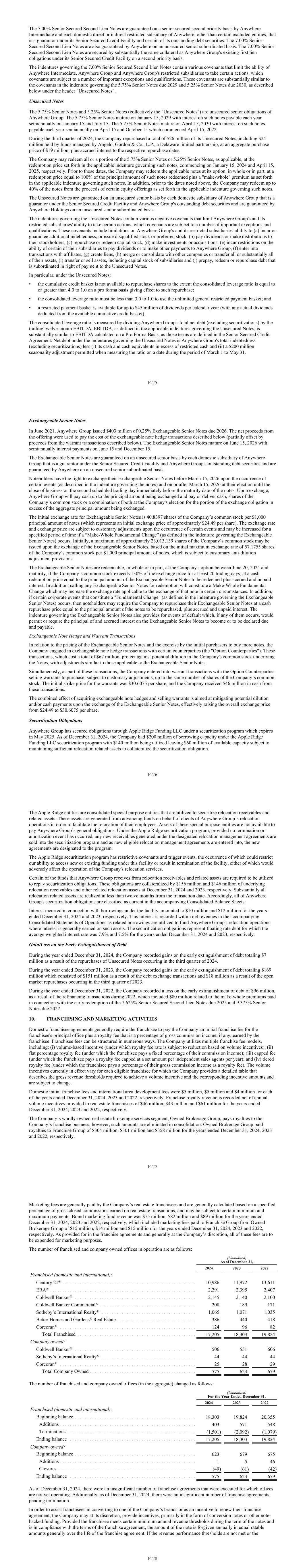 The 7.00% Senior Secured Second Lien Notes are guaranteed on a senior secured second priority basis by Anywhere Intermediate and each domestic direct or indirect restricted subsidiary of Anywhere, other than certain excluded entities, that is a guarantor under its Senior Secured Credit Facility and certain of its outstanding debt securities. The 7.00% Senior Secured Second Lien Notes are also guaranteed by Anywhere on an unsecured senior subordinated basis. The 7.00% Senior Secured Second Lien Notes are secured by substantially the same collateral as Anywhere Group's existing first lien obligations under its Senior Secured Credit Facility on a second priority basis. The indentures governing the 7.00% Senior Secured Second Lien Notes contain various covenants that limit the ability of Anywhere Intermediate, Anywhere Group and Anywhere Group's restricted subsidiaries to take certain actions, which covenants are subject to a number of important exceptions and qualifications. These covenants are substantially similar to the covenants in the indenture governing the 5.75% Senior Notes due 2029 and 5.25% Senior Notes due 2030, as described below under the header "Unsecured Notes". Unsecured Notes The 5.75% Senior Notes and 5.25% Senior Notes (collectively the "Unsecured Notes") are unsecured senior obligations of Anywhere Group. The 5.75% Senior Notes mature on January 15, 2029 with interest on such notes payable each year semiannually on January 15 and July 15. The 5.25% Senior Notes mature on April 15, 2030 with interest on such notes payable each year semiannually on April 15 and October 15 which commenced April 15, 2022. During the third quarter of 2024, the Company repurchased a total of $26 million of its Unsecured Notes, including $24 million held by funds managed by Angelo, Gordon & Co., L.P., a Delaware limited partnership, at an aggregate purchase price of $19 million, plus accrued interest to the respective repurchase dates. The Company may redeem all or a portion of the 5.75% Senior Notes or 5.25% Senior Notes, as applicable, at the redemption price set forth in the applicable indenture governing such notes, commencing on January 15, 2024 and April 15, 2025, respectively. Prior to those dates, the Company may redeem the applicable notes at its option, in whole or in part, at a redemption price equal to 100% of the principal amount of such notes redeemed plus a "make-whole" premium as set forth in the applicable indenture governing such notes. In addition, prior to the dates noted above, the Company may redeem up to 40% of the notes from the proceeds of certain equity offerings as set forth in the applicable indenture governing such notes. The Unsecured Notes are guaranteed on an unsecured senior basis by each domestic subsidiary of Anywhere Group that is a guarantor under the Senior Secured Credit Facility and Anywhere Group's outstanding debt securities and are guaranteed by Anywhere Holdings on an unsecured senior subordinated basis. The indentures governing the Unsecured Notes contain various negative covenants that limit Anywhere Group's and its restricted subsidiaries' ability to take certain actions, which covenants are subject to a number of important exceptions and qualifications. These covenants include limitations on Anywhere Group's and its restricted subsidiaries' ability to (a) incur or guarantee additional indebtedness, or issue disqualified stock or preferred stock, (b) pay dividends or make distributions to their stockholders, (c) repurchase or redeem capital stock, (d) make investments or acquisitions, (e) incur restrictions on the ability of certain of their subsidiaries to pay dividends or to make other payments to Anywhere Group, (f) enter into transactions with affiliates, (g) create liens, (h) merge or consolidate with other companies or transfer all or substantially all of their assets, (i) transfer or sell assets, including capital stock of subsidiaries and (j) prepay, redeem or repurchase debt that is subordinated in right of payment to the Unsecured Notes. In particular, under the Unsecured Notes: • the cumulative credit basket is not available to repurchase shares to the extent the consolidated leverage ratio is equal to or greater than 4.0 to 1.0 on a pro forma basis giving effect to such repurchase; • the consolidated leverage ratio must be less than 3.0 to 1.0 to use the unlimited general restricted payment basket; and • a restricted payment basket is available for up to $45 million of dividends per calendar year (with any actual dividends deducted from the available cumulative credit basket). The consolidated leverage ratio is measured by dividing Anywhere Group's total net debt (excluding securitizations) by the trailing twelve-month EBITDA. EBITDA, as defined in the applicable indentures governing the Unsecured Notes, is substantially similar to EBITDA calculated on a Pro Forma Basis, as those terms are defined in the Senior Secured Credit Agreement. Net debt under the indentures governing the Unsecured Notes is Anywhere Group's total indebtedness (excluding securitizations) less (i) its cash and cash equivalents in excess of restricted cash and (ii) a $200 million seasonality adjustment permitted when measuring the ratio on a date during the period of March 1 to May 31. F-25 Exchangeable Senior Notes In June 2021, Anywhere Group issued $403 million of 0.25% Exchangeable Senior Notes due 2026. The net proceeds from the offering were used to pay the cost of the exchangeable note hedge transactions described below (partially offset by proceeds from the warrant transactions described below). The Exchangeable Senior Notes mature on June 15, 2026 with semiannually interest payments on June 15 and December 15. The Exchangeable Senior Notes are guaranteed on an unsecured senior basis by each domestic subsidiary of Anywhere Group that is a guarantor under the Senior Secured Credit Facility and Anywhere Group's outstanding debt securities and are guaran
