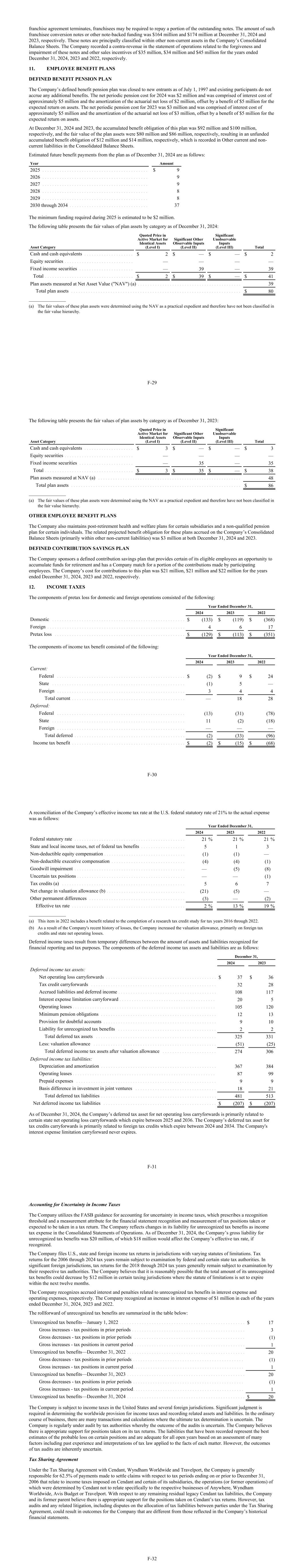 franchise agreement terminates, franchisees may be required to repay a portion of the outstanding notes. The amount of such franchisee conversion notes or other note-backed funding was $164 million and $174 million at December 31, 2024 and 2023, respectively. These notes are principally classified within other non-current assets in the Company’s Consolidated Balance Sheets. The Company recorded a contra-revenue in the statement of operations related to the forgiveness and impairment of these notes and other sales incentives of $35 million, $34 million and $45 million for the years ended December 31, 2024, 2023 and 2022, respectively. 11. EMPLOYEE BENEFIT PLANS DEFINED BENEFIT PENSION PLAN The Company’s defined benefit pension plan was closed to new entrants as of July 1, 1997 and existing participants do not accrue any additional benefits. The net periodic pension cost for 2024 was $2 million and was comprised of interest cost of approximately $5 million and the amortization of the actuarial net loss of $2 million, offset by a benefit of $5 million for the expected return on assets. The net periodic pension cost for 2023 was $3 million and was comprised of interest cost of approximately $5 million and the amortization of the actuarial net loss of $3 million, offset by a benefit of $5 million for the expected return on assets. At December 31, 2024 and 2023, the accumulated benefit obligation of this plan was $92 million and $100 million, respectively, and the fair value of the plan assets were $80 million and $86 million, respectively, resulting in an unfunded accumulated benefit obligation of $12 million and $14 million, respectively, which is recorded in Other current and non- current liabilities in the Consolidated Balance Sheets. Estimated future benefit payments from the plan as of December 31, 2024 are as follows: Year Amount 2025 . . . . . . . . . . . . . . . . . . . . . . . . . . . . . . . . . . . . . . . . . . . $ 9 2026 . . . . . . . . . . . . . . . . . . . . . . . . . . . . . . . . . . . . . . . . . . . 9 2027 . . . . . . . . . . . . . . . . . . . . . . . . . . . . . . . . . . . . . . . . . . . 9 2028 . . . . . . . . . . . . . . . . . . . . . . . . . . . . . . . . . . . . . . . . . . . 8 2029 . . . . . . . . . . . . . . . . . . . . . . . . . . . . . . . . . . . . . . . . . . . 8 2030 through 2034 . . . . . . . . . . . . . . . . . . . . . . . . . . . . . . . . 37 The minimum funding required during 2025 is estimated to be $2 million. The following table presents the fair values of plan assets by category as of December 31, 2024: Asset Category Quoted Price in Active Market for Identical Assets (Level I) Significant Other Observable Inputs (Level II) Significant Unobservable Inputs (Level III) Total Cash and cash equivalents . . . . . . . . . . . . . . . . . . . . $ 2 $ — $ — $ 2 Equity securities . . . . . . . . . . . . . . . . . . . . . . . . . . . . — — — — Fixed income securities . . . . . . . . . . . . . . . . . . . . . . — 39 — 39 Total . . . . . . . . . . . . . . . . . . . . . . . . . . . . . . . . . . . . $ 2 $ 39 $ — $ 41 Plan assets measured at Net Asset Value ("NAV") (a) . . . . . . . . . . . . . . . . . . . . . . . . . . . . . . . . . . . . . . . . . . 39 Total plan assets . . . . . . . . . . . . . . . . . . . . . . . . . . . . . . . . . . . . . . . . . . . . . . . . . . . . . . . . . . . . . . . . . . . . . $ 80 _______________ (a) The fair values of these plan assets were determined using the NAV as a practical expedient and therefore have not been classified in the fair value hierarchy. F-29 The following table presents the fair values of plan assets by category as of December 31, 2023: Asset Category Quoted Price in Active Market for Identical Assets (Level I) Significant Other Observable Inputs (Level II) Significant Unobservable Inputs (Level III) Total Cash and cash equivalents . . . . . . . . . . . . . . . . . . . . $ 3 $ — $ — $ 3 Equity securities . . . . . . . . . . . . . . . . . . . . . . . . . . . . — — — — Fixed income securities . . . . . . . . . . . . . . . . . . . . . . — 35 — 35 Total . . . . . . . . . . . . . . . . . . . . . . . . . . . . . . . . . . . . $ 3 $ 35 $ — $ 38 Plan assets measured at NAV (a) . . . . . . . . . . . . . . . . . . . . . . . . . . . . . . . . . . . . . . . . . . . . . . . . . . . . . . . . . . 48 Total plan assets . . . . . . . . . . . . . . . . . . . . . . . . . . . . . . . . . . . . . . . . . . . . . . . . . . . . . . . . . . . . . . . . . . . . . $ 86 _______________ (a) The fair values of these plan assets were determined using the NAV as a practical expedient and therefore have not been classified in the fair value hierarchy. OTHER EMPLOYEE BENEFIT PLANS The Company also maintains post-retirement health and welfare plans for certain subsidiaries and a non-qualified pension plan for certain individuals. The related projected benefit obligation for these plans accrued on the Company’s Consolidated Balance Sheets (primarily within other non-current liabilities) was $3 million at both December 31, 2024 and 2023. DEFINED CONTRIBUTION SAVINGS PLAN The Company sponsors a defined contribution savings plan that provides certain of its eligible employees an opportunity to accumulate funds for retirement and has a Company match for a portion of the contributions made by participating employees. The Company’s cost for contributions to this plan was $21 million, $21 million and $22 million for the years ended December 31, 2024, 2023 and 2022, respectively. 12. INCOME TAXES The components of pretax loss for domestic and foreign operations consisted of the following: Year Ended December 31, 2024 2023 2022 Domestic . . . . . . . . . . . . . . . . . . . . . . . . . . . . . . . . . . . . . . . . . . . . . . . . . . . . . . $ (133) $ (119) $ (368) Foreign . . . . . . . . . . . . . . . . . . . . . . . . . . . . . . . . . . . . . . . . . . . . . . . . . . . . . . . . 4 6 17 Pretax loss . . . . . . 
