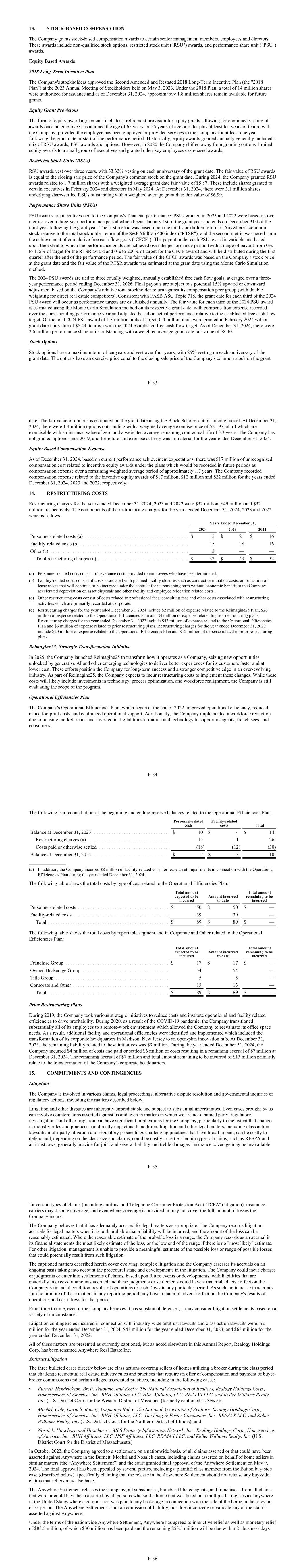 13. STOCK-BASED COMPENSATION The Company grants stock-based compensation awards to certain senior management members, employees and directors. These awards include non-qualified stock options, restricted stock unit ("RSU") awards, and performance share unit ("PSU") awards. Equity Based Awards 2018 Long-Term Incentive Plan The Company's stockholders approved the Second Amended and Restated 2018 Long-Term Incentive Plan (the "2018 Plan") at the 2023 Annual Meeting of Stockholders held on May 3, 2023. Under the 2018 Plan, a total of 14 million shares were authorized for issuance and as of December 31, 2024, approximately 1.8 million shares remain available for future grants. Equity Grant Provisions The form of equity award agreements includes a retirement provision for equity grants, allowing for continued vesting of awards once an employee has attained the age of 65 years, or 55 years of age or older plus at least ten years of tenure with the Company, provided the employee has been employed or provided services to the Company for at least one year following the grant date or start of the performance period. Historically, equity awards granted annually generally included a mix of RSU awards, PSU awards and options. However, in 2020 the Company shifted away from granting options, limited equity awards to a small group of executives and granted other key employees cash-based awards. Restricted Stock Units (RSUs) RSU awards vest over three years, with 33.33% vesting on each anniversary of the grant date. The fair value of RSU awards is equal to the closing sale price of the Company's common stock on the grant date. During 2024, the Company granted RSU awards related to 1.7 million shares with a weighted average grant date fair value of $5.87. These include shares granted to certain executives in February 2024 and directors in May 2024. At December 31, 2024, there were 3.1 million shares underlying share-settled RSUs outstanding with a weighted average grant date fair value of $6.99. Performance Share Units (PSUs) PSU awards are incentives tied to the Company's financial performance. PSUs granted in 2023 and 2022 were based on two metrics over a three-year performance period which began January 1st of the grant year and ends on December 31st of the third year following the grant year. The first metric was based upon the total stockholder return of Anywhere's common stock relative to the total stockholder return of the S&P MidCap 400 index ("RTSR"), and the second metric was based upon the achievement of cumulative free cash flow goals ("CFCF"). The payout under each PSU award is variable and based upon the extent to which the performance goals are achieved over the performance period (with a range of payout from 0% to 175% of target for the RTSR award and 0% to 200% of target for the CFCF award) and will be distributed during the first quarter after the end of the performance period. The fair value of the CFCF awards was based on the Company's stock price at the grant date and the fair value of the RTSR awards was estimated at the grant date using the Monte Carlo Simulation method. The 2024 PSU awards are tied to three equally weighted, annually established free cash flow goals, averaged over a three- year performance period ending December 31, 2026. Final payouts are subject to a potential 15% upward or downward adjustment based on the Company’s relative total stockholder return against its compensation peer group (with double weighting for direct real estate competitors). Consistent with FASB ASC Topic 718, the grant date for each third of the 2024 PSU award will occur as performance targets are established annually. The fair value for each third of the 2024 PSU award is estimated using the Monte Carlo Simulation method on its respective grant date, with compensation expense recorded over the corresponding performance year and adjusted based on actual performance relative to the established free cash flow target. Of the total 2024 PSU award of 1.3 million units at target, 0.4 million units were granted in February 2024 with a grant date fair value of $6.44, to align with the 2024 established free cash flow target. As of December 31, 2024, there were 2.6 million performance share units outstanding with a weighted average grant date fair value of $8.40. Stock Options Stock options have a maximum term of ten years and vest over four years, with 25% vesting on each anniversary of the grant date. The options have an exercise price equal to the closing sale price of the Company's common stock on the grant F-33 date. The fair value of options is estimated on the grant date using the Black-Scholes option-pricing model. At December 31, 2024, there were 1.4 million options outstanding with a weighted average exercise price of $21.97, all of which are exercisable with an intrinsic value of zero and a weighted average remaining contractual life of 3.3 years. The Company has not granted options since 2019, and forfeiture and exercise activity was immaterial for the year ended December 31, 2024. Equity Based Compensation Expense As of December 31, 2024, based on current performance achievement expectations, there was $17 million of unrecognized compensation cost related to incentive equity awards under the plans which would be recorded in future periods as compensation expense over a remaining weighted average period of approximately 1.7 years. The Company recorded compensation expense related to the incentive equity awards of $17 million, $12 million and $22 million for the years ended December 31, 2024, 2023 and 2022, respectively. 14. RESTRUCTURING COSTS Restructuring charges for the years ended December 31, 2024, 2023 and 2022 were $32 million, $49 million and $32 million, respectively. The components of the restructuring charges for the years ended December 31, 2024, 2023 and 2022 were as follows: Years Ended December 31, 2024 2023 2022 Personnel-related costs (a) . . . . . . . . . . . . . . . . . .