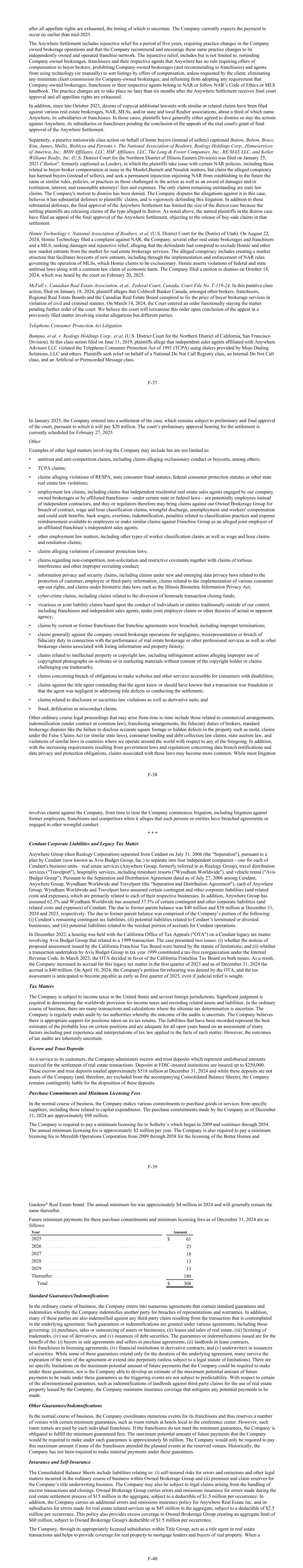 after all appellate rights are exhausted, the timing of which is uncertain. The Company currently expects the payment to occur no earlier than mid-2025. The Anywhere Settlement includes injunctive relief for a period of five years, requiring practice changes in the Company owned brokerage operations and that the Company recommend and encourage these same practice changes to its independently owned and operated franchise network. The injunctive relief, includes but is not limited to, reminding Company owned brokerages, franchisees and their respective agents that Anywhere has no rule requiring offers of compensation to buyer brokers; prohibiting Company-owned brokerages (and recommending to franchisees) and agents from using technology (or manually) to sort listings by offers of compensation, unless requested by the client; eliminating any minimum client commission for Company-owned brokerages; and refraining from adopting any requirement that Company-owned brokerages, franchisees or their respective agents belong to NAR or follow NAR’s Code of Ethics or MLS handbook. The practice changes are to take place no later than six months after the Anywhere Settlement receives final court approval and all appellate rights are exhausted. In addition, since late October 2023, dozens of copycat additional lawsuits with similar or related claims have been filed against various real estate brokerages, NAR, MLSs, and/or state and local Realtor associations, about a third of which name Anywhere, its subsidiaries or franchisees. In those cases, plaintiffs have generally either agreed to dismiss or stay the actions against Anywhere, its subsidiaries or franchisees pending the conclusion of the appeals of the trial court's grant of final approval of the Anywhere Settlement. Separately, a putative nationwide class action on behalf of home buyers (instead of sellers) captioned Batton, Bolton, Brace, Kim, James, Mullis, Bisbicos and Parsons v. The National Association of Realtors, Realogy Holdings Corp., Homeservices of America, Inc., BHH Affiliates, LLC, HSF Affiliates, LLC, The Long & Foster Companies, Inc., RE/MAX LLC, and Keller Williams Realty, Inc. (U.S. District Court for the Northern District of Illinois Eastern Division) was filed on January 25, 2021 ("Batton", formerly captioned as Leeder), in which the plaintiffs take issue with certain NAR policies, including those related to buyer-broker compensation at issue in the Moehrl,Burnett and Nosalek matters, but claim the alleged conspiracy has harmed buyers (instead of sellers), and seek a permanent injunction enjoining NAR from establishing in the future the same or similar rules, policies, or practices as those challenged in the action as well as an award of damages and/or restitution, interest, and reasonable attorneys’ fees and expenses. The only claims remaining outstanding are state law claims. The Company's motion to dismiss has been denied. The Company disputes the allegations against it in this case, believes it has substantial defenses to plaintiffs’ claims, and is vigorously defending this litigation. In addition to these substantial defenses, the final approval of the Anywhere Settlement has limited the size of the Batton case because the settling plaintiffs are releasing claims of the type alleged in Batton. As noted above, the named plaintiffs in the Batton case have filed an appeal of the final approval of the Anywhere Settlement, objecting to the release of buy-side claims in that settlement. Homie Technology v. National Association of Realtors, et al. (U.S. District Court for the District of Utah). On August 22, 2024, Homie Technology filed a complaint against NAR, the Company, several other real estate brokerages and franchisors and a MLS, seeking damages and injunctive relief, alleging that the defendants had conspired to exclude Homie and other new market entrants from the market for real estate brokerage services. The alleged conspiracy includes creating a market structure that facilitates boycotts of new entrants, including through the implementation and enforcement of NAR rules governing the operation of MLSs, which Homie claims to be exclusionary. Homie asserts violations of federal and state antitrust laws along with a common law claim of economic harm. The Company filed a motion to dismiss on October 18, 2024, which was heard by the court on February 20, 2025. McFall v. Canadian Real Estate Association, et al., Federal Court, Canada, Court File No. T-119-24. In this putative class action, filed on January 18, 2024, plaintiff alleges that Coldwell Banker Canada, amongst other brokers, franchisors, Regional Real Estate Boards and the Canadian Real Estate Board conspired to fix the price of buyer brokerage services in violation of civil and criminal statutes. On March 14, 2024, the Court entered an order functionally staying the matter pending further order of the court. We believe the court will reexamine this order upon conclusion of the appeal in a previously filed matter involving similar allegations but different parties. Telephone Consumer Protection Act Litigation Bumpus, et al. v. Realogy Holdings Corp., et al. (U.S. District Court for the Northern District of California, San Francisco Division). In this class action filed on June 11, 2019, plaintiffs allege that independent sales agents affiliated with Anywhere Advisors LLC violated the Telephone Consumer Protection Act of 1991 (TCPA) using dialers provided by Mojo Dialing Solutions, LLC and others. Plaintiffs seek relief on behalf of a National Do Not Call Registry class, an Internal Do Not Call class, and an Artificial or Prerecorded Message class. F-37 In January 2025, the Company entered into a settlement of the case, which remains subject to preliminary and final approval of the court, pursuant to which it will pay $20 million. The court’s preliminary approval hearing for the settlement is currently scheduled for February 27, 2025. Other Examples of other le