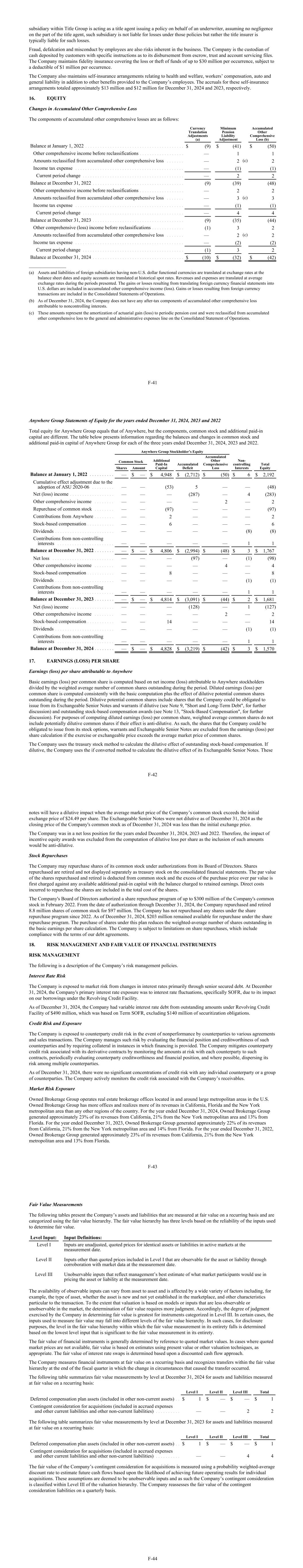 subsidiary within Title Group is acting as a title agent issuing a policy on behalf of an underwriter, assuming no negligence on the part of the title agent, such subsidiary is not liable for losses under those policies but rather the title insurer is typically liable for such losses. Fraud, defalcation and misconduct by employees are also risks inherent in the business. The Company is the custodian of cash deposited by customers with specific instructions as to its disbursement from escrow, trust and account servicing files. The Company maintains fidelity insurance covering the loss or theft of funds of up to $30 million per occurrence, subject to a deductible of $1 million per occurrence. The Company also maintains self-insurance arrangements relating to health and welfare, workers’ compensation, auto and general liability in addition to other benefits provided to the Company’s employees. The accruals for these self-insurance arrangements totaled approximately $13 million and $12 million for December 31, 2024 and 2023, respectively. 16. EQUITY Changes in Accumulated Other Comprehensive Loss The components of accumulated other comprehensive losses are as follows: Balance at January 1, 2022 . . . . . . . . . . . . . . . . . . . . . . . . . . . . . . . . . . . . . . . . $ (9) $ (41) $ (50) Other comprehensive income before reclassifications . . . . . . . . . . . . . . . . . . — 1 1 Amounts reclassified from accumulated other comprehensive loss . . . . . . . — 2 (c) 2 Income tax expense . . . . . . . . . . . . . . . . . . . . . . . . . . . . . . . . . . . . . . . . . . . . — (1) (1) Current period change . . . . . . . . . . . . . . . . . . . . . . . . . . . . . . . . . . . . . . . . . — 2 2 Balance at December 31, 2022 . . . . . . . . . . . . . . . . . . . . . . . . . . . . . . . . . . . . . (9) (39) (48) Other comprehensive income before reclassifications . . . . . . . . . . . . . . . . . . — 2 2 Amounts reclassified from accumulated other comprehensive loss . . . . . . . — 3 (c) 3 Income tax expense . . . . . . . . . . . . . . . . . . . . . . . . . . . . . . . . . . . . . . . . . . . . — (1) (1) Current period change . . . . . . . . . . . . . . . . . . . . . . . . . . . . . . . . . . . . . . . . . — 4 4 Balance at December 31, 2023 . . . . . . . . . . . . . . . . . . . . . . . . . . . . . . . . . . . . . (9) (35) (44) Other comprehensive (loss) income before reclassifications . . . . . . . . . . . . . (1) 3 2 Amounts reclassified from accumulated other comprehensive loss . . . . . . . — 2 (c) 2 Income tax expense . . . . . . . . . . . . . . . . . . . . . . . . . . . . . . . . . . . . . . . . . . . . — (2) (2) Current period change . . . . . . . . . . . . . . . . . . . . . . . . . . . . . . . . . . . . . . . . . (1) 3 2 Balance at December 31, 2024 . . . . . . . . . . . . . . . . . . . . . . . . . . . . . . . . . . . . . $ (10) $ (32) $ (42) Currency Translation Adjustments (a) Minimum Pension Liability Adjustment Accumulated Other Comprehensive Loss (b) _______________ (a) Assets and liabilities of foreign subsidiaries having non-U.S. dollar functional currencies are translated at exchange rates at the balance sheet dates and equity accounts are translated at historical spot rates. Revenues and expenses are translated at average exchange rates during the periods presented. The gains or losses resulting from translating foreign currency financial statements into U.S. dollars are included in accumulated other comprehensive income (loss). Gains or losses resulting from foreign currency transactions are included in the Consolidated Statements of Operations. (b) As of December 31, 2024, the Company does not have any after-tax components of accumulated other comprehensive loss attributable to noncontrolling interests. (c) These amounts represent the amortization of actuarial gain (loss) to periodic pension cost and were reclassified from accumulated other comprehensive loss to the general and administrative expenses line on the Consolidated Statement of Operations. F-41 Anywhere Group Statements of Equity for the years ended December 31, 2024, 2023 and 2022 Total equity for Anywhere Group equals that of Anywhere, but the components, common stock and additional paid-in capital are different. The table below presents information regarding the balances and changes in common stock and additional paid-in capital of Anywhere Group for each of the three years ended December 31, 2024, 2023 and 2022. Balance at January 1, 2022 . . . . . . . . . . — $ — $ 4,948 $ (2,712) $ (50) $ 6 $ 2,192 Cumulative effect adjustment due to the adoption of ASU 2020-06 . . . . . . . . . — — (53) 5 — — (48) Net (loss) income . . . . . . . . . . . . . . . . . . — — — (287) — 4 (283) Other comprehensive income . . . . . . . . — — — — 2 — 2 Repurchase of common stock . . . . . . . . — — (97) — — — (97) Contributions from Anywhere . . . . . . . . — — 2 — — — 2 Stock-based compensation . . . . . . . . . . . — — 6 — — — 6 Dividends . . . . . . . . . . . . . . . . . . . . . . . . — — — — — (8) (8) Contributions from non-controlling interests . . . . . . . . . . . . . . . . . . . . . . . — — — — — 1 1 Balance at December 31, 2022 . . . . . . . . — $ — $ 4,806 $ (2,994) $ (48) $ 3 $ 1,767 Net loss . . . . . . . . . . . . . . . . . . . . . . . . . — — — (97) — (1) (98) Other comprehensive income . . . . . . . . — — — — 4 — 4 Stock-based compensation . . . . . . . . . . . — — 8 — — — 8 Dividends . . . . . . . . . . . . . . . . . . . . . . . . — — — — — (1) (1) Contributions from non-controlling interests . . . . . . . . . . . . . . . . . . . . . . . — — — — — 1 1 Balance at December 31, 2023 . . . . . . . . — $ — $ 4,814 $ (3,091) $ (44) $ 2 $ 1,681 Net (loss) income . . . . . . . . . . . . . . . . . . — — — (128) — 1 (127) Other comprehensive income . . . . . . . . 