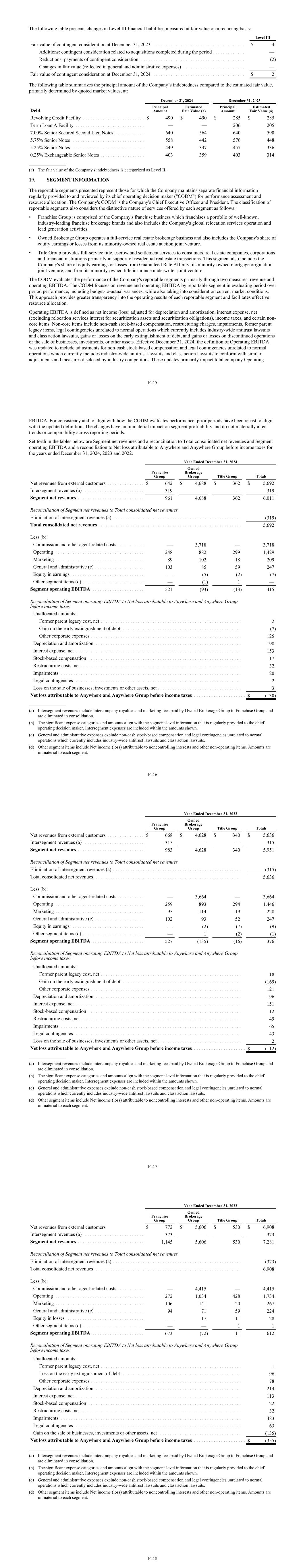 The following table presents changes in Level III financial liabilities measured at fair value on a recurring basis: Level III Fair value of contingent consideration at December 31, 2023 . . . . . . . . . . . . . . . . . . . . . . . . . . . . . . . . . . . . . $ 4 Additions: contingent consideration related to acquisitions completed during the period . . . . . . . . . . . . . — Reductions: payments of contingent consideration . . . . . . . . . . . . . . . . . . . . . . . . . . . . . . . . . . . . . . . . . . (2) Changes in fair value (reflected in general and administrative expenses) . . . . . . . . . . . . . . . . . . . . . . . . . — Fair value of contingent consideration at December 31, 2024 . . . . . . . . . . . . . . . . . . . . . . . . . . . . . . . . . . . . . $ 2 The following table summarizes the principal amount of the Company’s indebtedness compared to the estimated fair value, primarily determined by quoted market values, at: December 31, 2024 December 31, 2023 Debt Principal Amount Estimated Fair Value (a) Principal Amount Estimated Fair Value (a) Revolving Credit Facility . . . . . . . . . . . . . . . . . . . . . . . . . $ 490 $ 490 $ 285 $ 285 Term Loan A Facility . . . . . . . . . . . . . . . . . . . . . . . . . . . . — — 206 205 7.00% Senior Secured Second Lien Notes . . . . . . . . . . . . 640 564 640 590 5.75% Senior Notes . . . . . . . . . . . . . . . . . . . . . . . . . . . . . 558 442 576 448 5.25% Senior Notes . . . . . . . . . . . . . . . . . . . . . . . . . . . . . 449 337 457 336 0.25% Exchangeable Senior Notes . . . . . . . . . . . . . . . . . . 403 359 403 314 _______________ (a) The fair value of the Company's indebtedness is categorized as Level II. 19. SEGMENT INFORMATION The reportable segments presented represent those for which the Company maintains separate financial information regularly provided to and reviewed by its chief operating decision maker ("CODM") for performance assessment and resource allocation. The Company's CODM is the Company's Chief Executive Officer and President. The classification of reportable segments also considers the distinctive nature of services offered by each segment as follows: • Franchise Group is comprised of the Company's franchise business which franchises a portfolio of well-known, industry-leading franchise brokerage brands and also includes the Company's global relocation services operation and lead generation activities. • Owned Brokerage Group operates a full-service real estate brokerage business and also includes the Company's share of equity earnings or losses from its minority-owned real estate auction joint venture. • Title Group provides full-service title, escrow and settlement services to consumers, real estate companies, corporations and financial institutions primarily in support of residential real estate transactions. This segment also includes the Company's share of equity earnings or losses from Guaranteed Rate Affinity, its minority-owned mortgage origination joint venture, and from its minority-owned title insurance underwriter joint venture. The CODM evaluates the performance of the Company's reportable segments primarily through two measures: revenue and operating EBITDA. The CODM focuses on revenue and operating EBITDA by reportable segment in evaluating period over period performance, including budget-to-actual variances, while also taking into consideration current market conditions. This approach provides greater transparency into the operating results of each reportable segment and facilitates effective resource allocation. Operating EBITDA is defined as net income (loss) adjusted for depreciation and amortization, interest expense, net (excluding relocation services interest for securitization assets and securitization obligations), income taxes, and certain non- core items. Non-core items include non-cash stock-based compensation, restructuring charges, impairments, former parent legacy items, legal contingencies unrelated to normal operations which currently includes industry-wide antitrust lawsuits and class action lawsuits, gains or losses on the early extinguishment of debt, and gains or losses on discontinued operations or the sale of businesses, investments, or other assets. Effective December 31, 2024, the definition of Operating EBITDA was updated to include adjustments for non-cash stock-based compensation and legal contingencies unrelated to normal operations which currently includes industry-wide antitrust lawsuits and class action lawsuits to conform with similar adjustments and measures disclosed by industry competitors. These updates primarily impact total company Operating F-45 EBITDA. For consistency and to align with how the CODM evaluates performance, prior periods have been recast to align with the updated definition. The changes have an immaterial impact on segment profitability and do not materially alter trends or comparability across reporting periods. Set forth in the tables below are Segment net revenues and a reconciliation to Total consolidated net revenues and Segment operating EBITDA and a reconciliation to Net loss attributable to Anywhere and Anywhere Group before income taxes for the years ended December 31, 2024, 2023 and 2022. Year Ended December 31, 2024 Franchise Group Owned Brokerage Group Title Group Totals Net revenues from external customers . . . . . . . . . . . . . . . $ 642 $ 4,688 $ 362 $ 5,692 Intersegment revenues (a) . . . . . . . . . . . . . . . . . . . . . . . . 319 — — 319 Segment net revenues . . . . . . . . . . . . . . . . . . . . . . . . . . . 961 4,688 362 6,011 Reconciliation of Segment net revenues to Total consolidated net revenues Elimination of intersegment revenues (a) . . . . . . . . . . . . . . . . . . . . . . . . . . . . . . . . . . . . . . . . . . . . . . . . . . . . (319) Total consolidated net revenues . . . . . . . . . . . . . . . . . . . . . . . . . . . . . . . . . . . . . . . . . . . . . . . . . . . . 