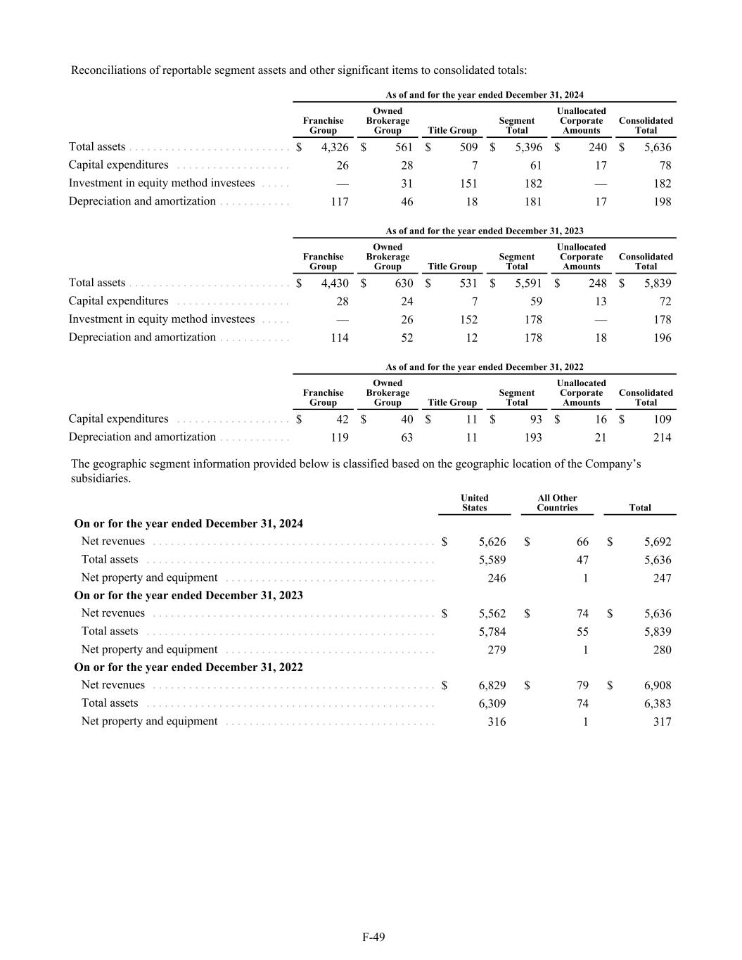 Reconciliations of reportable segment assets and other significant items to consolidated totals: As of and for the year ended December 31, 2024 Franchise Group Owned Brokerage Group Title Group Segment Total Unallocated Corporate Amounts Consolidated Total Total assets . . . . . . . . . . . . . . . . . . . . . . . . . . . $ 4,326 $ 561 $ 509 $ 5,396 $ 240 $ 5,636 Capital expenditures . . . . . . . . . . . . . . . . . . . 26 28 7 61 17 78 Investment in equity method investees . . . . . — 31 151 182 — 182 Depreciation and amortization . . . . . . . . . . . . 117 46 18 181 17 198 As of and for the year ended December 31, 2023 Franchise Group Owned Brokerage Group Title Group Segment Total Unallocated Corporate Amounts Consolidated Total Total assets . . . . . . . . . . . . . . . . . . . . . . . . . . . $ 4,430 $ 630 $ 531 $ 5,591 $ 248 $ 5,839 Capital expenditures . . . . . . . . . . . . . . . . . . . 28 24 7 59 13 72 Investment in equity method investees . . . . . — 26 152 178 — 178 Depreciation and amortization . . . . . . . . . . . . 114 52 12 178 18 196 As of and for the year ended December 31, 2022 Franchise Group Owned Brokerage Group Title Group Segment Total Unallocated Corporate Amounts Consolidated Total Capital expenditures . . . . . . . . . . . . . . . . . . . $ 42 $ 40 $ 11 $ 93 $ 16 $ 109 Depreciation and amortization . . . . . . . . . . . . 119 63 11 193 21 214 The geographic segment information provided below is classified based on the geographic location of the Company’s subsidiaries. United States All Other Countries Total On or for the year ended December 31, 2024 Net revenues . . . . . . . . . . . . . . . . . . . . . . . . . . . . . . . . . . . . . . . . . . . . . . . $ 5,626 $ 66 $ 5,692 Total assets . . . . . . . . . . . . . . . . . . . . . . . . . . . . . . . . . . . . . . . . . . . . . . . . 5,589 47 5,636 Net property and equipment . . . . . . . . . . . . . . . . . . . . . . . . . . . . . . . . . . . 246 1 247 On or for the year ended December 31, 2023 Net revenues . . . . . . . . . . . . . . . . . . . . . . . . . . . . . . . . . . . . . . . . . . . . . . . $ 5,562 $ 74 $ 5,636 Total assets . . . . . . . . . . . . . . . . . . . . . . . . . . . . . . . . . . . . . . . . . . . . . . . . 5,784 55 5,839 Net property and equipment . . . . . . . . . . . . . . . . . . . . . . . . . . . . . . . . . . . 279 1 280 On or for the year ended December 31, 2022 Net revenues . . . . . . . . . . . . . . . . . . . . . . . . . . . . . . . . . . . . . . . . . . . . . . . $ 6,829 $ 79 $ 6,908 Total assets . . . . . . . . . . . . . . . . . . . . . . . . . . . . . . . . . . . . . . . . . . . . . . . . 6,309 74 6,383 Net property and equipment . . . . . . . . . . . . . . . . . . . . . . . . . . . . . . . . . . . 316 1 317 F-49
