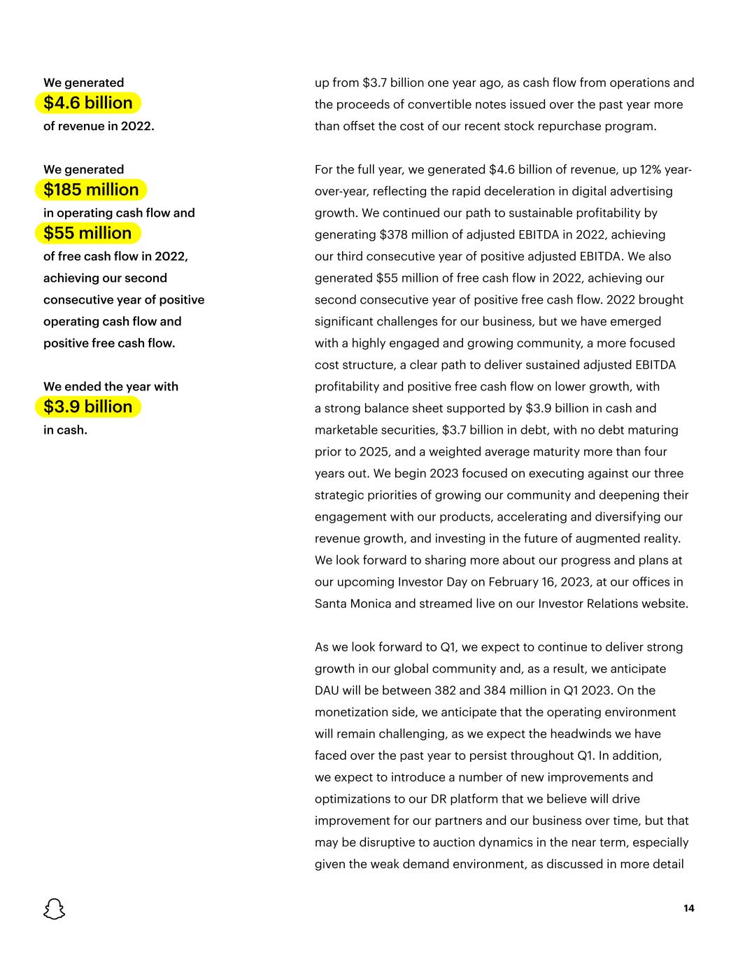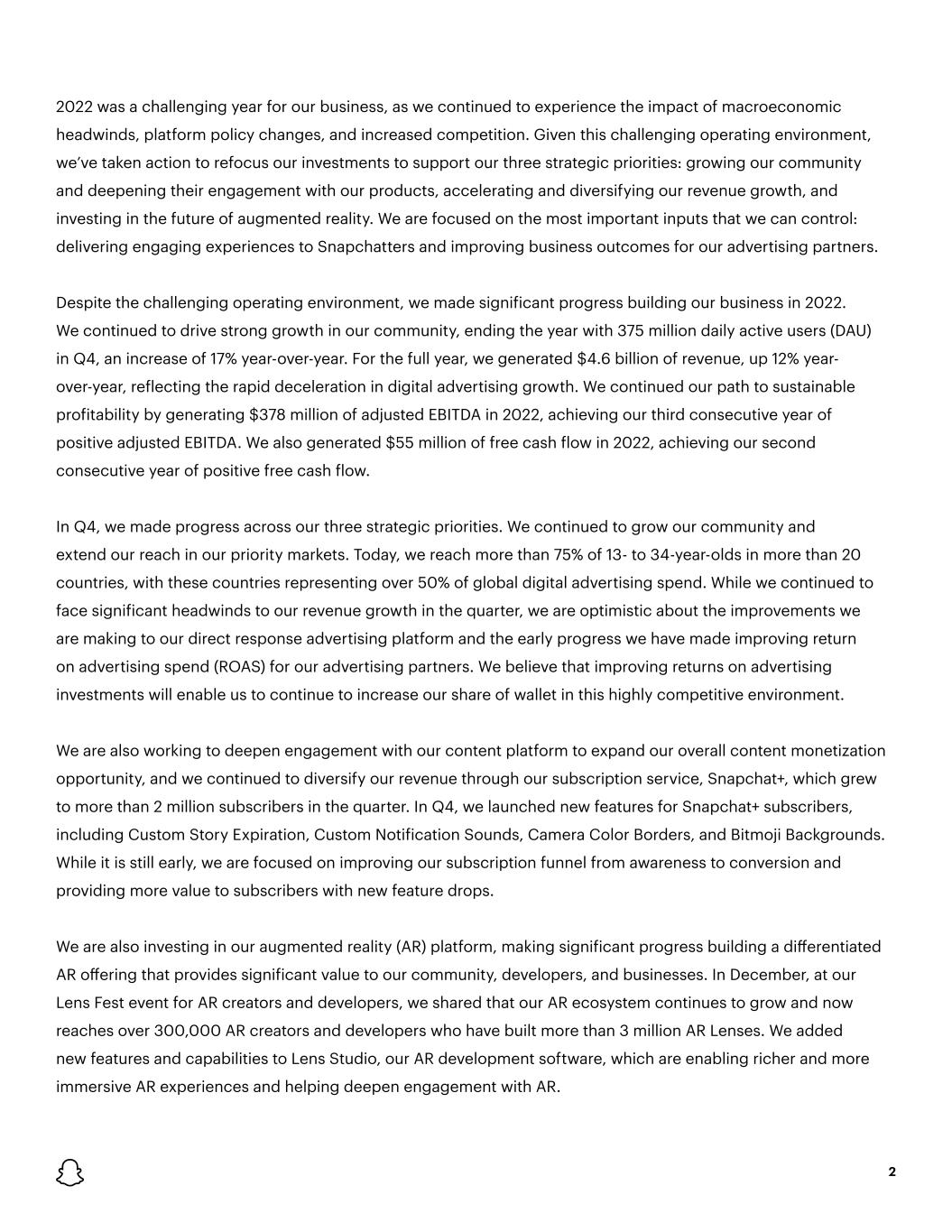 2 2022 was a challenging year for our business, as we continued to experience the impact of macroeconomic headwinds, platform policy changes, and increased competition. Given this challenging operating environment, we’ve taken action to refocus our investments to support our three strategic priorities: growing our community and deepening their engagement with our products, accelerating and diversifying our revenue growth, and investing in the future of augmented reality. We are focused on the most important inputs that we can control: delivering engaging experiences to Snapchatters and improving business outcomes for our advertising partners. Despite the challenging operating environment, we made significant progress building our business in 2022. We continued to drive strong growth in our community, ending the year with 375 million daily active users (DAU) in Q4, an increase of 17% year-over-year. For the full year, we generated $4.6 billion of revenue, up 12% year- over-year, reflecting the rapid deceleration in digital advertising growth. We continued our path to sustainable profitability by generating $378 million of adjusted EBITDA in 2022, achieving our third consecutive year of positive adjusted EBITDA. We also generated $55 million of free cash flow in 2022, achieving our second consecutive year of positive free cash flow. In Q4, we made progress across our three strategic priorities. We continued to grow our community and extend our reach in our priority markets. Today, we reach more than 75% of 13- to 34-year-olds in more than 20 countries, with these countries representing over 50% of global digital advertising spend. While we continued to face significant headwinds to our revenue growth in the quarter, we are optimistic about the improvements we are making to our direct response advertising platform and the early progress we have made improving return on advertising spend (ROAS) for our advertising partners. We believe that improving returns on advertising investments will enable us to continue to increase our share of wallet in this highly competitive environment. We are also working to deepen engagement with our content platform to expand our overall content monetization opportunity, and we continued to diversify our revenue through our subscription service, Snapchat+, which grew to more than 2 million subscribers in the quarter. In Q4, we launched new features for Snapchat+ subscribers, including Custom Story Expiration, Custom Notification Sounds, Camera Color Borders, and Bitmoji Backgrounds. While it is still early, we are focused on improving our subscription funnel from awareness to conversion and providing more value to subscribers with new feature drops. We are also investing in our augmented reality (AR) platform, making significant progress building a differentiated AR offering that provides significant value to our community, developers, and businesses. In December, at our Lens Fest event for AR creators and developers, we shared that our AR ecosystem continues to grow and now reaches over 300,000 AR creators and developers who have built more than 3 million AR Lenses. We added new features and capabilities to Lens Studio, our AR development software, which are enabling richer and more immersive AR experiences and helping deepen engagement with AR.