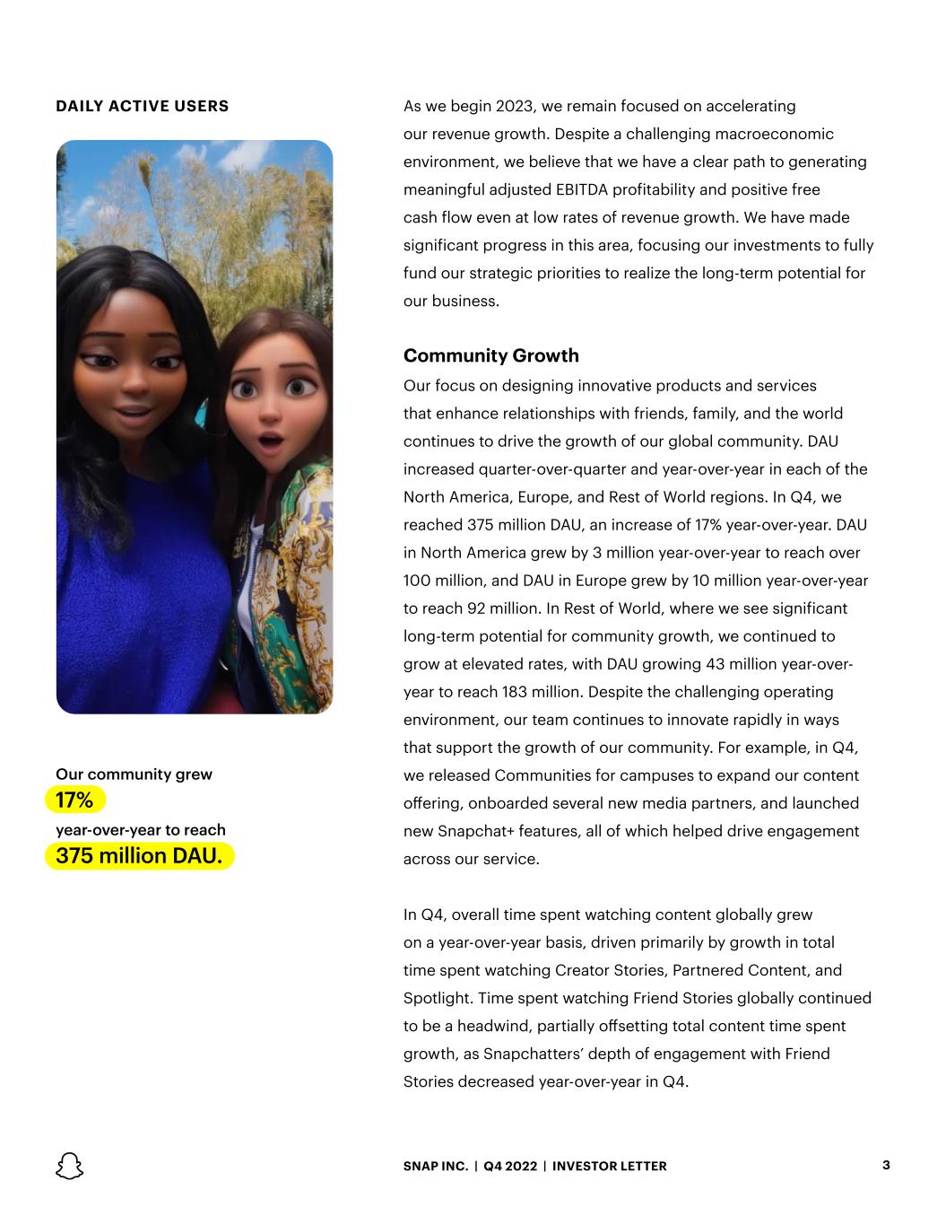 DAILY ACTIVE USERS Our community grew 17% year-over-year to reach 375 million DAU. 3 As we begin 2023, we remain focused on accelerating our revenue growth. Despite a challenging macroeconomic environment, we believe that we have a clear path to generating meaningful adjusted EBITDA profitability and positive free cash flow even at low rates of revenue growth. We have made significant progress in this area, focusing our investments to fully fund our strategic priorities to realize the long-term potential for our business. Community Growth Our focus on designing innovative products and services that enhance relationships with friends, family, and the world continues to drive the growth of our global community. DAU increased quarter-over-quarter and year-over-year in each of the North America, Europe, and Rest of World regions. In Q4, we reached 375 million DAU, an increase of 17% year-over-year. DAU in North America grew by 3 million year-over-year to reach over 100 million, and DAU in Europe grew by 10 million year-over-year to reach 92 million. In Rest of World, where we see significant long-term potential for community growth, we continued to grow at elevated rates, with DAU growing 43 million year-over- year to reach 183 million. Despite the challenging operating environment, our team continues to innovate rapidly in ways that support the growth of our community. For example, in Q4, we released Communities for campuses to expand our content offering, onboarded several new media partners, and launched new Snapchat+ features, all of which helped drive engagement across our service. In Q4, overall time spent watching content globally grew on a year-over-year basis, driven primarily by growth in total time spent watching Creator Stories, Partnered Content, and Spotlight. Time spent watching Friend Stories globally continued to be a headwind, partially offsetting total content time spent growth, as Snapchatters’ depth of engagement with Friend Stories decreased year-over-year in Q4. SNAP INC. | Q4 2022 | INVESTOR LETTER