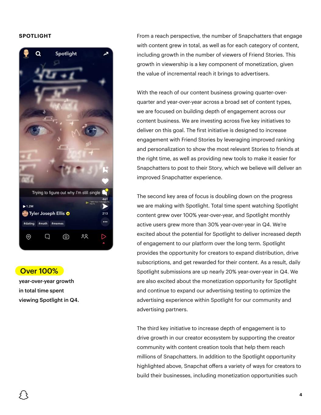SPOTLIGHT Over 100% year-over-year growth in total time spent viewing Spotlight in Q4. 4 From a reach perspective, the number of Snapchatters that engage with content grew in total, as well as for each category of content, including growth in the number of viewers of Friend Stories. This growth in viewership is a key component of monetization, given the value of incremental reach it brings to advertisers. With the reach of our content business growing quarter-over- quarter and year-over-year across a broad set of content types, we are focused on building depth of engagement across our content business. We are investing across five key initiatives to deliver on this goal. The first initiative is designed to increase engagement with Friend Stories by leveraging improved ranking and personalization to show the most relevant Stories to friends at the right time, as well as providing new tools to make it easier for Snapchatters to post to their Story, which we believe will deliver an improved Snapchatter experience. The second key area of focus is doubling down on the progress we are making with Spotlight. Total time spent watching Spotlight content grew over 100% year-over-year, and Spotlight monthly active users grew more than 30% year-over-year in Q4. We’re excited about the potential for Spotlight to deliver increased depth of engagement to our platform over the long term. Spotlight provides the opportunity for creators to expand distribution, drive subscriptions, and get rewarded for their content. As a result, daily Spotlight submissions are up nearly 20% year-over-year in Q4. We are also excited about the monetization opportunity for Spotlight and continue to expand our advertising testing to optimize the advertising experience within Spotlight for our community and advertising partners. The third key initiative to increase depth of engagement is to drive growth in our creator ecosystem by supporting the creator community with content creation tools that help them reach millions of Snapchatters. In addition to the Spotlight opportunity highlighted above, Snapchat offers a variety of ways for creators to build their businesses, including monetization opportunities such