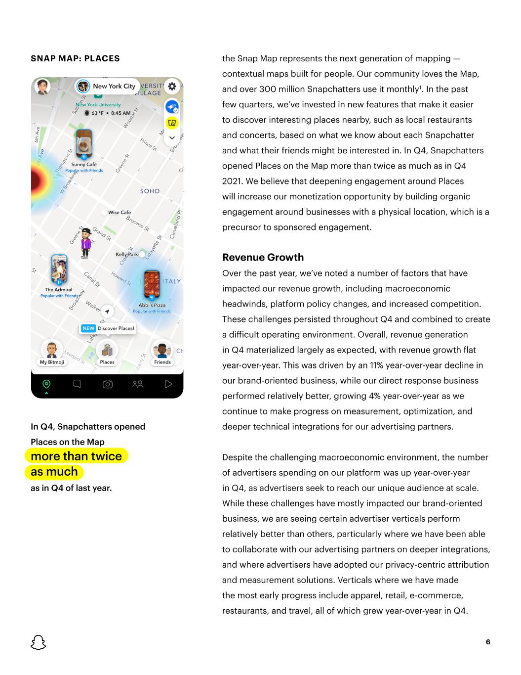 SNAP MAP: PLACES In Q4, Snapchatters opened Places on the Map more than twice as much as in Q4 of last year. 6 the Snap Map represents the next generation of mapping — contextual maps built for people. Our community loves the Map, and over 300 million Snapchatters use it monthly1. In the past few quarters, we’ve invested in new features that make it easier to discover interesting places nearby, such as local restaurants and concerts, based on what we know about each Snapchatter and what their friends might be interested in. In Q4, Snapchatters opened Places on the Map more than twice as much as in Q4 2021. We believe that deepening engagement around Places will increase our monetization opportunity by building organic engagement around businesses with a physical location, which is a precursor to sponsored engagement. Revenue Growth Over the past year, we’ve noted a number of factors that have impacted our revenue growth, including macroeconomic headwinds, platform policy changes, and increased competition. These challenges persisted throughout Q4 and combined to create a difficult operating environment. Overall, revenue generation in Q4 materialized largely as expected, with revenue growth flat year-over-year. This was driven by an 11% year-over-year decline in our brand-oriented business, while our direct response business performed relatively better, growing 4% year-over-year as we continue to make progress on measurement, optimization, and deeper technical integrations for our advertising partners. Despite the challenging macroeconomic environment, the number of advertisers spending on our platform was up year-over-year in Q4, as advertisers seek to reach our unique audience at scale. While these challenges have mostly impacted our brand-oriented business, we are seeing certain advertiser verticals perform relatively better than others, particularly where we have been able to collaborate with our advertising partners on deeper integrations, and where advertisers have adopted our privacy-centric attribution and measurement solutions. Verticals where we have made the most early progress include apparel, retail, e-commerce, restaurants, and travel, all of which grew year-over-year in Q4.