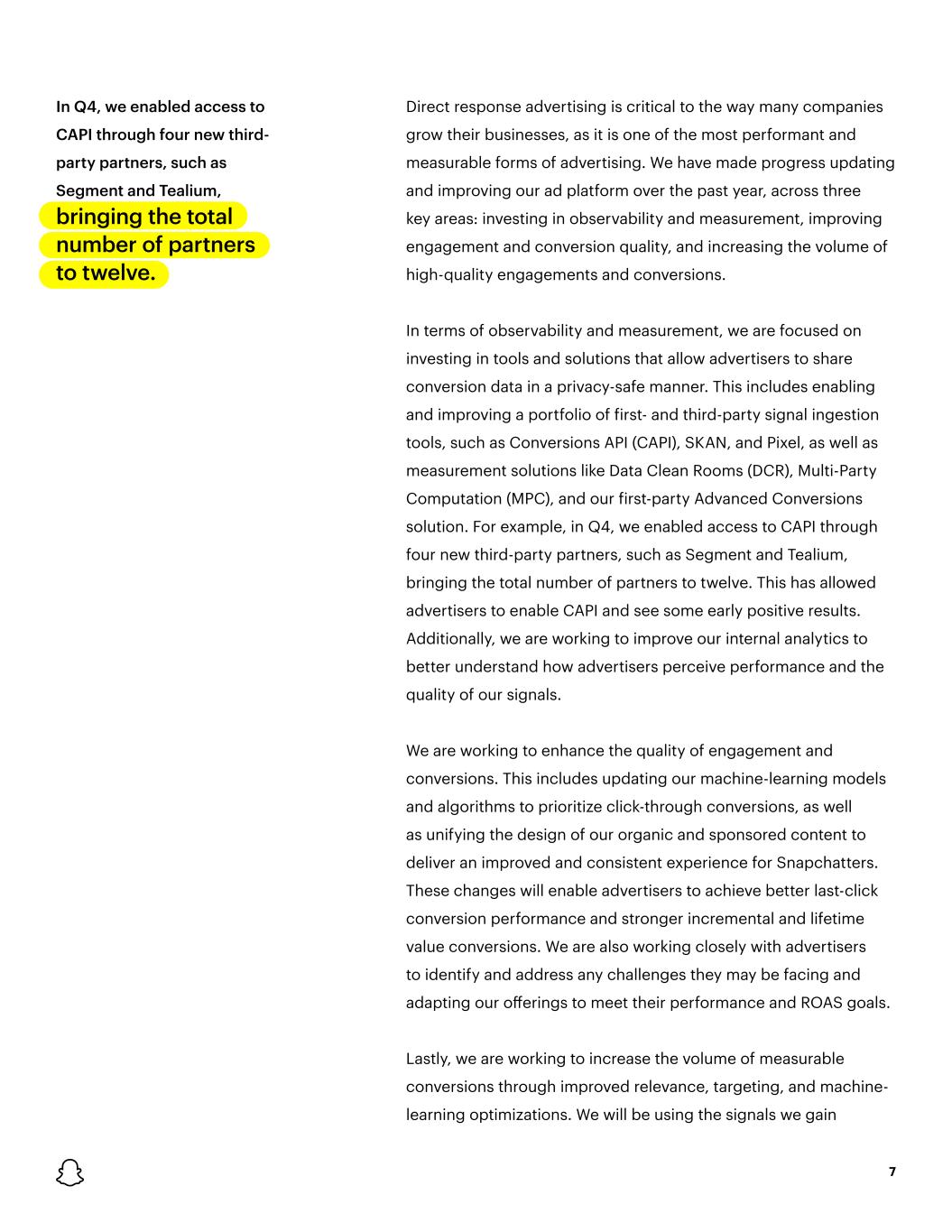 In Q4, we enabled access to CAPI through four new third- party partners, such as Segment and Tealium, bringing the total number of partners to twelve. 7 Direct response advertising is critical to the way many companies grow their businesses, as it is one of the most performant and measurable forms of advertising. We have made progress updating and improving our ad platform over the past year, across three key areas: investing in observability and measurement, improving engagement and conversion quality, and increasing the volume of high-quality engagements and conversions. In terms of observability and measurement, we are focused on investing in tools and solutions that allow advertisers to share conversion data in a privacy-safe manner. This includes enabling and improving a portfolio of first- and third-party signal ingestion tools, such as Conversions API (CAPI), SKAN, and Pixel, as well as measurement solutions like Data Clean Rooms (DCR), Multi-Party Computation (MPC), and our first-party Advanced Conversions solution. For example, in Q4, we enabled access to CAPI through four new third-party partners, such as Segment and Tealium, bringing the total number of partners to twelve. This has allowed advertisers to enable CAPI and see some early positive results. Additionally, we are working to improve our internal analytics to better understand how advertisers perceive performance and the quality of our signals. We are working to enhance the quality of engagement and conversions. This includes updating our machine-learning models and algorithms to prioritize click-through conversions, as well as unifying the design of our organic and sponsored content to deliver an improved and consistent experience for Snapchatters. These changes will enable advertisers to achieve better last-click conversion performance and stronger incremental and lifetime value conversions. We are also working closely with advertisers to identify and address any challenges they may be facing and adapting our offerings to meet their performance and ROAS goals. Lastly, we are working to increase the volume of measurable conversions through improved relevance, targeting, and machine- learning optimizations. We will be using the signals we gain