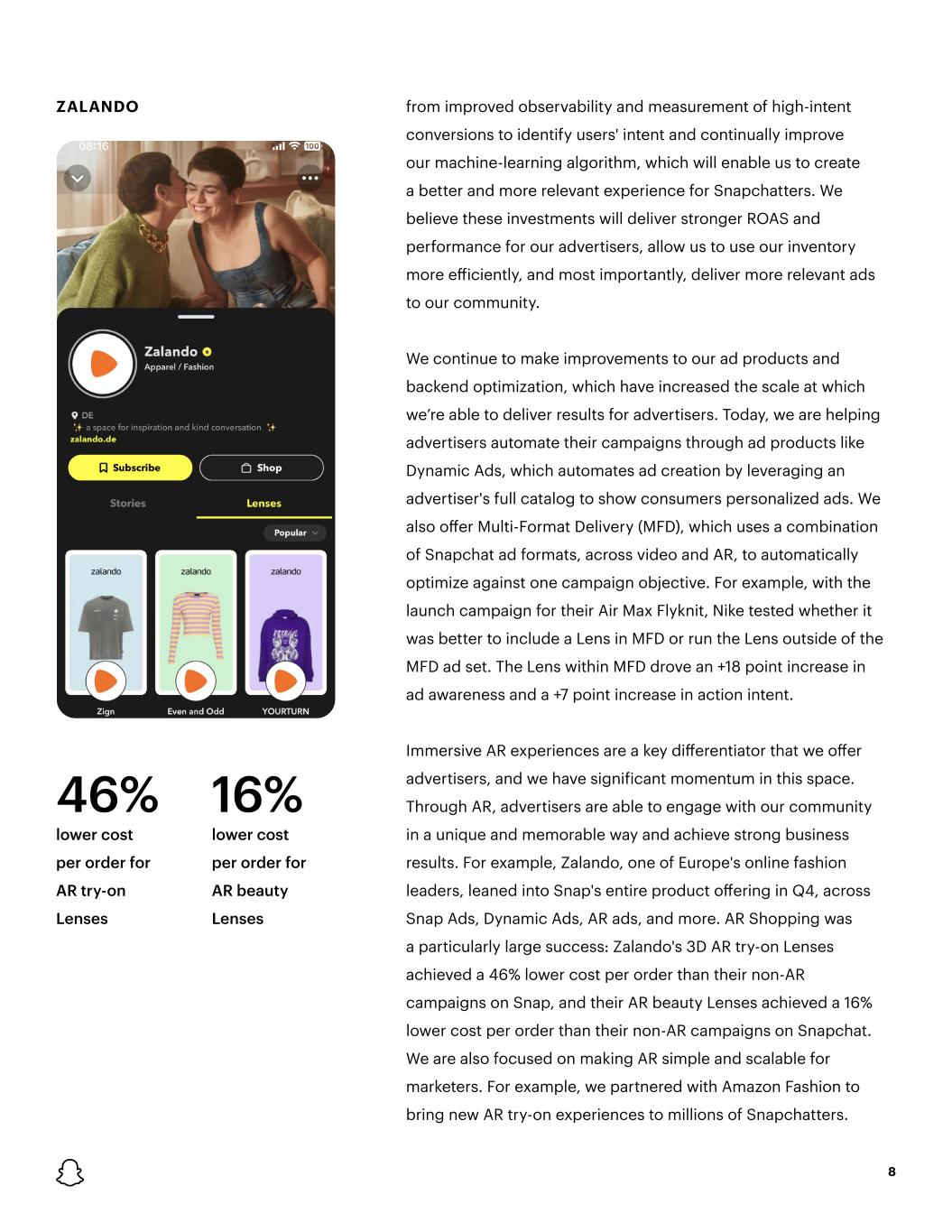 46% 16% lower cost per order for AR try-on Lenses lower cost per order for AR beauty Lenses ZALANDO 8 from improved observability and measurement of high-intent conversions to identify users' intent and continually improve our machine-learning algorithm, which will enable us to create a better and more relevant experience for Snapchatters. We believe these investments will deliver stronger ROAS and performance for our advertisers, allow us to use our inventory more efficiently, and most importantly, deliver more relevant ads to our community. We continue to make improvements to our ad products and backend optimization, which have increased the scale at which we’re able to deliver results for advertisers. Today, we are helping advertisers automate their campaigns through ad products like Dynamic Ads, which automates ad creation by leveraging an advertiser's full catalog to show consumers personalized ads. We also offer Multi-Format Delivery (MFD), which uses a combination of Snapchat ad formats, across video and AR, to automatically optimize against one campaign objective. For example, with the launch campaign for their Air Max Flyknit, Nike tested whether it was better to include a Lens in MFD or run the Lens outside of the MFD ad set. The Lens within MFD drove an +18 point increase in ad awareness and a +7 point increase in action intent. Immersive AR experiences are a key differentiator that we offer advertisers, and we have significant momentum in this space. Through AR, advertisers are able to engage with our community in a unique and memorable way and achieve strong business results. For example, Zalando, one of Europe's online fashion leaders, leaned into Snap's entire product offering in Q4, across Snap Ads, Dynamic Ads, AR ads, and more. AR Shopping was a particularly large success: Zalando's 3D AR try-on Lenses achieved a 46% lower cost per order than their non-AR campaigns on Snap, and their AR beauty Lenses achieved a 16% lower cost per order than their non-AR campaigns on Snapchat. We are also focused on making AR simple and scalable for marketers. For example, we partnered with Amazon Fashion to bring new AR try-on experiences to millions of Snapchatters.