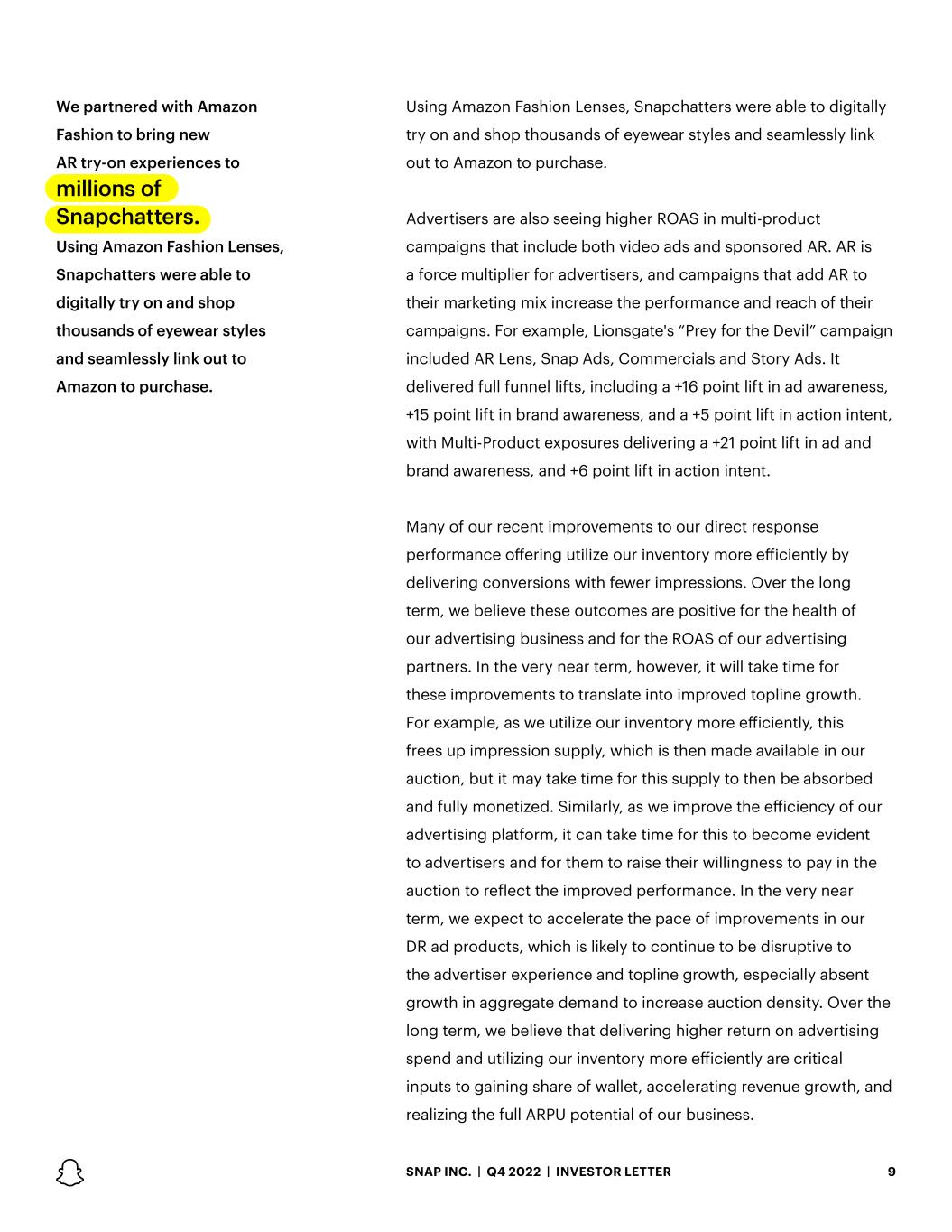 We partnered with Amazon Fashion to bring new AR try-on experiences to millions of Snapchatters. Using Amazon Fashion Lenses, Snapchatters were able to digitally try on and shop thousands of eyewear styles and seamlessly link out to Amazon to purchase. 9SNAP INC. | Q4 2022 | INVESTOR LETTER Using Amazon Fashion Lenses, Snapchatters were able to digitally try on and shop thousands of eyewear styles and seamlessly link out to Amazon to purchase. Advertisers are also seeing higher ROAS in multi-product campaigns that include both video ads and sponsored AR. AR is a force multiplier for advertisers, and campaigns that add AR to their marketing mix increase the performance and reach of their campaigns. For example, Lionsgate's “Prey for the Devil” campaign included AR Lens, Snap Ads, Commercials and Story Ads. It delivered full funnel lifts, including a +16 point lift in ad awareness, +15 point lift in brand awareness, and a +5 point lift in action intent, with Multi-Product exposures delivering a +21 point lift in ad and brand awareness, and +6 point lift in action intent. Many of our recent improvements to our direct response performance offering utilize our inventory more efficiently by delivering conversions with fewer impressions. Over the long term, we believe these outcomes are positive for the health of our advertising business and for the ROAS of our advertising partners. In the very near term, however, it will take time for these improvements to translate into improved topline growth. For example, as we utilize our inventory more efficiently, this frees up impression supply, which is then made available in our auction, but it may take time for this supply to then be absorbed and fully monetized. Similarly, as we improve the efficiency of our advertising platform, it can take time for this to become evident to advertisers and for them to raise their willingness to pay in the auction to reflect the improved performance. In the very near term, we expect to accelerate the pace of improvements in our DR ad products, which is likely to continue to be disruptive to the advertiser experience and topline growth, especially absent growth in aggregate demand to increase auction density. Over the long term, we believe that delivering higher return on advertising spend and utilizing our inventory more efficiently are critical inputs to gaining share of wallet, accelerating revenue growth, and realizing the full ARPU potential of our business.