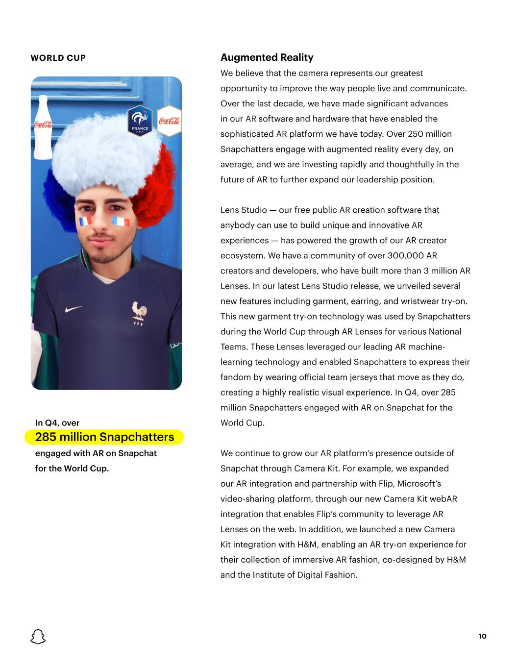 WORLD CUP In Q4, over 285 million Snapchatters engaged with AR on Snapchat for the World Cup. 10 Augmented Reality We believe that the camera represents our greatest opportunity to improve the way people live and communicate. Over the last decade, we have made significant advances in our AR software and hardware that have enabled the sophisticated AR platform we have today. Over 250 million Snapchatters engage with augmented reality every day, on average, and we are investing rapidly and thoughtfully in the future of AR to further expand our leadership position. Lens Studio — our free public AR creation software that anybody can use to build unique and innovative AR experiences — has powered the growth of our AR creator ecosystem. We have a community of over 300,000 AR creators and developers, who have built more than 3 million AR Lenses. In our latest Lens Studio release, we unveiled several new features including garment, earring, and wristwear try-on. This new garment try-on technology was used by Snapchatters during the World Cup through AR Lenses for various National Teams. These Lenses leveraged our leading AR machine- learning technology and enabled Snapchatters to express their fandom by wearing official team jerseys that move as they do, creating a highly realistic visual experience. In Q4, over 285 million Snapchatters engaged with AR on Snapchat for the World Cup. We continue to grow our AR platform’s presence outside of Snapchat through Camera Kit. For example, we expanded our AR integration and partnership with Flip, Microsoft’s video-sharing platform, through our new Camera Kit webAR integration that enables Flip’s community to leverage AR Lenses on the web. In addition, we launched a new Camera Kit integration with H&M, enabling an AR try-on experience for their collection of immersive AR fashion, co-designed by H&M and the Institute of Digital Fashion.