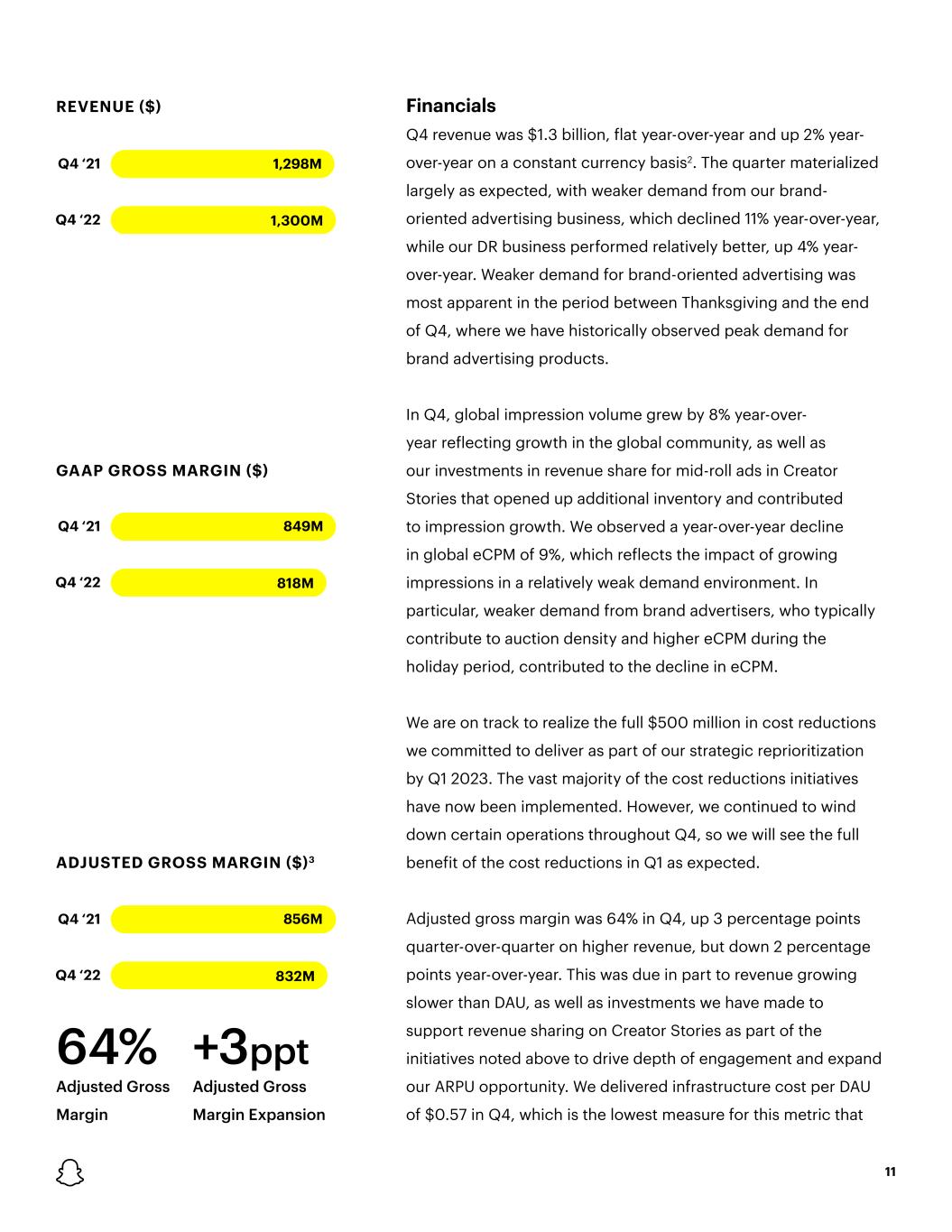 REVENUE ($) Q4 ‘21 1,298M Q4 ‘22 1,300M GAAP GROSS MARGIN ($) Q4 ‘21 849M Q4 ‘22 818M ADJUSTED GROSS MARGIN ($)3 64% +3ppt Adjusted Gross Margin Adjusted Gross Margin Expansion Q4 ‘21 856M Q4 ‘22 832M 11 Financials Q4 revenue was $1.3 billion, flat year-over-year and up 2% year- over-year on a constant currency basis2. The quarter materialized largely as expected, with weaker demand from our brand- oriented advertising business, which declined 11% year-over-year, while our DR business performed relatively better, up 4% year- over-year. Weaker demand for brand-oriented advertising was most apparent in the period between Thanksgiving and the end of Q4, where we have historically observed peak demand for brand advertising products. In Q4, global impression volume grew by 8% year-over- year reflecting growth in the global community, as well as our investments in revenue share for mid-roll ads in Creator Stories that opened up additional inventory and contributed to impression growth. We observed a year-over-year decline in global eCPM of 9%, which reflects the impact of growing impressions in a relatively weak demand environment. In particular, weaker demand from brand advertisers, who typically contribute to auction density and higher eCPM during the holiday period, contributed to the decline in eCPM. We are on track to realize the full $500 million in cost reductions we committed to deliver as part of our strategic reprioritization by Q1 2023. The vast majority of the cost reductions initiatives have now been implemented. However, we continued to wind down certain operations throughout Q4, so we will see the full benefit of the cost reductions in Q1 as expected. Adjusted gross margin was 64% in Q4, up 3 percentage points quarter-over-quarter on higher revenue, but down 2 percentage points year-over-year. This was due in part to revenue growing slower than DAU, as well as investments we have made to support revenue sharing on Creator Stories as part of the initiatives noted above to drive depth of engagement and expand our ARPU opportunity. We delivered infrastructure cost per DAU of $0.57 in Q4, which is the lowest measure for this metric that
