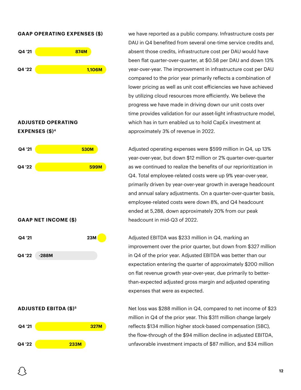 ADJUSTED OPERATING EXPENSES ($)4 Q4 ‘21 530M Q4 ‘22 599M GAAP OPERATING EXPENSES ($) Q4 ‘21 874M Q4 ‘22 1,106M ADJUSTED EBITDA ($)5 Q4 ‘21 327M Q4 ‘22 233M GAAP NET INCOME ($) Q4 ‘21 23M Q4 ‘22 -288M 12 we have reported as a public company. Infrastructure costs per DAU in Q4 benefited from several one-time service credits and, absent those credits, infrastructure cost per DAU would have been flat quarter-over-quarter, at $0.58 per DAU and down 13% year-over-year. The improvement in infrastructure cost per DAU compared to the prior year primarily reflects a combination of lower pricing as well as unit cost efficiencies we have achieved by utilizing cloud resources more efficiently. We believe the progress we have made in driving down our unit costs over time provides validation for our asset-light infrastructure model, which has in turn enabled us to hold CapEx investment at approximately 3% of revenue in 2022. Adjusted operating expenses were $599 million in Q4, up 13% year-over-year, but down $12 million or 2% quarter-over-quarter as we continued to realize the benefits of our reprioritization in Q4. Total employee-related costs were up 9% year-over-year, primarily driven by year-over-year growth in average headcount and annual salary adjustments. On a quarter-over-quarter basis, employee-related costs were down 8%, and Q4 headcount ended at 5,288, down approximately 20% from our peak headcount in mid-Q3 of 2022. Adjusted EBITDA was $233 million in Q4, marking an improvement over the prior quarter, but down from $327 million in Q4 of the prior year. Adjusted EBITDA was better than our expectation entering the quarter of approximately $200 million on flat revenue growth year-over-year, due primarily to better- than-expected adjusted gross margin and adjusted operating expenses that were as expected. Net loss was $288 million in Q4, compared to net income of $23 million in Q4 of the prior year. This $311 million change largely reflects $134 million higher stock-based compensation (SBC), the flow-through of the $94 million decline in adjusted EBITDA, unfavorable investment impacts of $87 million, and $34 million
