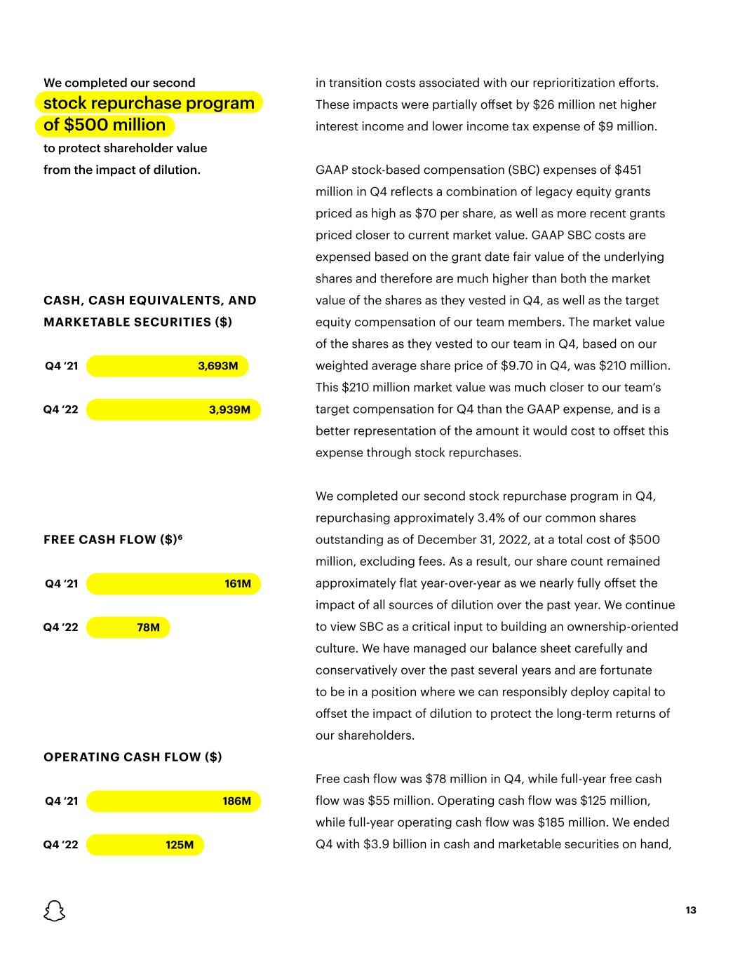 OPERATING CASH FLOW ($) Q4 ‘21 186M Q4 ‘22 125M We completed our second stock repurchase program of $500 million to protect shareholder value from the impact of dilution. CASH, CASH EQUIVALENTS, AND MARKETABLE SECURITIES ($) Q4 ‘21 3,693M Q4 ‘22 3,939M FREE CASH FLOW ($)6 Q4 ‘21 161M Q4 ‘22 78M 13 in transition costs associated with our reprioritization efforts. These impacts were partially offset by $26 million net higher interest income and lower income tax expense of $9 million. GAAP stock-based compensation (SBC) expenses of $451 million in Q4 reflects a combination of legacy equity grants priced as high as $70 per share, as well as more recent grants priced closer to current market value. GAAP SBC costs are expensed based on the grant date fair value of the underlying shares and therefore are much higher than both the market value of the shares as they vested in Q4, as well as the target equity compensation of our team members. The market value of the shares as they vested to our team in Q4, based on our weighted average share price of $9.70 in Q4, was $210 million. This $210 million market value was much closer to our team’s target compensation for Q4 than the GAAP expense, and is a better representation of the amount it would cost to offset this expense through stock repurchases. We completed our second stock repurchase program in Q4, repurchasing approximately 3.4% of our common shares outstanding as of December 31, 2022, at a total cost of $500 million, excluding fees. As a result, our share count remained approximately flat year-over-year as we nearly fully offset the impact of all sources of dilution over the past year. We continue to view SBC as a critical input to building an ownership-oriented culture. We have managed our balance sheet carefully and conservatively over the past several years and are fortunate to be in a position where we can responsibly deploy capital to offset the impact of dilution to protect the long-term returns of our shareholders. Free cash flow was $78 million in Q4, while full-year free cash flow was $55 million. Operating cash flow was $125 million, while full-year operating cash flow was $185 million. We ended Q4 with $3.9 billion in cash and marketable securities on hand,