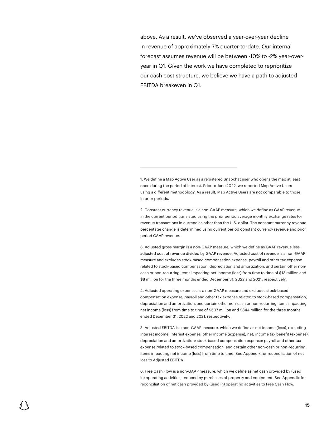 15 1. We define a Map Active User as a registered Snapchat user who opens the map at least once during the period of interest. Prior to June 2022, we reported Map Active Users using a different methodology. As a result, Map Active Users are not comparable to those in prior periods. 2. Constant currency revenue is a non-GAAP measure, which we define as GAAP revenue in the current period translated using the prior period average monthly exchange rates for revenue transactions in currencies other than the U.S. dollar. The constant currency revenue percentage change is determined using current period constant currency revenue and prior period GAAP revenue. 3. Adjusted gross margin is a non-GAAP measure, which we define as GAAP revenue less adjusted cost of revenue divided by GAAP revenue. Adjusted cost of revenue is a non-GAAP measure and excludes stock-based compensation expense, payroll and other tax expense related to stock-based compensation, depreciation and amortization, and certain other non- cash or non-recurring items impacting net income (loss) from time to time of $13 million and $8 million for the three months ended December 31, 2022 and 2021, respectively. 4. Adjusted operating expenses is a non-GAAP measure and excludes stock-based compensation expense, payroll and other tax expense related to stock-based compensation, depreciation and amortization, and certain other non-cash or non-recurring items impacting net income (loss) from time to time of $507 million and $344 million for the three months ended December 31, 2022 and 2021, respectively. 5. Adjusted EBITDA is a non-GAAP measure, which we define as net income (loss), excluding interest income; interest expense; other income (expense), net; income tax benefit (expense); depreciation and amortization; stock-based compensation expense; payroll and other tax expense related to stock-based compensation; and certain other non-cash or non-recurring items impacting net income (loss) from time to time. See Appendix for reconciliation of net loss to Adjusted EBITDA. 6. Free Cash Flow is a non-GAAP measure, which we define as net cash provided by (used in) operating activities, reduced by purchases of property and equipment. See Appendix for reconciliation of net cash provided by (used in) operating activities to Free Cash Flow. above. As a result, we’ve observed a year-over-year decline in revenue of approximately 7% quarter-to-date. Our internal forecast assumes revenue will be between -10% to -2% year-over- year in Q1. Given the work we have completed to reprioritize our cash cost structure, we believe we have a path to adjusted EBITDA breakeven in Q1.