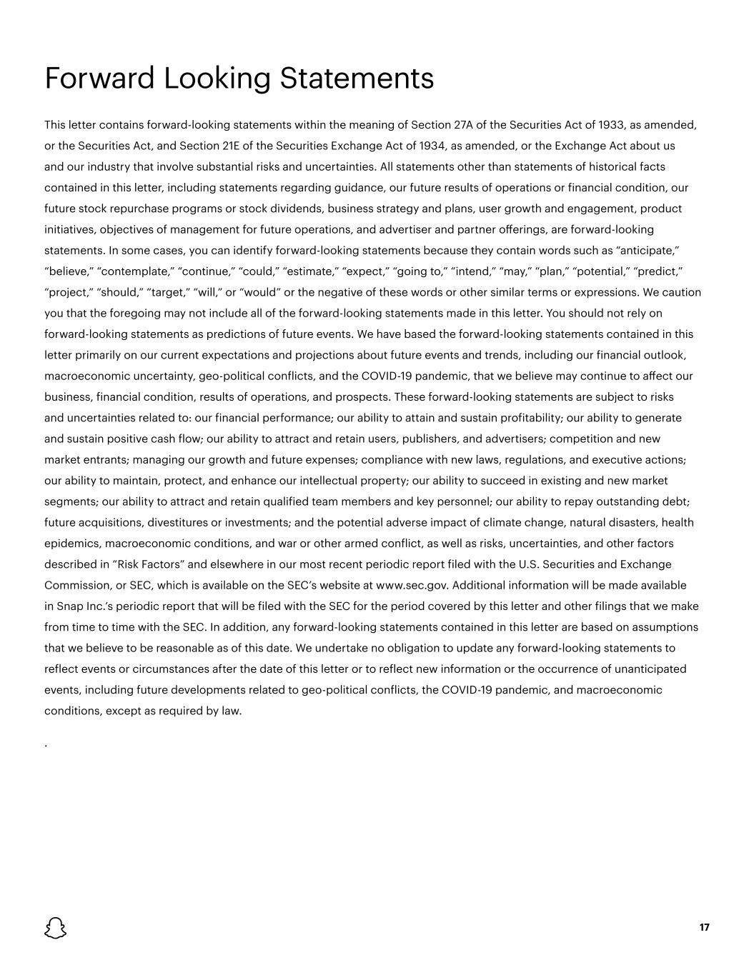 17 This letter contains forward-looking statements within the meaning of Section 27A of the Securities Act of 1933, as amended, or the Securities Act, and Section 21E of the Securities Exchange Act of 1934, as amended, or the Exchange Act about us and our industry that involve substantial risks and uncertainties. All statements other than statements of historical facts contained in this letter, including statements regarding guidance, our future results of operations or financial condition, our future stock repurchase programs or stock dividends, business strategy and plans, user growth and engagement, product initiatives, objectives of management for future operations, and advertiser and partner offerings, are forward-looking statements. In some cases, you can identify forward-looking statements because they contain words such as “anticipate,” “believe,” “contemplate,” “continue,” “could,” “estimate,” “expect,” “going to,” “intend,” “may,” “plan,” “potential,” “predict,” “project,” “should,” “target,” “will,” or “would” or the negative of these words or other similar terms or expressions. We caution you that the foregoing may not include all of the forward-looking statements made in this letter. You should not rely on forward-looking statements as predictions of future events. We have based the forward-looking statements contained in this letter primarily on our current expectations and projections about future events and trends, including our financial outlook, macroeconomic uncertainty, geo-political conflicts, and the COVID-19 pandemic, that we believe may continue to affect our business, financial condition, results of operations, and prospects. These forward-looking statements are subject to risks and uncertainties related to: our financial performance; our ability to attain and sustain profitability; our ability to generate and sustain positive cash flow; our ability to attract and retain users, publishers, and advertisers; competition and new market entrants; managing our growth and future expenses; compliance with new laws, regulations, and executive actions; our ability to maintain, protect, and enhance our intellectual property; our ability to succeed in existing and new market segments; our ability to attract and retain qualified team members and key personnel; our ability to repay outstanding debt; future acquisitions, divestitures or investments; and the potential adverse impact of climate change, natural disasters, health epidemics, macroeconomic conditions, and war or other armed conflict, as well as risks, uncertainties, and other factors described in “Risk Factors” and elsewhere in our most recent periodic report filed with the U.S. Securities and Exchange Commission, or SEC, which is available on the SEC’s website at www.sec.gov. Additional information will be made available in Snap Inc.’s periodic report that will be filed with the SEC for the period covered by this letter and other filings that we make from time to time with the SEC. In addition, any forward-looking statements contained in this letter are based on assumptions that we believe to be reasonable as of this date. We undertake no obligation to update any forward-looking statements to reflect events or circumstances after the date of this letter or to reflect new information or the occurrence of unanticipated events, including future developments related to geo-political conflicts, the COVID-19 pandemic, and macroeconomic conditions, except as required by law. . Forward Looking Statements