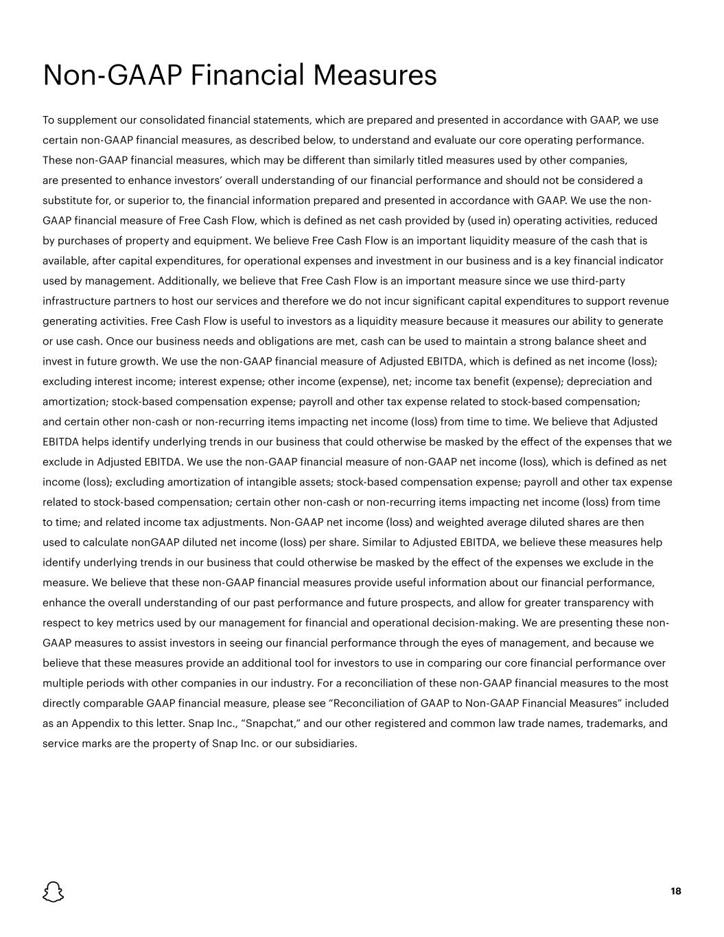 18 To supplement our consolidated financial statements, which are prepared and presented in accordance with GAAP, we use certain non-GAAP financial measures, as described below, to understand and evaluate our core operating performance. These non-GAAP financial measures, which may be different than similarly titled measures used by other companies, are presented to enhance investors’ overall understanding of our financial performance and should not be considered a substitute for, or superior to, the financial information prepared and presented in accordance with GAAP. We use the non- GAAP financial measure of Free Cash Flow, which is defined as net cash provided by (used in) operating activities, reduced by purchases of property and equipment. We believe Free Cash Flow is an important liquidity measure of the cash that is available, after capital expenditures, for operational expenses and investment in our business and is a key financial indicator used by management. Additionally, we believe that Free Cash Flow is an important measure since we use third-party infrastructure partners to host our services and therefore we do not incur significant capital expenditures to support revenue generating activities. Free Cash Flow is useful to investors as a liquidity measure because it measures our ability to generate or use cash. Once our business needs and obligations are met, cash can be used to maintain a strong balance sheet and invest in future growth. We use the non-GAAP financial measure of Adjusted EBITDA, which is defined as net income (loss); excluding interest income; interest expense; other income (expense), net; income tax benefit (expense); depreciation and amortization; stock-based compensation expense; payroll and other tax expense related to stock-based compensation; and certain other non-cash or non-recurring items impacting net income (loss) from time to time. We believe that Adjusted EBITDA helps identify underlying trends in our business that could otherwise be masked by the effect of the expenses that we exclude in Adjusted EBITDA. We use the non-GAAP financial measure of non-GAAP net income (loss), which is defined as net income (loss); excluding amortization of intangible assets; stock-based compensation expense; payroll and other tax expense related to stock-based compensation; certain other non-cash or non-recurring items impacting net income (loss) from time to time; and related income tax adjustments. Non-GAAP net income (loss) and weighted average diluted shares are then used to calculate nonGAAP diluted net income (loss) per share. Similar to Adjusted EBITDA, we believe these measures help identify underlying trends in our business that could otherwise be masked by the effect of the expenses we exclude in the measure. We believe that these non-GAAP financial measures provide useful information about our financial performance, enhance the overall understanding of our past performance and future prospects, and allow for greater transparency with respect to key metrics used by our management for financial and operational decision-making. We are presenting these non- GAAP measures to assist investors in seeing our financial performance through the eyes of management, and because we believe that these measures provide an additional tool for investors to use in comparing our core financial performance over multiple periods with other companies in our industry. For a reconciliation of these non-GAAP financial measures to the most directly comparable GAAP financial measure, please see “Reconciliation of GAAP to Non-GAAP Financial Measures” included as an Appendix to this letter. Snap Inc., “Snapchat,” and our other registered and common law trade names, trademarks, and service marks are the property of Snap Inc. or our subsidiaries. Non-GAAP Financial Measures