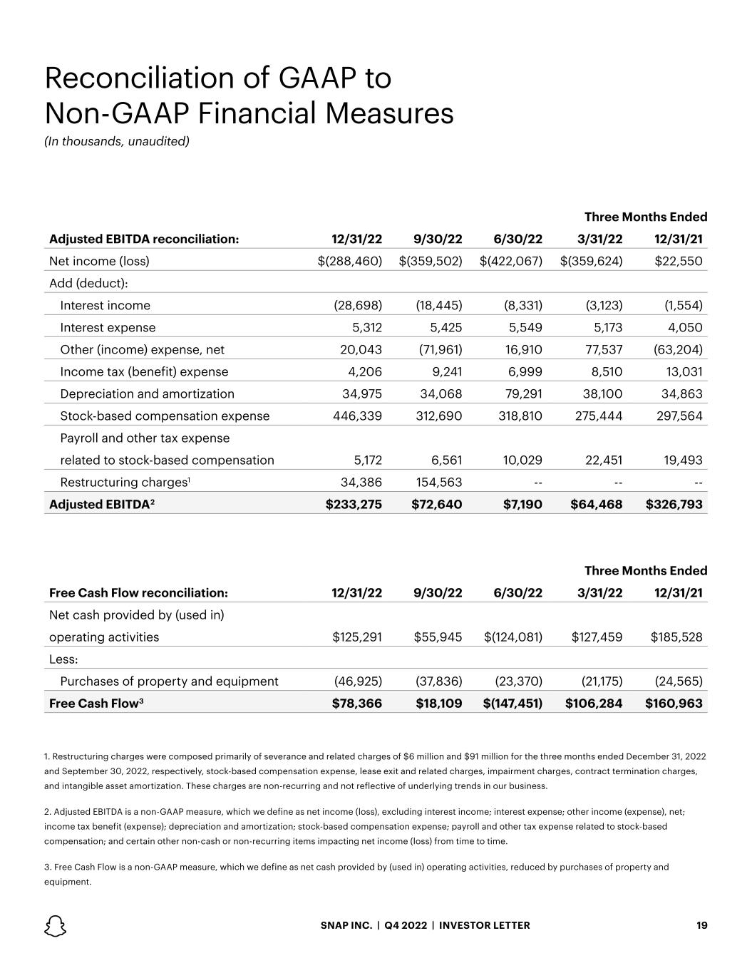 19SNAP INC. | Q4 2022 | INVESTOR LETTER Three Months Ended Adjusted EBITDA reconciliation: 12/31/22 9/30/22 6/30/22 3/31/22 12/31/21 Net income (loss) $(288,460) $(359,502) $(422,067) $(359,624) $22,550 Add (deduct): Interest income (28,698) (18,445) (8,331) (3,123) (1,554) Interest expense 5,312 5,425 5,549 5,173 4,050 Other (income) expense, net 20,043 (71,961) 16,910 77,537 (63,204) Income tax (benefit) expense 4,206 9,241 6,999 8,510 13,031 Depreciation and amortization 34,975 34,068 79,291 38,100 34,863 Stock-based compensation expense 446,339 312,690 318,810 275,444 297,564 Payroll and other tax expense related to stock-based compensation 5,172 6,561 10,029 22,451 19,493 Restructuring charges1 34,386 154,563 -- -- -- Adjusted EBITDA2 $233,275 $72,640 $7,190 $64,468 $326,793 Three Months Ended Free Cash Flow reconciliation: 12/31/22 9/30/22 6/30/22 3/31/22 12/31/21 Net cash provided by (used in) operating activities $125,291 $55,945 $(124,081) $127,459 $185,528 Less: Purchases of property and equipment (46,925) (37,836) (23,370) (21,175) (24,565) Free Cash Flow3 $78,366 $18,109 $(147,451) $106,284 $160,963 Reconciliation of GAAP to Non-GAAP Financial Measures (In thousands, unaudited) 1. Restructuring charges were composed primarily of severance and related charges of $6 million and $91 million for the three months ended December 31, 2022 and September 30, 2022, respectively, stock-based compensation expense, lease exit and related charges, impairment charges, contract termination charges, and intangible asset amortization. These charges are non-recurring and not reflective of underlying trends in our business. 2. Adjusted EBITDA is a non-GAAP measure, which we define as net income (loss), excluding interest income; interest expense; other income (expense), net; income tax benefit (expense); depreciation and amortization; stock-based compensation expense; payroll and other tax expense related to stock-based compensation; and certain other non-cash or non-recurring items impacting net income (loss) from time to time. 3. Free Cash Flow is a non-GAAP measure, which we define as net cash provided by (used in) operating activities, reduced by purchases of property and equipment.
