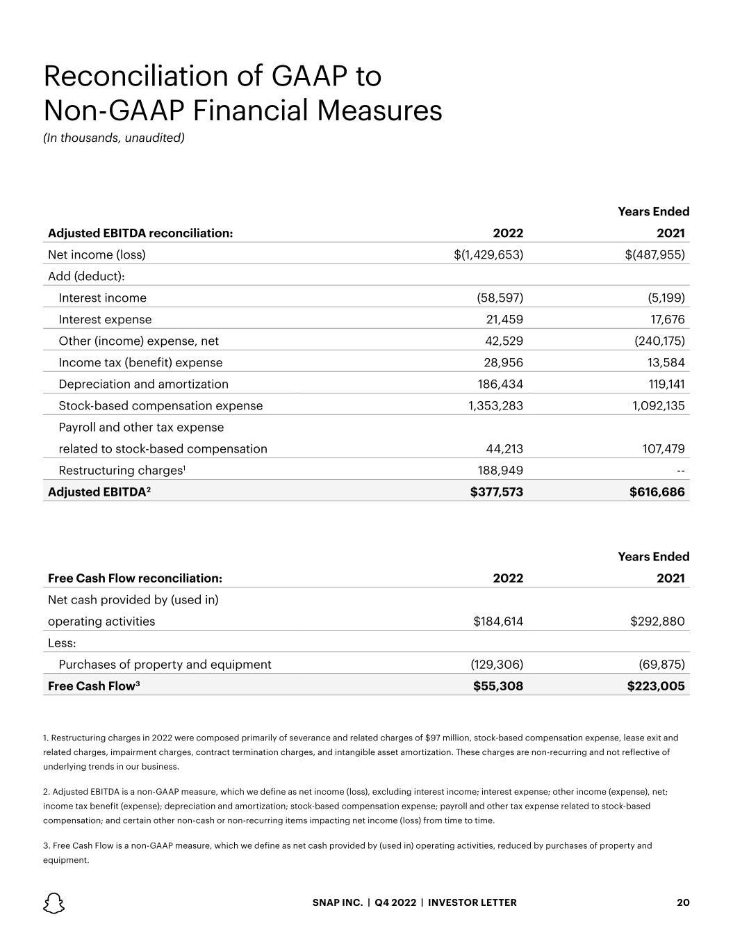 20SNAP INC. | Q4 2022 | INVESTOR LETTER Years Ended Adjusted EBITDA reconciliation: 2022 2021 Net income (loss) $(1,429,653) $(487,955) Add (deduct): Interest income (58,597) (5,199) Interest expense 21,459 17,676 Other (income) expense, net 42,529 (240,175) Income tax (benefit) expense 28,956 13,584 Depreciation and amortization 186,434 119,141 Stock-based compensation expense 1,353,283 1,092,135 Payroll and other tax expense related to stock-based compensation 44,213 107,479 Restructuring charges1 188,949 -- Adjusted EBITDA2 $377,573 $616,686 Years Ended Free Cash Flow reconciliation: 2022 2021 Net cash provided by (used in) operating activities $184,614 $292,880 Less: Purchases of property and equipment (129,306) (69,875) Free Cash Flow3 $55,308 $223,005 Reconciliation of GAAP to Non-GAAP Financial Measures (In thousands, unaudited) 1. Restructuring charges in 2022 were composed primarily of severance and related charges of $97 million, stock-based compensation expense, lease exit and related charges, impairment charges, contract termination charges, and intangible asset amortization. These charges are non-recurring and not reflective of underlying trends in our business. 2. Adjusted EBITDA is a non-GAAP measure, which we define as net income (loss), excluding interest income; interest expense; other income (expense), net; income tax benefit (expense); depreciation and amortization; stock-based compensation expense; payroll and other tax expense related to stock-based compensation; and certain other non-cash or non-recurring items impacting net income (loss) from time to time. 3. Free Cash Flow is a non-GAAP measure, which we define as net cash provided by (used in) operating activities, reduced by purchases of property and equipment.