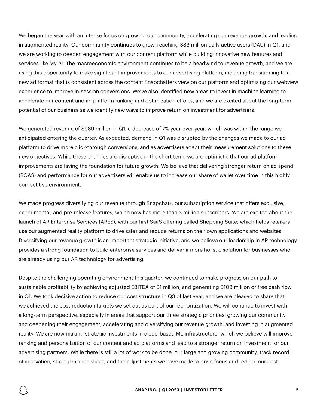 2SNAP INC. | Q1 2023 | INVESTOR LETTER We began the year with an intense focus on growing our community, accelerating our revenue growth, and leading in augmented reality. Our community continues to grow, reaching 383 million daily active users (DAU) in Q1, and we are working to deepen engagement with our content platform while building innovative new features and services like My AI. The macroeconomic environment continues to be a headwind to revenue growth, and we are using this opportunity to make significant improvements to our advertising platform, including transitioning to a new ad format that is consistent across the content Snapchatters view on our platform and optimizing our webview experience to improve in-session conversions. We’ve also identified new areas to invest in machine learning to accelerate our content and ad platform ranking and optimization efforts, and we are excited about the long-term potential of our business as we identify new ways to improve return on investment for advertisers. We generated revenue of $989 million in Q1, a decrease of 7% year-over-year, which was within the range we anticipated entering the quarter. As expected, demand in Q1 was disrupted by the changes we made to our ad platform to drive more click-through conversions, and as advertisers adapt their measurement solutions to these new objectives. While these changes are disruptive in the short term, we are optimistic that our ad platform improvements are laying the foundation for future growth. We believe that delivering stronger return on ad spend (ROAS) and performance for our advertisers will enable us to increase our share of wallet over time in this highly competitive environment. We made progress diversifying our revenue through Snapchat+, our subscription service that offers exclusive, experimental, and pre-release features, which now has more than 3 million subscribers. We are excited about the launch of AR Enterprise Services (ARES), with our first SaaS offering called Shopping Suite, which helps retailers use our augmented reality platform to drive sales and reduce returns on their own applications and websites. Diversifying our revenue growth is an important strategic initiative, and we believe our leadership in AR technology provides a strong foundation to build enterprise services and deliver a more holistic solution for businesses who are already using our AR technology for advertising. Despite the challenging operating environment this quarter, we continued to make progress on our path to sustainable profitability by achieving adjusted EBITDA of $1 million, and generating $103 million of free cash flow in Q1. We took decisive action to reduce our cost structure in Q3 of last year, and we are pleased to share that we achieved the cost-reduction targets we set out as part of our reprioritization. We will continue to invest with a long-term perspective, especially in areas that support our three strategic priorities: growing our community and deepening their engagement, accelerating and diversifying our revenue growth, and investing in augmented reality. We are now making strategic investments in cloud-based ML infrastructure, which we believe will improve ranking and personalization of our content and ad platforms and lead to a stronger return on investment for our advertising partners. While there is still a lot of work to be done, our large and growing community, track record of innovation, strong balance sheet, and the adjustments we have made to drive focus and reduce our cost