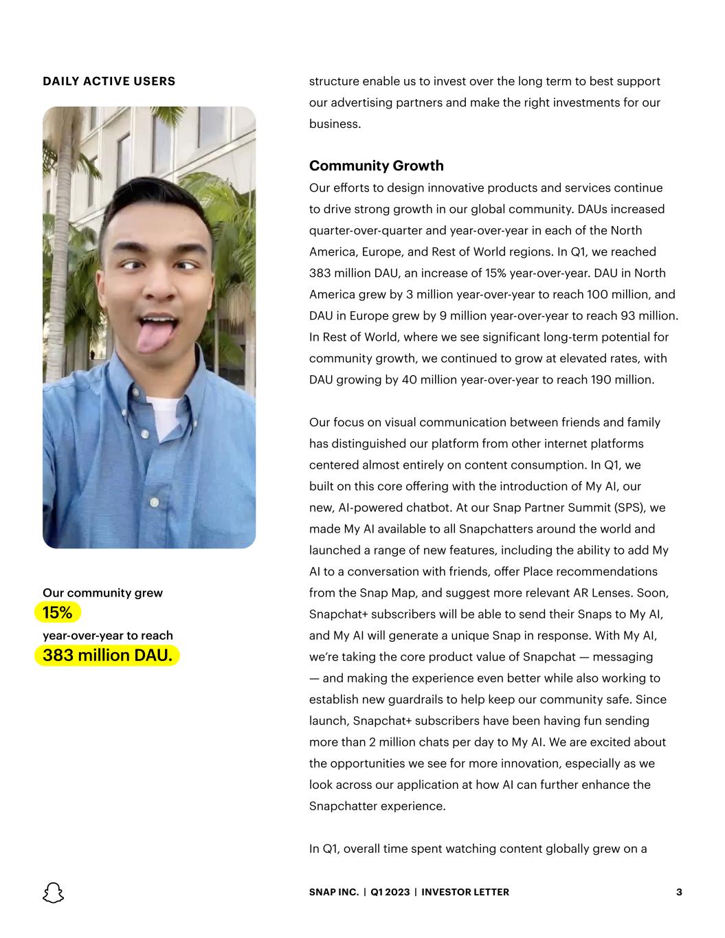 DAILY ACTIVE USERS Our community grew 15% year-over-year to reach 383 million DAU. 3SNAP INC. | Q1 2023 | INVESTOR LETTER structure enable us to invest over the long term to best support our advertising partners and make the right investments for our business. Community Growth Our efforts to design innovative products and services continue to drive strong growth in our global community. DAUs increased quarter-over-quarter and year-over-year in each of the North America, Europe, and Rest of World regions. In Q1, we reached 383 million DAU, an increase of 15% year-over-year. DAU in North America grew by 3 million year-over-year to reach 100 million, and DAU in Europe grew by 9 million year-over-year to reach 93 million. In Rest of World, where we see significant long-term potential for community growth, we continued to grow at elevated rates, with DAU growing by 40 million year-over-year to reach 190 million. Our focus on visual communication between friends and family has distinguished our platform from other internet platforms centered almost entirely on content consumption. In Q1, we built on this core offering with the introduction of My AI, our new, AI-powered chatbot. At our Snap Partner Summit (SPS), we made My AI available to all Snapchatters around the world and launched a range of new features, including the ability to add My AI to a conversation with friends, offer Place recommendations from the Snap Map, and suggest more relevant AR Lenses. Soon, Snapchat+ subscribers will be able to send their Snaps to My AI, and My AI will generate a unique Snap in response. With My AI, we’re taking the core product value of Snapchat — messaging — and making the experience even better while also working to establish new guardrails to help keep our community safe. Since launch, Snapchat+ subscribers have been having fun sending more than 2 million chats per day to My AI. We are excited about the opportunities we see for more innovation, especially as we look across our application at how AI can further enhance the Snapchatter experience. In Q1, overall time spent watching content globally grew on a