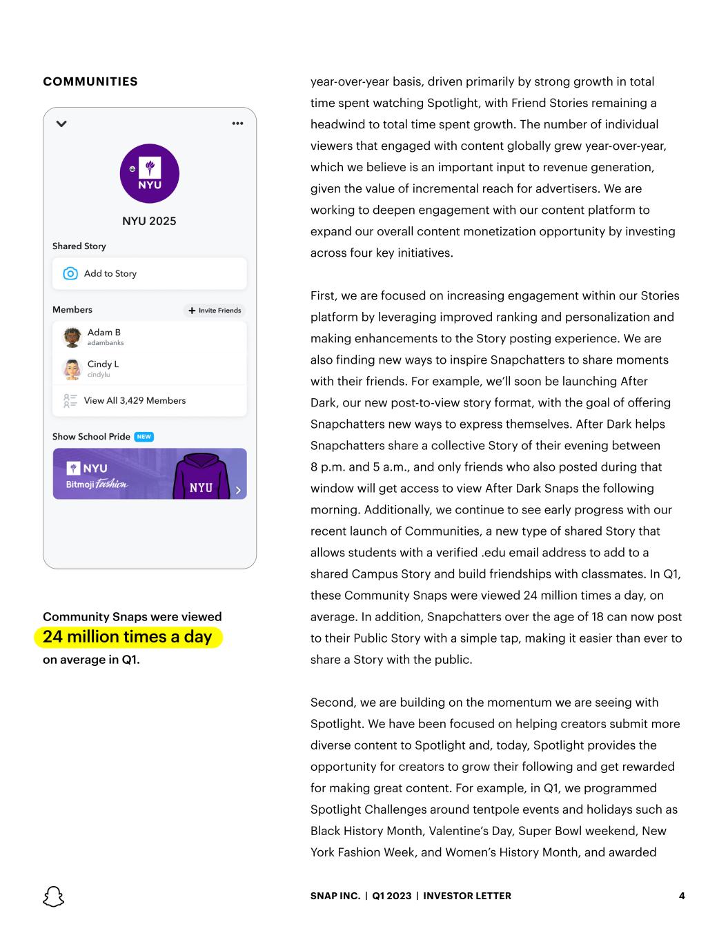 COMMUNITIES Community Snaps were viewed 24 million times a day on average in Q1. 4SNAP INC. | Q1 2023 | INVESTOR LETTER year-over-year basis, driven primarily by strong growth in total time spent watching Spotlight, with Friend Stories remaining a headwind to total time spent growth. The number of individual viewers that engaged with content globally grew year-over-year, which we believe is an important input to revenue generation, given the value of incremental reach for advertisers. We are working to deepen engagement with our content platform to expand our overall content monetization opportunity by investing across four key initiatives. First, we are focused on increasing engagement within our Stories platform by leveraging improved ranking and personalization and making enhancements to the Story posting experience. We are also finding new ways to inspire Snapchatters to share moments with their friends. For example, we’ll soon be launching After Dark, our new post-to-view story format, with the goal of offering Snapchatters new ways to express themselves. After Dark helps Snapchatters share a collective Story of their evening between 8 p.m. and 5 a.m., and only friends who also posted during that window will get access to view After Dark Snaps the following morning. Additionally, we continue to see early progress with our recent launch of Communities, a new type of shared Story that allows students with a verified .edu email address to add to a shared Campus Story and build friendships with classmates. In Q1, these Community Snaps were viewed 24 million times a day, on average. In addition, Snapchatters over the age of 18 can now post to their Public Story with a simple tap, making it easier than ever to share a Story with the public. Second, we are building on the momentum we are seeing with Spotlight. We have been focused on helping creators submit more diverse content to Spotlight and, today, Spotlight provides the opportunity for creators to grow their following and get rewarded for making great content. For example, in Q1, we programmed Spotlight Challenges around tentpole events and holidays such as Black History Month, Valentine’s Day, Super Bowl weekend, New York Fashion Week, and Women’s History Month, and awarded