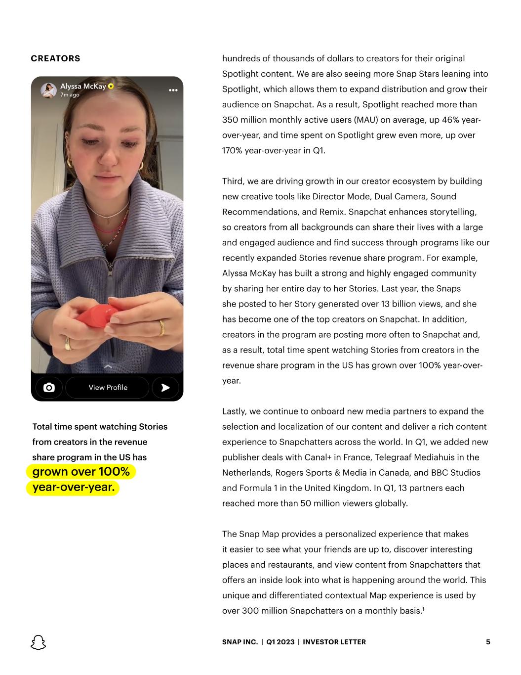CREATORS Total time spent watching Stories from creators in the revenue share program in the US has grown over 100% year-over-year. 5SNAP INC. | Q1 2023 | INVESTOR LETTER hundreds of thousands of dollars to creators for their original Spotlight content. We are also seeing more Snap Stars leaning into Spotlight, which allows them to expand distribution and grow their audience on Snapchat. As a result, Spotlight reached more than 350 million monthly active users (MAU) on average, up 46% year- over-year, and time spent on Spotlight grew even more, up over 170% year-over-year in Q1. Third, we are driving growth in our creator ecosystem by building new creative tools like Director Mode, Dual Camera, Sound Recommendations, and Remix. Snapchat enhances storytelling, so creators from all backgrounds can share their lives with a large and engaged audience and find success through programs like our recently expanded Stories revenue share program. For example, Alyssa McKay has built a strong and highly engaged community by sharing her entire day to her Stories. Last year, the Snaps she posted to her Story generated over 13 billion views, and she has become one of the top creators on Snapchat. In addition, creators in the program are posting more often to Snapchat and, as a result, total time spent watching Stories from creators in the revenue share program in the US has grown over 100% year-over- year. Lastly, we continue to onboard new media partners to expand the selection and localization of our content and deliver a rich content experience to Snapchatters across the world. In Q1, we added new publisher deals with Canal+ in France, Telegraaf Mediahuis in the Netherlands, Rogers Sports & Media in Canada, and BBC Studios and Formula 1 in the United Kingdom. In Q1, 13 partners each reached more than 50 million viewers globally. The Snap Map provides a personalized experience that makes it easier to see what your friends are up to, discover interesting places and restaurants, and view content from Snapchatters that offers an inside look into what is happening around the world. This unique and differentiated contextual Map experience is used by over 300 million Snapchatters on a monthly basis.1