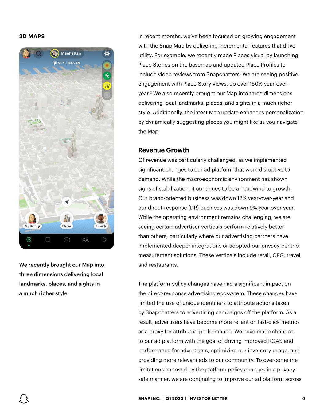 3D MAPS We recently brought our Map into three dimensions delivering local landmarks, places, and sights in a much richer style. 6SNAP INC. | Q1 2023 | INVESTOR LETTER In recent months, we’ve been focused on growing engagement with the Snap Map by delivering incremental features that drive utility. For example, we recently made Places visual by launching Place Stories on the basemap and updated Place Profiles to include video reviews from Snapchatters. We are seeing positive engagement with Place Story views, up over 150% year-over- year.2 We also recently brought our Map into three dimensions delivering local landmarks, places, and sights in a much richer style. Additionally, the latest Map update enhances personalization by dynamically suggesting places you might like as you navigate the Map. Revenue Growth Q1 revenue was particularly challenged, as we implemented significant changes to our ad platform that were disruptive to demand. While the macroeconomic environment has shown signs of stabilization, it continues to be a headwind to growth. Our brand-oriented business was down 12% year-over-year and our direct-response (DR) business was down 9% year-over-year. While the operating environment remains challenging, we are seeing certain advertiser verticals perform relatively better than others, particularly where our advertising partners have implemented deeper integrations or adopted our privacy-centric measurement solutions. These verticals include retail, CPG, travel, and restaurants. The platform policy changes have had a significant impact on the direct-response advertising ecosystem. These changes have limited the use of unique identifiers to attribute actions taken by Snapchatters to advertising campaigns off the platform. As a result, advertisers have become more reliant on last-click metrics as a proxy for attributed performance. We have made changes to our ad platform with the goal of driving improved ROAS and performance for advertisers, optimizing our inventory usage, and providing more relevant ads to our community. To overcome the limitations imposed by the platform policy changes in a privacy- safe manner, we are continuing to improve our ad platform across