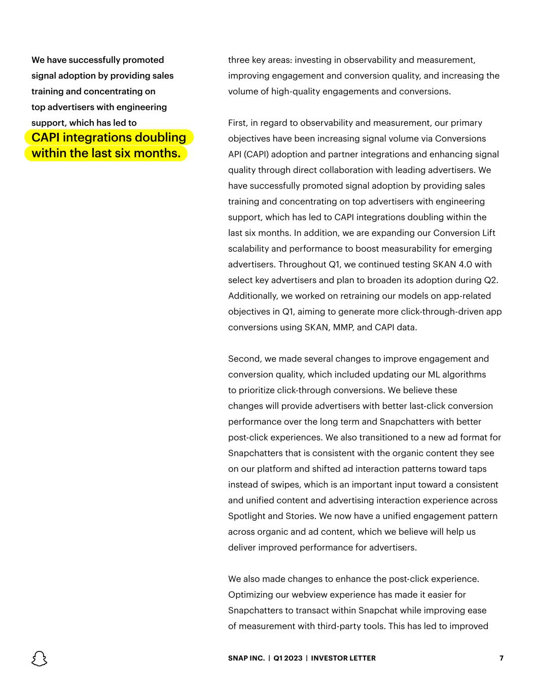 We have successfully promoted signal adoption by providing sales training and concentrating on top advertisers with engineering support, which has led to CAPI integrations doubling within the last six months. 7SNAP INC. | Q1 2023 | INVESTOR LETTER three key areas: investing in observability and measurement, improving engagement and conversion quality, and increasing the volume of high-quality engagements and conversions. First, in regard to observability and measurement, our primary objectives have been increasing signal volume via Conversions API (CAPI) adoption and partner integrations and enhancing signal quality through direct collaboration with leading advertisers. We have successfully promoted signal adoption by providing sales training and concentrating on top advertisers with engineering support, which has led to CAPI integrations doubling within the last six months. In addition, we are expanding our Conversion Lift scalability and performance to boost measurability for emerging advertisers. Throughout Q1, we continued testing SKAN 4.0 with select key advertisers and plan to broaden its adoption during Q2. Additionally, we worked on retraining our models on app-related objectives in Q1, aiming to generate more click-through-driven app conversions using SKAN, MMP, and CAPI data. Second, we made several changes to improve engagement and conversion quality, which included updating our ML algorithms to prioritize click-through conversions. We believe these changes will provide advertisers with better last-click conversion performance over the long term and Snapchatters with better post-click experiences. We also transitioned to a new ad format for Snapchatters that is consistent with the organic content they see on our platform and shifted ad interaction patterns toward taps instead of swipes, which is an important input toward a consistent and unified content and advertising interaction experience across Spotlight and Stories. We now have a unified engagement pattern across organic and ad content, which we believe will help us deliver improved performance for advertisers. We also made changes to enhance the post-click experience. Optimizing our webview experience has made it easier for Snapchatters to transact within Snapchat while improving ease of measurement with third-party tools. This has led to improved