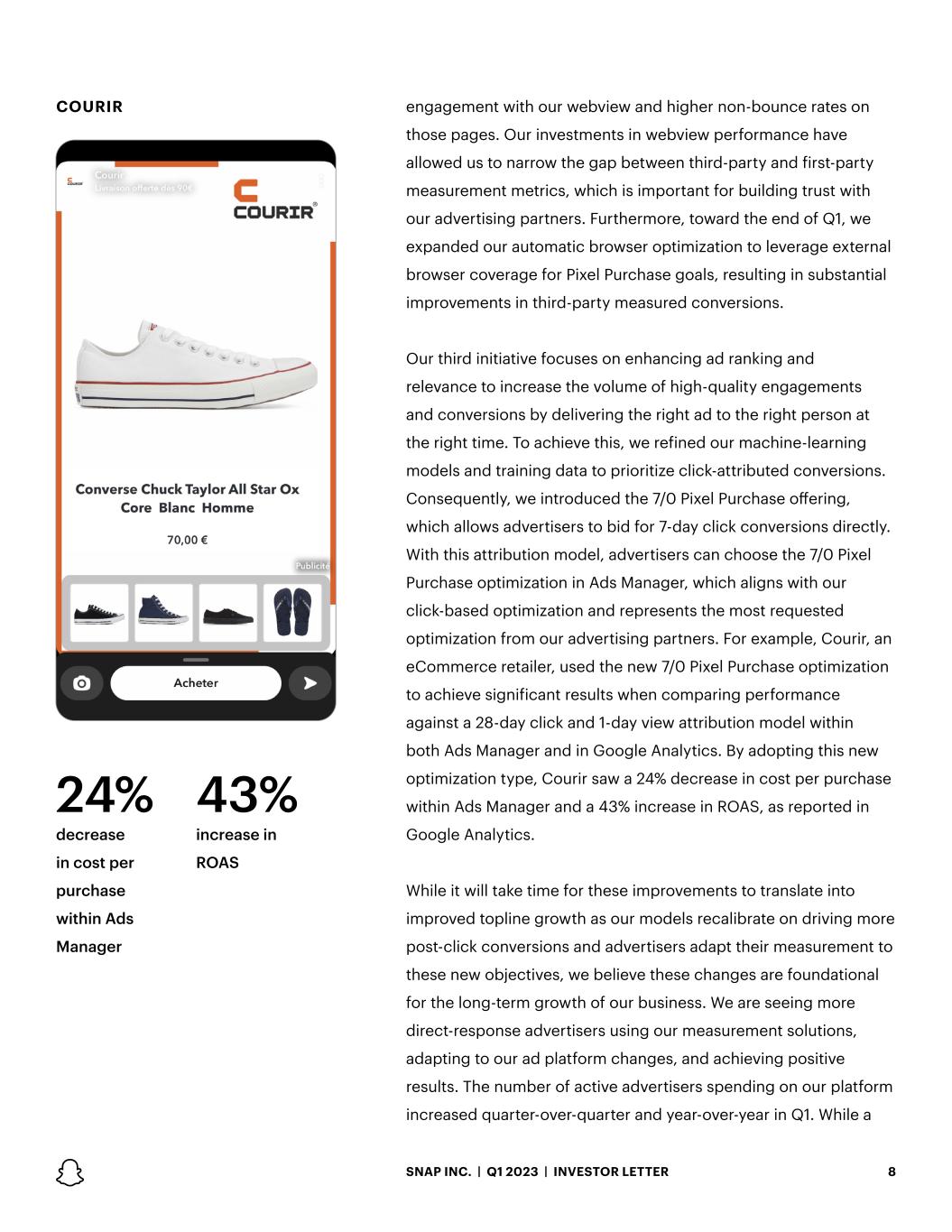 24% decrease in cost per purchase within Ads Manager COURIR 43% increase in ROAS 8SNAP INC. | Q1 2023 | INVESTOR LETTER engagement with our webview and higher non-bounce rates on those pages. Our investments in webview performance have allowed us to narrow the gap between third-party and first-party measurement metrics, which is important for building trust with our advertising partners. Furthermore, toward the end of Q1, we expanded our automatic browser optimization to leverage external browser coverage for Pixel Purchase goals, resulting in substantial improvements in third-party measured conversions. Our third initiative focuses on enhancing ad ranking and relevance to increase the volume of high-quality engagements and conversions by delivering the right ad to the right person at the right time. To achieve this, we refined our machine-learning models and training data to prioritize click-attributed conversions. Consequently, we introduced the 7/0 Pixel Purchase offering, which allows advertisers to bid for 7-day click conversions directly. With this attribution model, advertisers can choose the 7/0 Pixel Purchase optimization in Ads Manager, which aligns with our click-based optimization and represents the most requested optimization from our advertising partners. For example, Courir, an eCommerce retailer, used the new 7/0 Pixel Purchase optimization to achieve significant results when comparing performance against a 28-day click and 1-day view attribution model within both Ads Manager and in Google Analytics. By adopting this new optimization type, Courir saw a 24% decrease in cost per purchase within Ads Manager and a 43% increase in ROAS, as reported in Google Analytics. While it will take time for these improvements to translate into improved topline growth as our models recalibrate on driving more post-click conversions and advertisers adapt their measurement to these new objectives, we believe these changes are foundational for the long-term growth of our business. We are seeing more direct-response advertisers using our measurement solutions, adapting to our ad platform changes, and achieving positive results. The number of active advertisers spending on our platform increased quarter-over-quarter and year-over-year in Q1. While a
