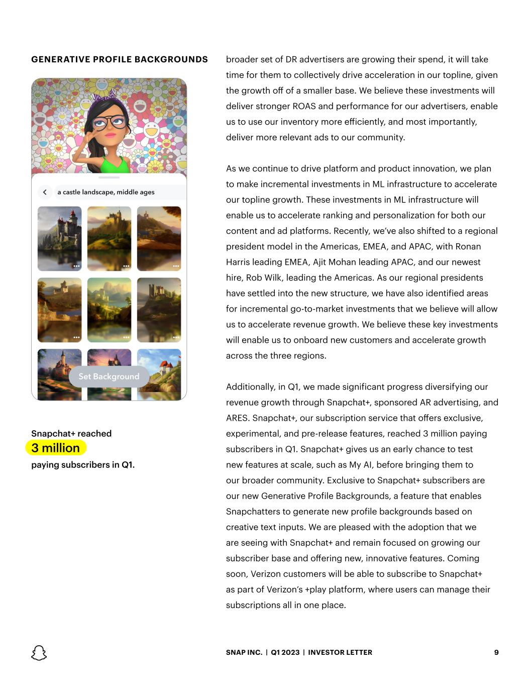 GENERATIVE PROFILE BACKGROUNDS Snapchat+ reached 3 million paying subscribers in Q1. 9SNAP INC. | Q1 2023 | INVESTOR LETTER broader set of DR advertisers are growing their spend, it will take time for them to collectively drive acceleration in our topline, given the growth off of a smaller base. We believe these investments will deliver stronger ROAS and performance for our advertisers, enable us to use our inventory more efficiently, and most importantly, deliver more relevant ads to our community. As we continue to drive platform and product innovation, we plan to make incremental investments in ML infrastructure to accelerate our topline growth. These investments in ML infrastructure will enable us to accelerate ranking and personalization for both our content and ad platforms. Recently, we’ve also shifted to a regional president model in the Americas, EMEA, and APAC, with Ronan Harris leading EMEA, Ajit Mohan leading APAC, and our newest hire, Rob Wilk, leading the Americas. As our regional presidents have settled into the new structure, we have also identified areas for incremental go-to-market investments that we believe will allow us to accelerate revenue growth. We believe these key investments will enable us to onboard new customers and accelerate growth across the three regions. Additionally, in Q1, we made significant progress diversifying our revenue growth through Snapchat+, sponsored AR advertising, and ARES. Snapchat+, our subscription service that offers exclusive, experimental, and pre-release features, reached 3 million paying subscribers in Q1. Snapchat+ gives us an early chance to test new features at scale, such as My AI, before bringing them to our broader community. Exclusive to Snapchat+ subscribers are our new Generative Profile Backgrounds, a feature that enables Snapchatters to generate new profile backgrounds based on creative text inputs. We are pleased with the adoption that we are seeing with Snapchat+ and remain focused on growing our subscriber base and offering new, innovative features. Coming soon, Verizon customers will be able to subscribe to Snapchat+ as part of Verizon’s +play platform, where users can manage their subscriptions all in one place.