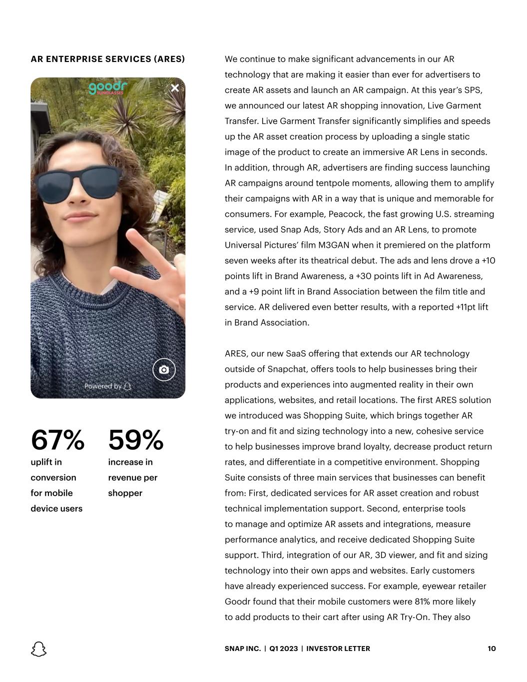 AR ENTERPRISE SERVICES (ARES) 67% uplift in conversion for mobile device users 59% increase in revenue per shopper 10SNAP INC. | Q1 2023 | INVESTOR LETTER We continue to make significant advancements in our AR technology that are making it easier than ever for advertisers to create AR assets and launch an AR campaign. At this year’s SPS, we announced our latest AR shopping innovation, Live Garment Transfer. Live Garment Transfer significantly simplifies and speeds up the AR asset creation process by uploading a single static image of the product to create an immersive AR Lens in seconds. In addition, through AR, advertisers are finding success launching AR campaigns around tentpole moments, allowing them to amplify their campaigns with AR in a way that is unique and memorable for consumers. For example, Peacock, the fast growing U.S. streaming service, used Snap Ads, Story Ads and an AR Lens, to promote Universal Pictures’ film M3GAN when it premiered on the platform seven weeks after its theatrical debut. The ads and lens drove a +10 points lift in Brand Awareness, a +30 points lift in Ad Awareness, and a +9 point lift in Brand Association between the film title and service. AR delivered even better results, with a reported +11pt lift in Brand Association. ARES, our new SaaS offering that extends our AR technology outside of Snapchat, offers tools to help businesses bring their products and experiences into augmented reality in their own applications, websites, and retail locations. The first ARES solution we introduced was Shopping Suite, which brings together AR try-on and fit and sizing technology into a new, cohesive service to help businesses improve brand loyalty, decrease product return rates, and differentiate in a competitive environment. Shopping Suite consists of three main services that businesses can benefit from: First, dedicated services for AR asset creation and robust technical implementation support. Second, enterprise tools to manage and optimize AR assets and integrations, measure performance analytics, and receive dedicated Shopping Suite support. Third, integration of our AR, 3D viewer, and fit and sizing technology into their own apps and websites. Early customers have already experienced success. For example, eyewear retailer Goodr found that their mobile customers were 81% more likely to add products to their cart after using AR Try-On. They also
