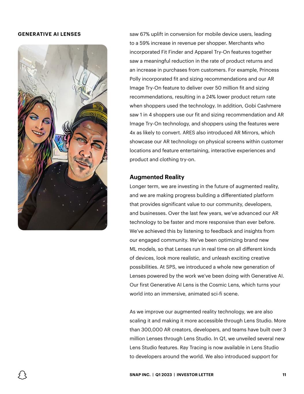GENERATIVE AI LENSES 11SNAP INC. | Q1 2023 | INVESTOR LETTER saw 67% uplift in conversion for mobile device users, leading to a 59% increase in revenue per shopper. Merchants who incorporated Fit Finder and Apparel Try-On features together saw a meaningful reduction in the rate of product returns and an increase in purchases from customers. For example, Princess Polly incorporated fit and sizing recommendations and our AR Image Try-On feature to deliver over 50 million fit and sizing recommendations, resulting in a 24% lower product return rate when shoppers used the technology. In addition, Gobi Cashmere saw 1 in 4 shoppers use our fit and sizing recommendation and AR Image Try-On technology, and shoppers using the features were 4x as likely to convert. ARES also introduced AR Mirrors, which showcase our AR technology on physical screens within customer locations and feature entertaining, interactive experiences and product and clothing try-on. Augmented Reality Longer term, we are investing in the future of augmented reality, and we are making progress building a differentiated platform that provides significant value to our community, developers, and businesses. Over the last few years, we’ve advanced our AR technology to be faster and more responsive than ever before. We’ve achieved this by listening to feedback and insights from our engaged community. We’ve been optimizing brand new ML models, so that Lenses run in real time on all different kinds of devices, look more realistic, and unleash exciting creative possibilities. At SPS, we introduced a whole new generation of Lenses powered by the work we’ve been doing with Generative AI. Our first Generative AI Lens is the Cosmic Lens, which turns your world into an immersive, animated sci-fi scene. As we improve our augmented reality technology, we are also scaling it and making it more accessible through Lens Studio. More than 300,000 AR creators, developers, and teams have built over 3 million Lenses through Lens Studio. In Q1, we unveiled several new Lens Studio features. Ray Tracing is now available in Lens Studio to developers around the world. We also introduced support for