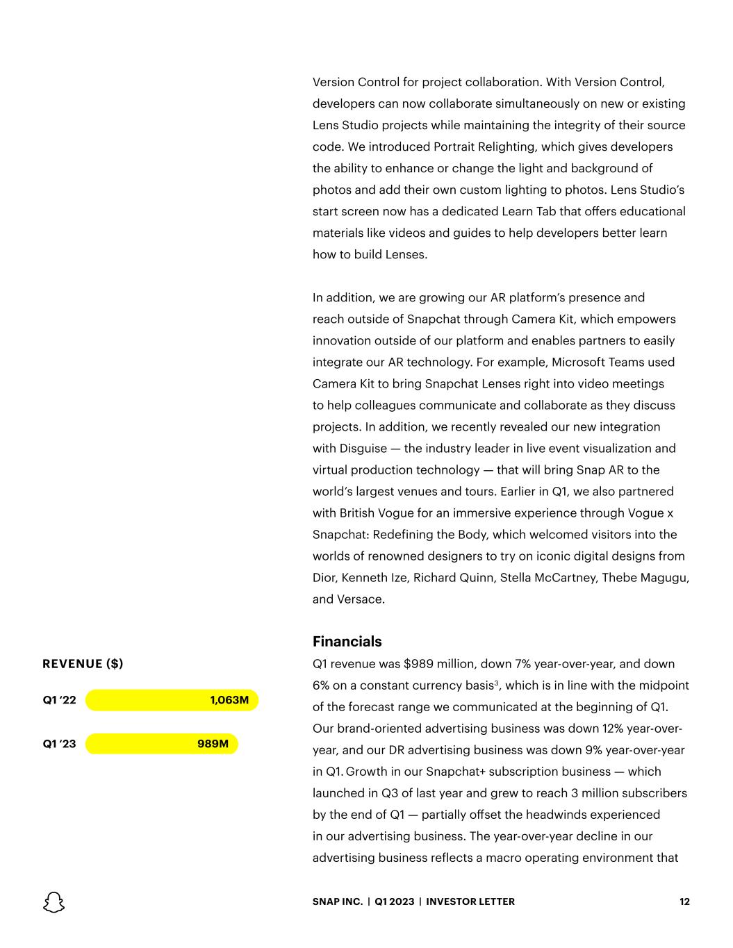 REVENUE ($) Q1 ‘22 1,063M Q1 ‘23 989M 12SNAP INC. | Q1 2023 | INVESTOR LETTER Version Control for project collaboration. With Version Control, developers can now collaborate simultaneously on new or existing Lens Studio projects while maintaining the integrity of their source code. We introduced Portrait Relighting, which gives developers the ability to enhance or change the light and background of photos and add their own custom lighting to photos. Lens Studio’s start screen now has a dedicated Learn Tab that offers educational materials like videos and guides to help developers better learn how to build Lenses. In addition, we are growing our AR platform’s presence and reach outside of Snapchat through Camera Kit, which empowers innovation outside of our platform and enables partners to easily integrate our AR technology. For example, Microsoft Teams used Camera Kit to bring Snapchat Lenses right into video meetings to help colleagues communicate and collaborate as they discuss projects. In addition, we recently revealed our new integration with Disguise — the industry leader in live event visualization and virtual production technology — that will bring Snap AR to the world’s largest venues and tours. Earlier in Q1, we also partnered with British Vogue for an immersive experience through Vogue x Snapchat: Redefining the Body, which welcomed visitors into the worlds of renowned designers to try on iconic digital designs from Dior, Kenneth Ize, Richard Quinn, Stella McCartney, Thebe Magugu, and Versace. Financials Q1 revenue was $989 million, down 7% year-over-year, and down 6% on a constant currency basis3, which is in line with the midpoint of the forecast range we communicated at the beginning of Q1. Our brand-oriented advertising business was down 12% year-over- year, and our DR advertising business was down 9% year-over-year in Q1. Growth in our Snapchat+ subscription business — which launched in Q3 of last year and grew to reach 3 million subscribers by the end of Q1 — partially offset the headwinds experienced in our advertising business. The year-over-year decline in our advertising business reflects a macro operating environment that