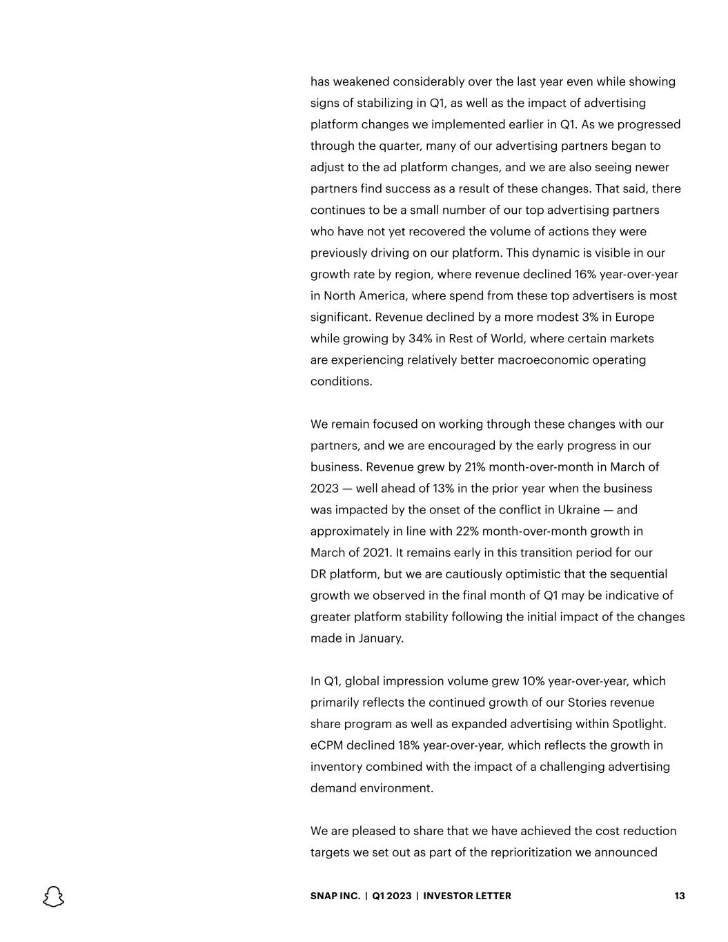 13SNAP INC. | Q1 2023 | INVESTOR LETTER has weakened considerably over the last year even while showing signs of stabilizing in Q1, as well as the impact of advertising platform changes we implemented earlier in Q1. As we progressed through the quarter, many of our advertising partners began to adjust to the ad platform changes, and we are also seeing newer partners find success as a result of these changes. That said, there continues to be a small number of our top advertising partners who have not yet recovered the volume of actions they were previously driving on our platform. This dynamic is visible in our growth rate by region, where revenue declined 16% year-over-year in North America, where spend from these top advertisers is most significant. Revenue declined by a more modest 3% in Europe while growing by 34% in Rest of World, where certain markets are experiencing relatively better macroeconomic operating conditions. We remain focused on working through these changes with our partners, and we are encouraged by the early progress in our business. Revenue grew by 21% month-over-month in March of 2023 — well ahead of 13% in the prior year when the business was impacted by the onset of the conflict in Ukraine — and approximately in line with 22% month-over-month growth in March of 2021. It remains early in this transition period for our DR platform, but we are cautiously optimistic that the sequential growth we observed in the final month of Q1 may be indicative of greater platform stability following the initial impact of the changes made in January. In Q1, global impression volume grew 10% year-over-year, which primarily reflects the continued growth of our Stories revenue share program as well as expanded advertising within Spotlight. eCPM declined 18% year-over-year, which reflects the growth in inventory combined with the impact of a challenging advertising demand environment. We are pleased to share that we have achieved the cost reduction targets we set out as part of the reprioritization we announced