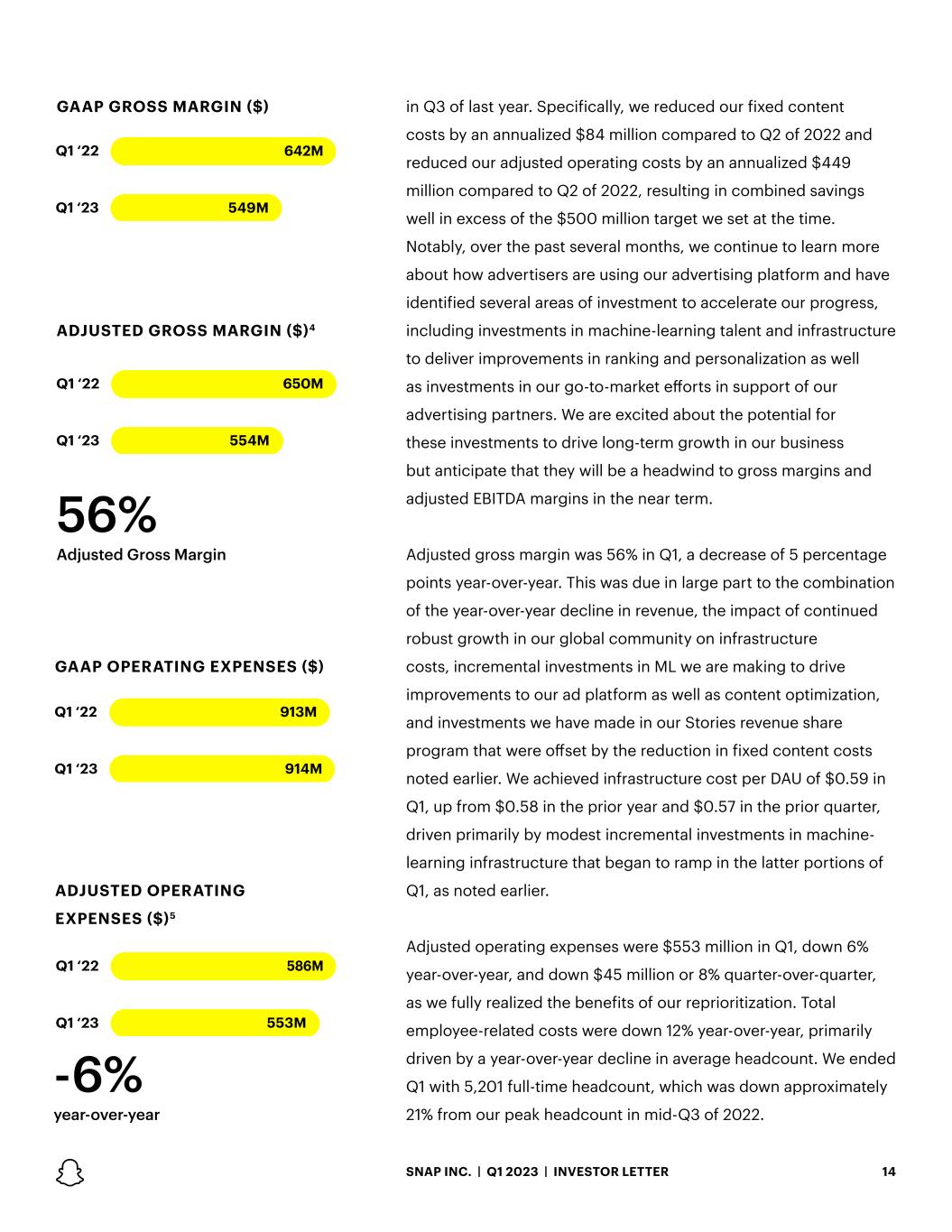 GAAP GROSS MARGIN ($) Q1 ‘22 642M Q1 ‘23 549M ADJUSTED GROSS MARGIN ($)4 56% Adjusted Gross Margin Q1 ‘22 650M Q1 ‘23 554M ADJUSTED OPERATING EXPENSES ($)5 Q1 ‘22 586M Q1 ‘23 553M GAAP OPERATING EXPENSES ($) Q1 ‘22 913M Q1 ‘23 914M -6% year-over-year 14SNAP INC. | Q1 2023 | INVESTOR LETTER in Q3 of last year. Specifically, we reduced our fixed content costs by an annualized $84 million compared to Q2 of 2022 and reduced our adjusted operating costs by an annualized $449 million compared to Q2 of 2022, resulting in combined savings well in excess of the $500 million target we set at the time. Notably, over the past several months, we continue to learn more about how advertisers are using our advertising platform and have identified several areas of investment to accelerate our progress, including investments in machine-learning talent and infrastructure to deliver improvements in ranking and personalization as well as investments in our go-to-market efforts in support of our advertising partners. We are excited about the potential for these investments to drive long-term growth in our business but anticipate that they will be a headwind to gross margins and adjusted EBITDA margins in the near term. Adjusted gross margin was 56% in Q1, a decrease of 5 percentage points year-over-year. This was due in large part to the combination of the year-over-year decline in revenue, the impact of continued robust growth in our global community on infrastructure costs, incremental investments in ML we are making to drive improvements to our ad platform as well as content optimization, and investments we have made in our Stories revenue share program that were offset by the reduction in fixed content costs noted earlier. We achieved infrastructure cost per DAU of $0.59 in Q1, up from $0.58 in the prior year and $0.57 in the prior quarter, driven primarily by modest incremental investments in machine- learning infrastructure that began to ramp in the latter portions of Q1, as noted earlier. Adjusted operating expenses were $553 million in Q1, down 6% year-over-year, and down $45 million or 8% quarter-over-quarter, as we fully realized the benefits of our reprioritization. Total employee-related costs were down 12% year-over-year, primarily driven by a year-over-year decline in average headcount. We ended Q1 with 5,201 full-time headcount, which was down approximately 21% from our peak headcount in mid-Q3 of 2022.