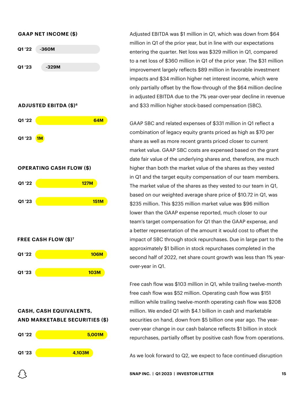 ADJUSTED EBITDA ($)6 Q1 ‘22 64M Q1 ‘23 1M GAAP NET INCOME ($) Q1 ‘22 Q1 ‘23 -329M -360M FREE CASH FLOW ($)7 Q1 ‘22 106M Q1 ‘23 103M OPERATING CASH FLOW ($) Q1 ‘22 127M Q1 ‘23 151M CASH, CASH EQUIVALENTS, AND MARKETABLE SECURITIES ($) Q1 ‘22 5,001M Q1 ‘23 4,103M 15SNAP INC. | Q1 2023 | INVESTOR LETTER Adjusted EBITDA was $1 million in Q1, which was down from $64 million in Q1 of the prior year, but in line with our expectations entering the quarter. Net loss was $329 million in Q1, compared to a net loss of $360 million in Q1 of the prior year. The $31 million improvement largely reflects $89 million in favorable investment impacts and $34 million higher net interest income, which were only partially offset by the flow-through of the $64 million decline in adjusted EBITDA due to the 7% year-over-year decline in revenue and $33 million higher stock-based compensation (SBC). GAAP SBC and related expenses of $331 million in Q1 reflect a combination of legacy equity grants priced as high as $70 per share as well as more recent grants priced closer to current market value. GAAP SBC costs are expensed based on the grant date fair value of the underlying shares and, therefore, are much higher than both the market value of the shares as they vested in Q1 and the target equity compensation of our team members. The market value of the shares as they vested to our team in Q1, based on our weighted average share price of $10.72 in Q1, was $235 million. This $235 million market value was $96 million lower than the GAAP expense reported, much closer to our team’s target compensation for Q1 than the GAAP expense, and a better representation of the amount it would cost to offset the impact of SBC through stock repurchases. Due in large part to the approximately $1 billion in stock repurchases completed in the second half of 2022, net share count growth was less than 1% year- over-year in Q1. Free cash flow was $103 million in Q1, while trailing twelve-month free cash flow was $52 million. Operating cash flow was $151 million while trailing twelve-month operating cash flow was $208 million. We ended Q1 with $4.1 billion in cash and marketable securities on hand, down from $5 billion one year ago. The year- over-year change in our cash balance reflects $1 billion in stock repurchases, partially offset by positive cash flow from operations. As we look forward to Q2, we expect to face continued disruption
