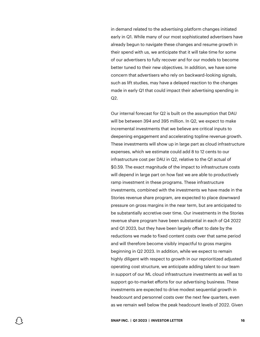 16SNAP INC. | Q1 2023 | INVESTOR LETTER in demand related to the advertising platform changes initiated early in Q1. While many of our most sophisticated advertisers have already begun to navigate these changes and resume growth in their spend with us, we anticipate that it will take time for some of our advertisers to fully recover and for our models to become better tuned to their new objectives. In addition, we have some concern that advertisers who rely on backward-looking signals, such as lift studies, may have a delayed reaction to the changes made in early Q1 that could impact their advertising spending in Q2. Our internal forecast for Q2 is built on the assumption that DAU will be between 394 and 395 million. In Q2, we expect to make incremental investments that we believe are critical inputs to deepening engagement and accelerating topline revenue growth. These investments will show up in large part as cloud infrastructure expenses, which we estimate could add 8 to 12 cents to our infrastructure cost per DAU in Q2, relative to the Q1 actual of $0.59. The exact magnitude of the impact to infrastructure costs will depend in large part on how fast we are able to productively ramp investment in these programs. These infrastructure investments, combined with the investments we have made in the Stories revenue share program, are expected to place downward pressure on gross margins in the near term, but are anticipated to be substantially accretive over time. Our investments in the Stories revenue share program have been substantial in each of Q4 2022 and Q1 2023, but they have been largely offset to date by the reductions we made to fixed content costs over that same period and will therefore become visibly impactful to gross margins beginning in Q2 2023. In addition, while we expect to remain highly diligent with respect to growth in our reprioritized adjusted operating cost structure, we anticipate adding talent to our team in support of our ML cloud infrastructure investments as well as to support go-to-market efforts for our advertising business. These investments are expected to drive modest sequential growth in headcount and personnel costs over the next few quarters, even as we remain well below the peak headcount levels of 2022. Given