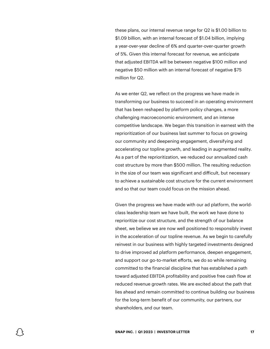 17SNAP INC. | Q1 2023 | INVESTOR LETTER these plans, our internal revenue range for Q2 is $1.00 billion to $1.09 billion, with an internal forecast of $1.04 billion, implying a year-over-year decline of 6% and quarter-over-quarter growth of 5%. Given this internal forecast for revenue, we anticipate that adjusted EBITDA will be between negative $100 million and negative $50 million with an internal forecast of negative $75 million for Q2. As we enter Q2, we reflect on the progress we have made in transforming our business to succeed in an operating environment that has been reshaped by platform policy changes, a more challenging macroeconomic environment, and an intense competitive landscape. We began this transition in earnest with the reprioritization of our business last summer to focus on growing our community and deepening engagement, diversifying and accelerating our topline growth, and leading in augmented reality. As a part of the reprioritization, we reduced our annualized cash cost structure by more than $500 million. The resulting reduction in the size of our team was significant and difficult, but necessary to achieve a sustainable cost structure for the current environment and so that our team could focus on the mission ahead. Given the progress we have made with our ad platform, the world- class leadership team we have built, the work we have done to reprioritize our cost structure, and the strength of our balance sheet, we believe we are now well positioned to responsibly invest in the acceleration of our topline revenue. As we begin to carefully reinvest in our business with highly targeted investments designed to drive improved ad platform performance, deepen engagement, and support our go-to-market efforts, we do so while remaining committed to the financial discipline that has established a path toward adjusted EBITDA profitability and positive free cash flow at reduced revenue growth rates. We are excited about the path that lies ahead and remain committed to continue building our business for the long-term benefit of our community, our partners, our shareholders, and our team.