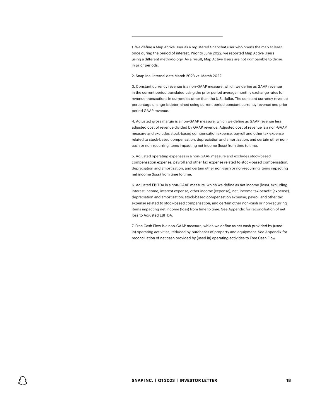 18SNAP INC. | Q1 2023 | INVESTOR LETTER 1. We define a Map Active User as a registered Snapchat user who opens the map at least once during the period of interest. Prior to June 2022, we reported Map Active Users using a different methodology. As a result, Map Active Users are not comparable to those in prior periods. 2. Snap Inc. internal data March 2023 vs. March 2022. 3. Constant currency revenue is a non-GAAP measure, which we define as GAAP revenue in the current period translated using the prior period average monthly exchange rates for revenue transactions in currencies other than the U.S. dollar. The constant currency revenue percentage change is determined using current period constant currency revenue and prior period GAAP revenue. 4. Adjusted gross margin is a non-GAAP measure, which we define as GAAP revenue less adjusted cost of revenue divided by GAAP revenue. Adjusted cost of revenue is a non-GAAP measure and excludes stock-based compensation expense, payroll and other tax expense related to stock-based compensation, depreciation and amortization, and certain other non- cash or non-recurring items impacting net income (loss) from time to time. 5. Adjusted operating expenses is a non-GAAP measure and excludes stock-based compensation expense, payroll and other tax expense related to stock-based compensation, depreciation and amortization, and certain other non-cash or non-recurring items impacting net income (loss) from time to time. 6. Adjusted EBITDA is a non-GAAP measure, which we define as net income (loss), excluding interest income; interest expense; other income (expense), net; income tax benefit (expense); depreciation and amortization; stock-based compensation expense; payroll and other tax expense related to stock-based compensation; and certain other non-cash or non-recurring items impacting net income (loss) from time to time. See Appendix for reconciliation of net loss to Adjusted EBITDA. 7. Free Cash Flow is a non-GAAP measure, which we define as net cash provided by (used in) operating activities, reduced by purchases of property and equipment. See Appendix for reconciliation of net cash provided by (used in) operating activities to Free Cash Flow.
