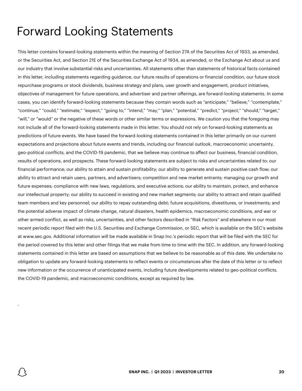 20SNAP INC. | Q1 2023 | INVESTOR LETTER This letter contains forward-looking statements within the meaning of Section 27A of the Securities Act of 1933, as amended, or the Securities Act, and Section 21E of the Securities Exchange Act of 1934, as amended, or the Exchange Act about us and our industry that involve substantial risks and uncertainties. All statements other than statements of historical facts contained in this letter, including statements regarding guidance, our future results of operations or financial condition, our future stock repurchase programs or stock dividends, business strategy and plans, user growth and engagement, product initiatives, objectives of management for future operations, and advertiser and partner offerings, are forward-looking statements. In some cases, you can identify forward-looking statements because they contain words such as “anticipate,” “believe,” “contemplate,” “continue,” “could,” “estimate,” “expect,” “going to,” “intend,” “may,” “plan,” “potential,” “predict,” “project,” “should,” “target,” “will,” or “would” or the negative of these words or other similar terms or expressions. We caution you that the foregoing may not include all of the forward-looking statements made in this letter. You should not rely on forward-looking statements as predictions of future events. We have based the forward-looking statements contained in this letter primarily on our current expectations and projections about future events and trends, including our financial outlook, macroeconomic uncertainty, geo-political conflicts, and the COVID-19 pandemic, that we believe may continue to affect our business, financial condition, results of operations, and prospects. These forward-looking statements are subject to risks and uncertainties related to: our financial performance; our ability to attain and sustain profitability; our ability to generate and sustain positive cash flow; our ability to attract and retain users, partners, and advertisers; competition and new market entrants; managing our growth and future expenses; compliance with new laws, regulations, and executive actions; our ability to maintain, protect, and enhance our intellectual property; our ability to succeed in existing and new market segments; our ability to attract and retain qualified team members and key personnel; our ability to repay outstanding debt; future acquisitions, divestitures, or investments; and the potential adverse impact of climate change, natural disasters, health epidemics, macroeconomic conditions, and war or other armed conflict, as well as risks, uncertainties, and other factors described in “Risk Factors” and elsewhere in our most recent periodic report filed with the U.S. Securities and Exchange Commission, or SEC, which is available on the SEC’s website at www.sec.gov. Additional information will be made available in Snap Inc.’s periodic report that will be filed with the SEC for the period covered by this letter and other filings that we make from time to time with the SEC. In addition, any forward-looking statements contained in this letter are based on assumptions that we believe to be reasonable as of this date. We undertake no obligation to update any forward-looking statements to reflect events or circumstances after the date of this letter or to reflect new information or the occurrence of unanticipated events, including future developments related to geo-political conflicts, the COVID-19 pandemic, and macroeconomic conditions, except as required by law. . Forward Looking Statements