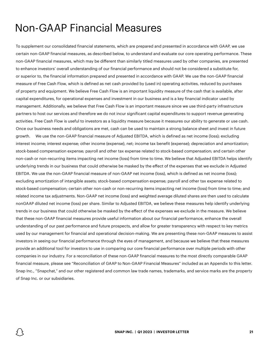21SNAP INC. | Q1 2023 | INVESTOR LETTER To supplement our consolidated financial statements, which are prepared and presented in accordance with GAAP, we use certain non-GAAP financial measures, as described below, to understand and evaluate our core operating performance. These non-GAAP financial measures, which may be different than similarly titled measures used by other companies, are presented to enhance investors’ overall understanding of our financial performance and should not be considered a substitute for, or superior to, the financial information prepared and presented in accordance with GAAP. We use the non-GAAP financial measure of Free Cash Flow, which is defined as net cash provided by (used in) operating activities, reduced by purchases of property and equipment. We believe Free Cash Flow is an important liquidity measure of the cash that is available, after capital expenditures, for operational expenses and investment in our business and is a key financial indicator used by management. Additionally, we believe that Free Cash Flow is an important measure since we use third-party infrastructure partners to host our services and therefore we do not incur significant capital expenditures to support revenue generating activities. Free Cash Flow is useful to investors as a liquidity measure because it measures our ability to generate or use cash. Once our business needs and obligations are met, cash can be used to maintain a strong balance sheet and invest in future growth. We use the non-GAAP financial measure of Adjusted EBITDA, which is defined as net income (loss); excluding interest income; interest expense; other income (expense), net; income tax benefit (expense); depreciation and amortization; stock-based compensation expense; payroll and other tax expense related to stock-based compensation; and certain other non-cash or non-recurring items impacting net income (loss) from time to time. We believe that Adjusted EBITDA helps identify underlying trends in our business that could otherwise be masked by the effect of the expenses that we exclude in Adjusted EBITDA. We use the non-GAAP financial measure of non-GAAP net income (loss), which is defined as net income (loss); excluding amortization of intangible assets; stock-based compensation expense; payroll and other tax expense related to stock-based compensation; certain other non-cash or non-recurring items impacting net income (loss) from time to time; and related income tax adjustments. Non-GAAP net income (loss) and weighted average diluted shares are then used to calculate nonGAAP diluted net income (loss) per share. Similar to Adjusted EBITDA, we believe these measures help identify underlying trends in our business that could otherwise be masked by the effect of the expenses we exclude in the measure. We believe that these non-GAAP financial measures provide useful information about our financial performance, enhance the overall understanding of our past performance and future prospects, and allow for greater transparency with respect to key metrics used by our management for financial and operational decision-making. We are presenting these non-GAAP measures to assist investors in seeing our financial performance through the eyes of management, and because we believe that these measures provide an additional tool for investors to use in comparing our core financial performance over multiple periods with other companies in our industry. For a reconciliation of these non-GAAP financial measures to the most directly comparable GAAP financial measure, please see “Reconciliation of GAAP to Non-GAAP Financial Measures” included as an Appendix to this letter. Snap Inc., “Snapchat,” and our other registered and common law trade names, trademarks, and service marks are the property of Snap Inc. or our subsidiaries. Non-GAAP Financial Measures