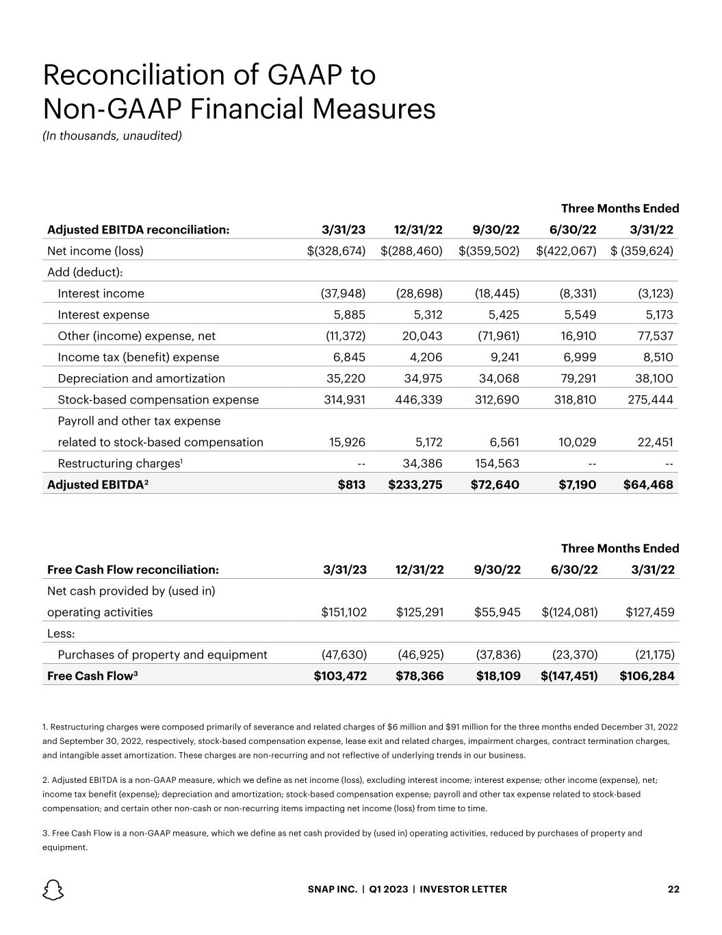 22SNAP INC. | Q1 2023 | INVESTOR LETTER Three Months Ended Adjusted EBITDA reconciliation: 3/31/23 12/31/22 9/30/22 6/30/22 3/31/22 Net income (loss) $(328,674) $(288,460) $(359,502) $(422,067) $ (359,624) Add (deduct): Interest income (37,948) (28,698) (18,445) (8,331) (3,123) Interest expense 5,885 5,312 5,425 5,549 5,173 Other (income) expense, net (11,372) 20,043 (71,961) 16,910 77,537 Income tax (benefit) expense 6,845 4,206 9,241 6,999 8,510 Depreciation and amortization 35,220 34,975 34,068 79,291 38,100 Stock-based compensation expense 314,931 446,339 312,690 318,810 275,444 Payroll and other tax expense related to stock-based compensation 15,926 5,172 6,561 10,029 22,451 Restructuring charges1 -- 34,386 154,563 -- -- Adjusted EBITDA2 $813 $233,275 $72,640 $7,190 $64,468 Three Months Ended Free Cash Flow reconciliation: 3/31/23 12/31/22 9/30/22 6/30/22 3/31/22 Net cash provided by (used in) operating activities $151,102 $125,291 $55,945 $(124,081) $127,459 Less: Purchases of property and equipment (47,630) (46,925) (37,836) (23,370) (21,175) Free Cash Flow3 $103,472 $78,366 $18,109 $(147,451) $106,284 Reconciliation of GAAP to Non-GAAP Financial Measures (In thousands, unaudited) 1. Restructuring charges were composed primarily of severance and related charges of $6 million and $91 million for the three months ended December 31, 2022 and September 30, 2022, respectively, stock-based compensation expense, lease exit and related charges, impairment charges, contract termination charges, and intangible asset amortization. These charges are non-recurring and not reflective of underlying trends in our business. 2. Adjusted EBITDA is a non-GAAP measure, which we define as net income (loss), excluding interest income; interest expense; other income (expense), net; income tax benefit (expense); depreciation and amortization; stock-based compensation expense; payroll and other tax expense related to stock-based compensation; and certain other non-cash or non-recurring items impacting net income (loss) from time to time. 3. Free Cash Flow is a non-GAAP measure, which we define as net cash provided by (used in) operating activities, reduced by purchases of property and equipment.