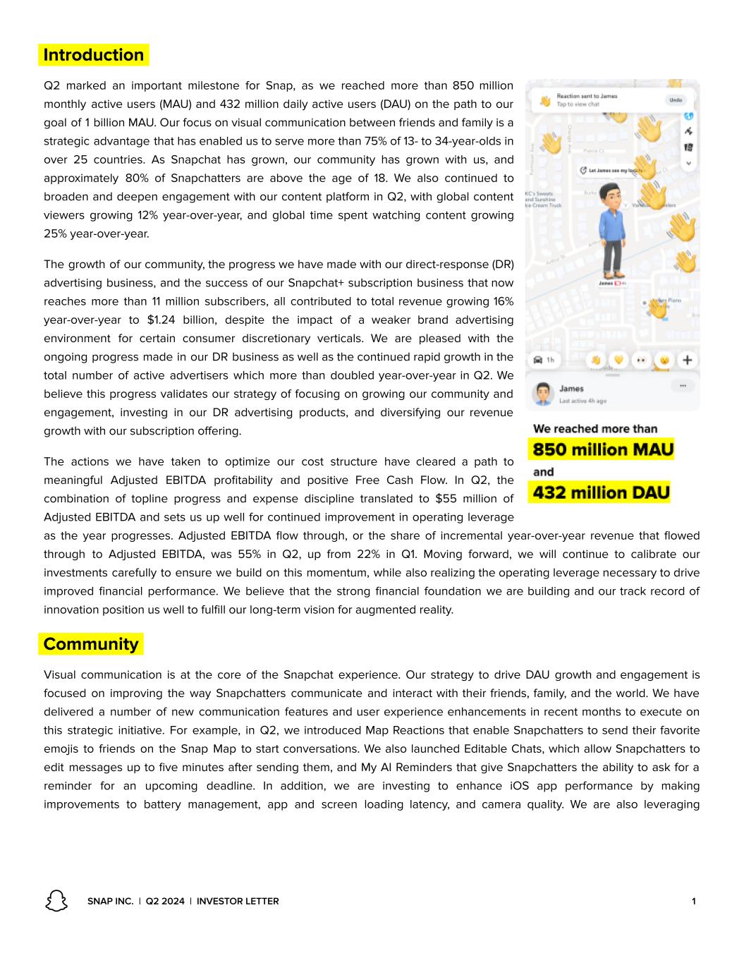 Introduction  Q2 marked an important milestone for Snap, as we reached more than 850 million monthly active users (MAU) and 432 million daily active users (DAU) on the path to our goal of 1 billion MAU. Our focus on visual communication between friends and family is a strategic advantage that has enabled us to serve more than 75% of 13- to 34-year-olds in over 25 countries. As Snapchat has grown, our community has grown with us, and approximately 80% of Snapchatters are above the age of 18. We also continued to broaden and deepen engagement with our content platform in Q2, with global content viewers growing 12% year-over-year, and global time spent watching content growing 25% year-over-year. The growth of our community, the progress we have made with our direct-response (DR) advertising business, and the success of our Snapchat+ subscription business that now reaches more than 11 million subscribers, all contributed to total revenue growing 16% year-over-year to $1.24 billion, despite the impact of a weaker brand advertising environment for certain consumer discretionary verticals. We are pleased with the ongoing progress made in our DR business as well as the continued rapid growth in the total number of active advertisers which more than doubled year-over-year in Q2. We believe this progress validates our strategy of focusing on growing our community and engagement, investing in our DR advertising products, and diversifying our revenue growth with our subscription offering. The actions we have taken to optimize our cost structure have cleared a path to meaningful Adjusted EBITDA profitability and positive Free Cash Flow. In Q2, the combination of topline progress and expense discipline translated to $55 million of Adjusted EBITDA and sets us up well for continued improvement in operating leverage as the year progresses. Adjusted EBITDA flow through, or the share of incremental year-over-year revenue that flowed through to Adjusted EBITDA, was 55% in Q2, up from 22% in Q1. Moving forward, we will continue to calibrate our investments carefully to ensure we build on this momentum, while also realizing the operating leverage necessary to drive improved financial performance. We believe that the strong financial foundation we are building and our track record of innovation position us well to fulfill our long-term vision for augmented reality.  Community  Visual communication is at the core of the Snapchat experience. Our strategy to drive DAU growth and engagement is focused on improving the way Snapchatters communicate and interact with their friends, family, and the world. We have delivered a number of new communication features and user experience enhancements in recent months to execute on this strategic initiative. For example, in Q2, we introduced Map Reactions that enable Snapchatters to send their favorite emojis to friends on the Snap Map to start conversations. We also launched Editable Chats, which allow Snapchatters to edit messages up to five minutes after sending them, and My AI Reminders that give Snapchatters the ability to ask for a reminder for an upcoming deadline. In addition, we are investing to enhance iOS app performance by making improvements to battery management, app and screen loading latency, and camera quality. We are also leveraging SNAP INC. | Q2 2024 | INVESTOR LETTER 1